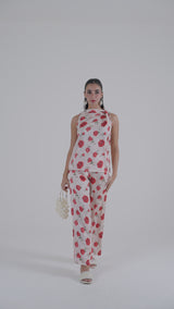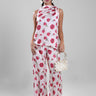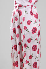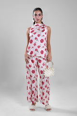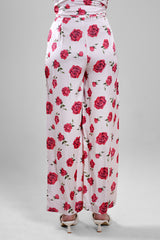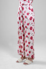 بنطلون بقصة واسعة مزين بنقشة موردة كاملة وانسيابية ناعمة. يتميز بتصميم مريح وحركة خفيفة مع مظهر أنيق يناسب الإطلالات اليومية الراقية أو المناسبات الكاجوال الأنيقة.