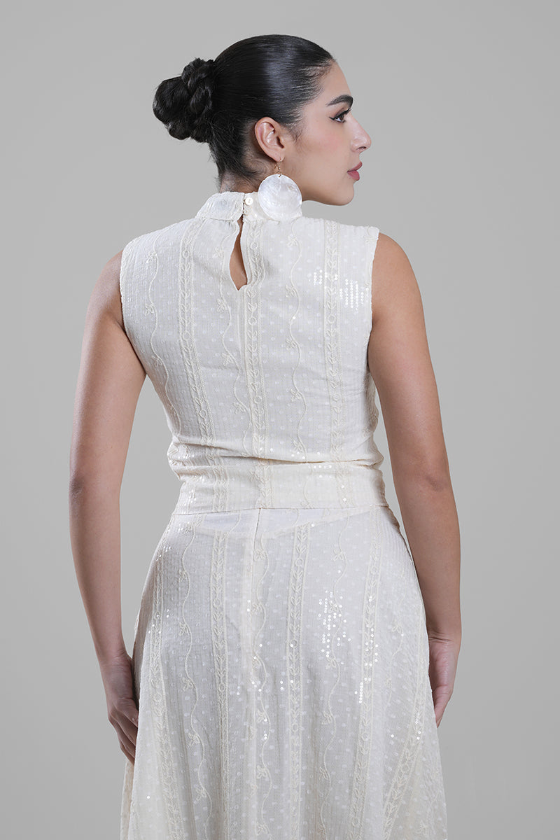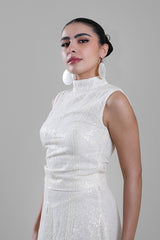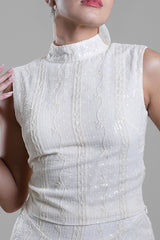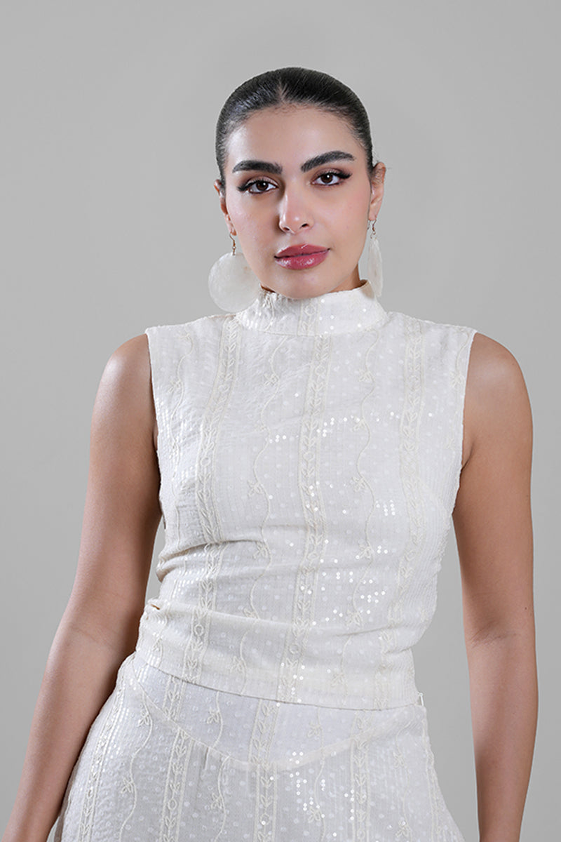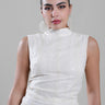 توب بدون أكمام بتصميم أنيق يتميز برقبة عالية وتفاصيل نسيجية دقيقة موزعة على القماش. يأتي بقصة منظمة تمنح مظهراً راقياً مع لمسة فاخرة خفيفة. مناسب للإطلالات الرسمية أو التنسيقات اليومية الأنيقة، ويمكن ارتداؤه مع تنورة أو بنطلون.