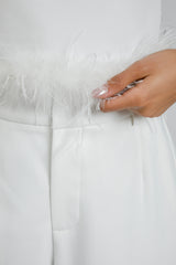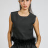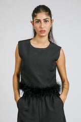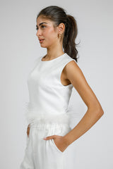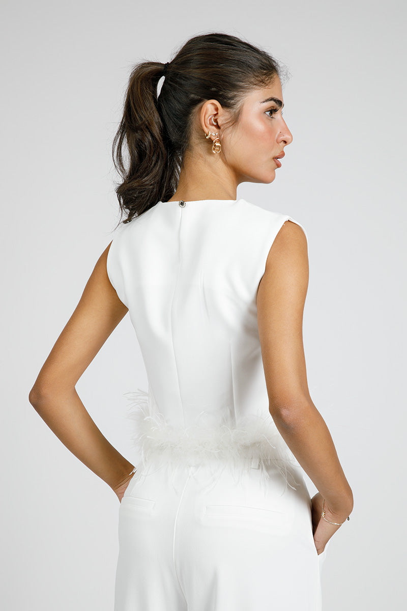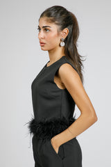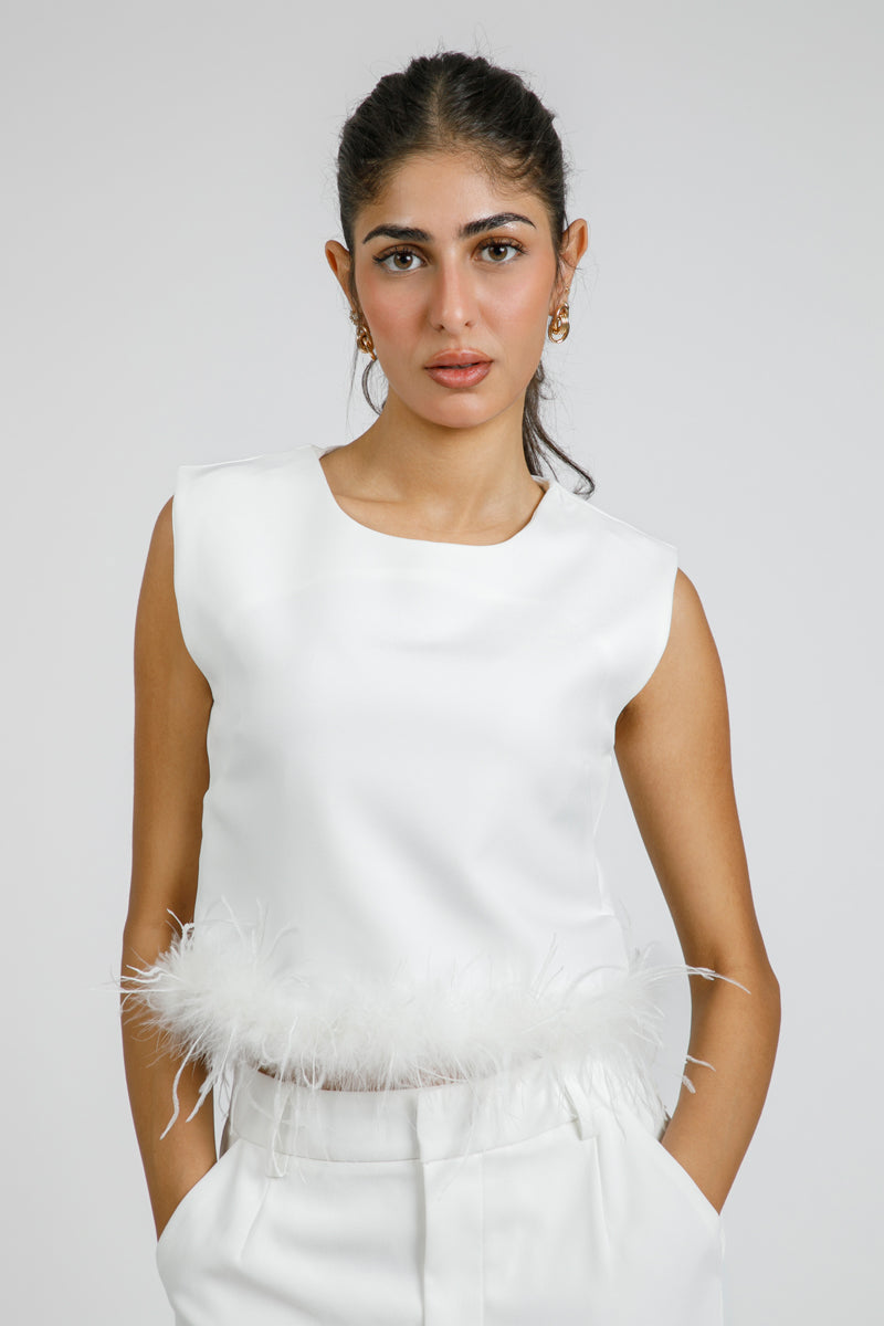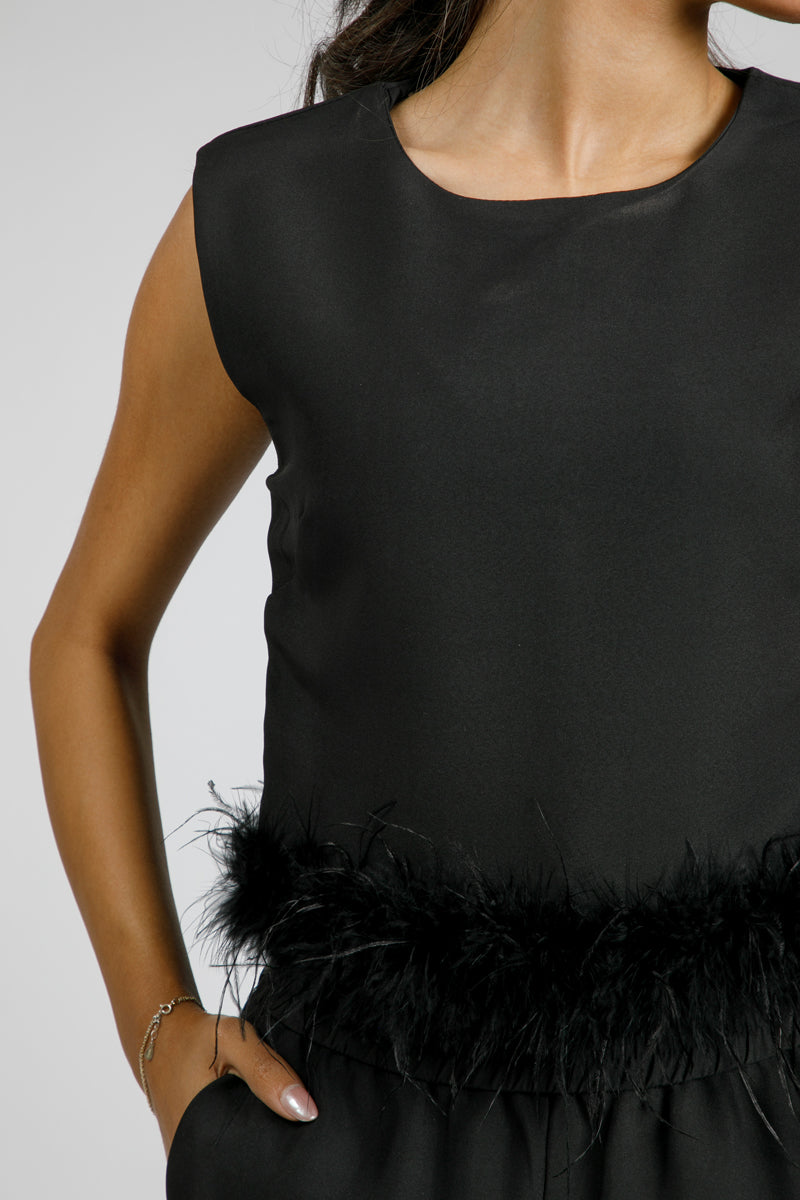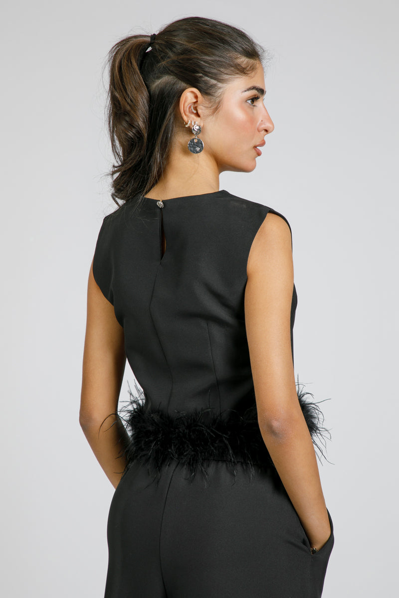 بلوزة بدون أكمام بقصّة منظمة وياقة دائرية تمنح مظهراً أنيقاً وبسيطاً. مزينة بتفاصيل ريش عند الخصر تضيف لمسة فاخرة وجذابة. مزودة بإغلاق خلفي بزر لإطلالة مرتبة، وتناسب التنسيق مع البنطلون أو التنورة للمناسبات والإطلالات المسائية.