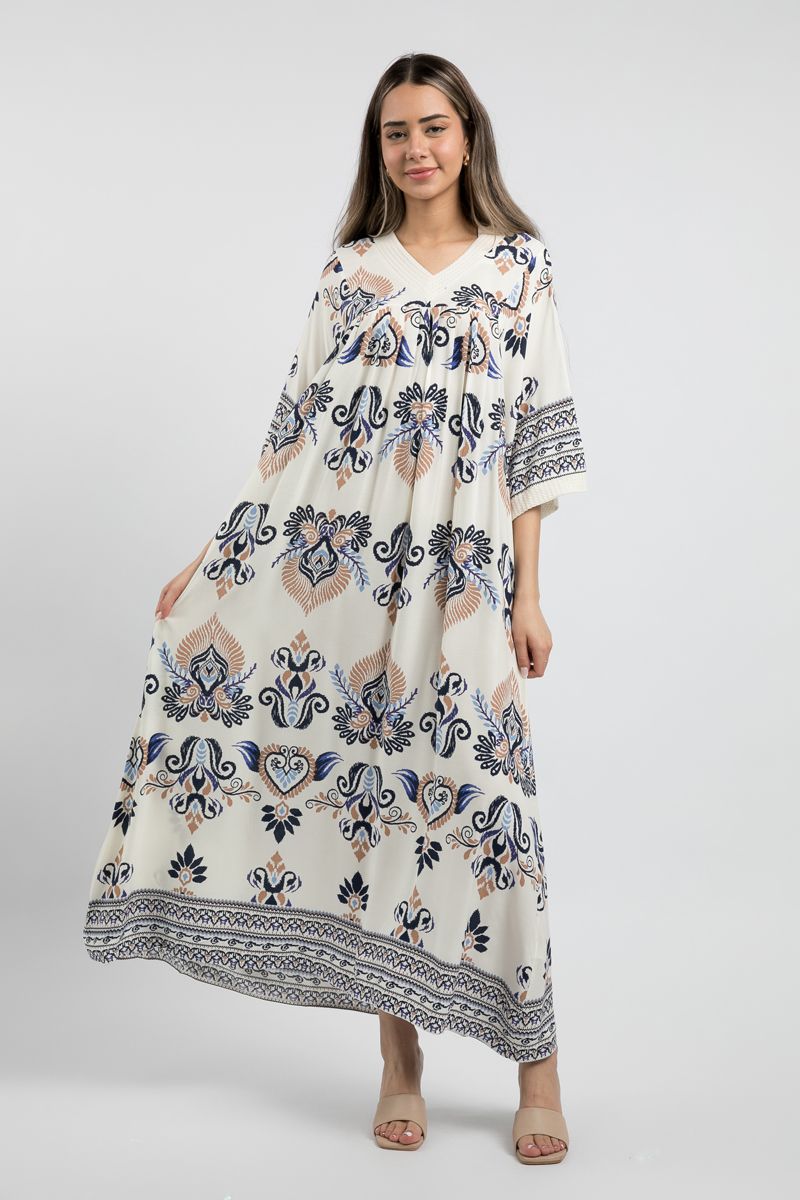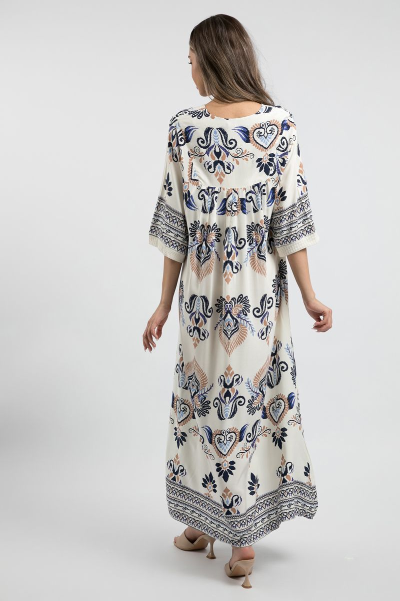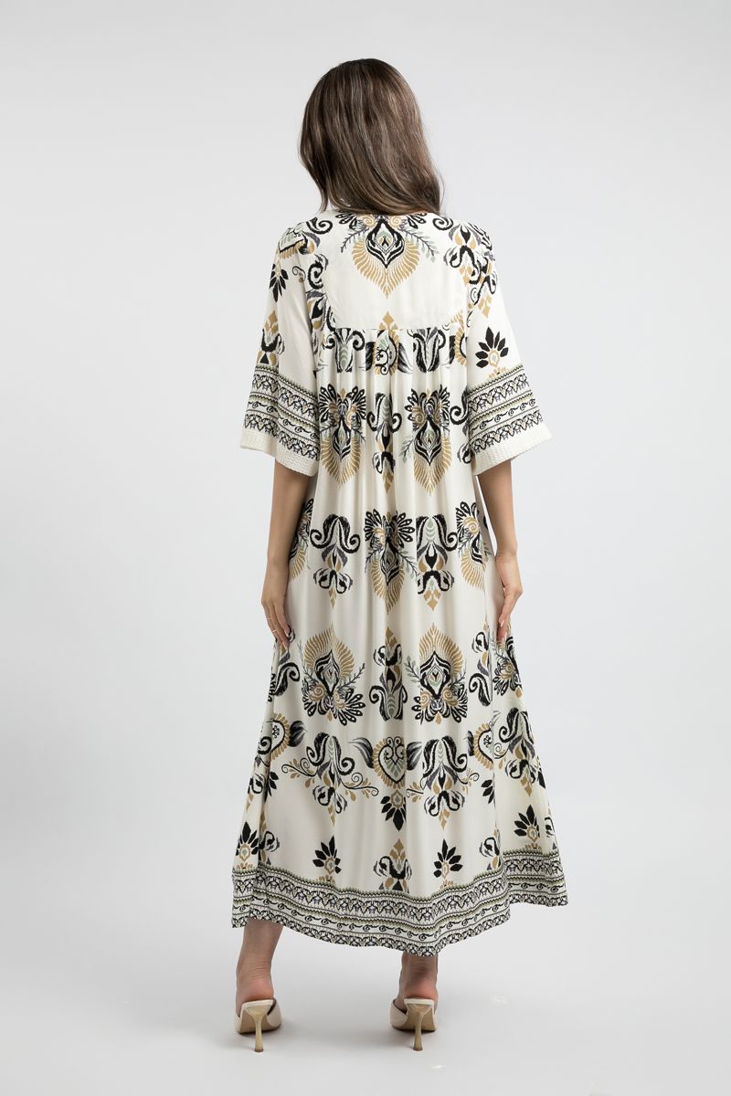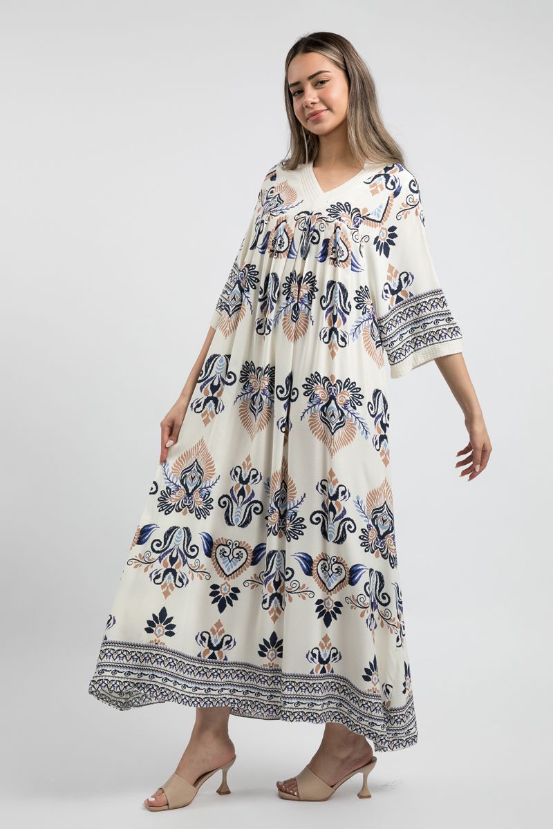 Featuring three-quarter sleeves and a flattering V-shaped neckline, this dress exudes elegance while keeping you cool and comfortable on the hottest summer days