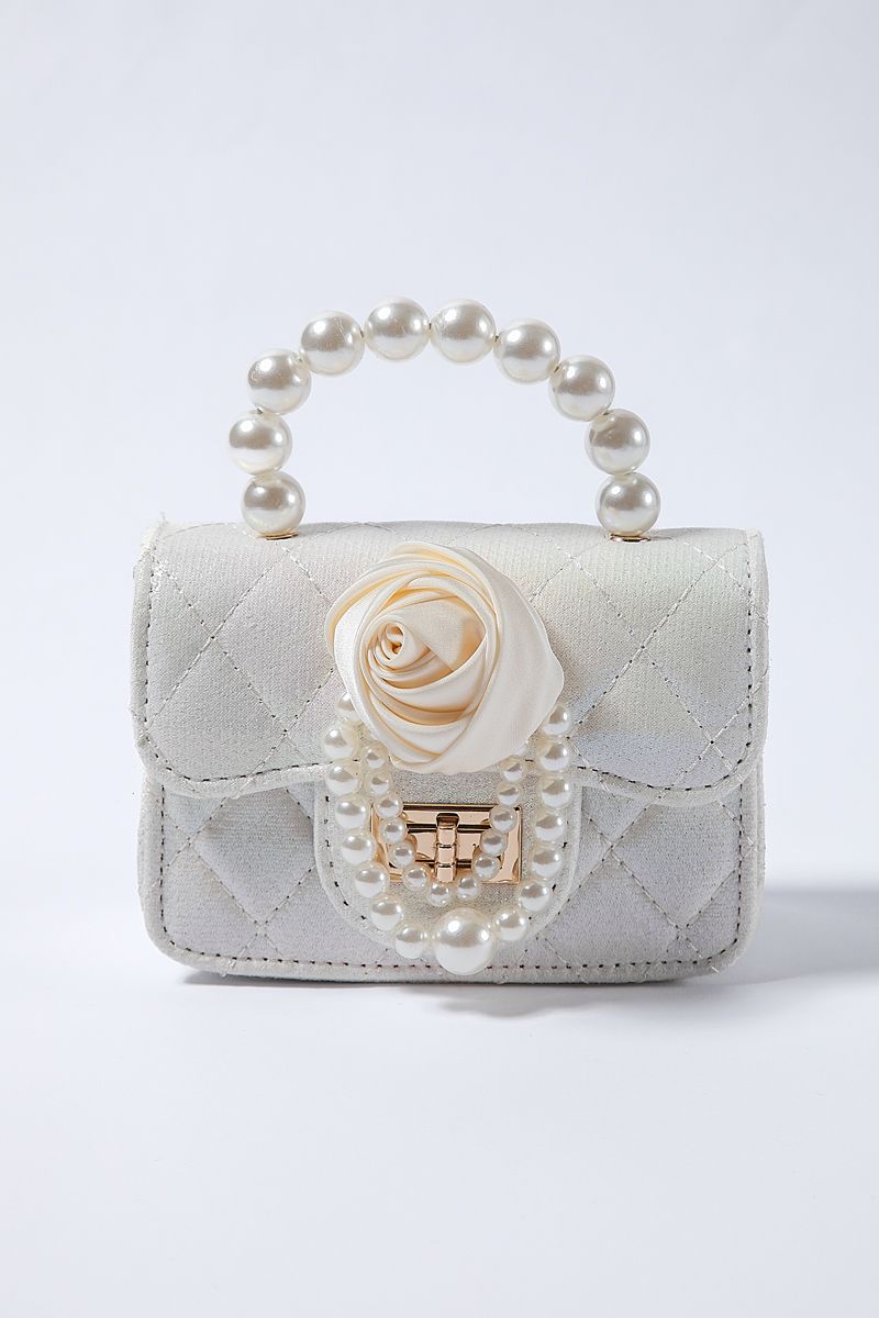 quilted pattern on full design in a solid mono colored metallic shiny pattern and decorated with flower ornament on the front side