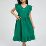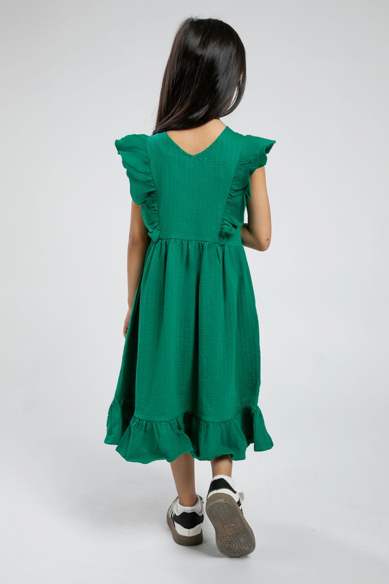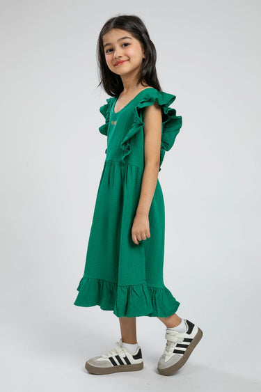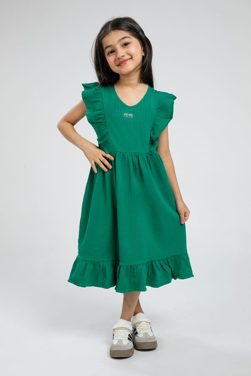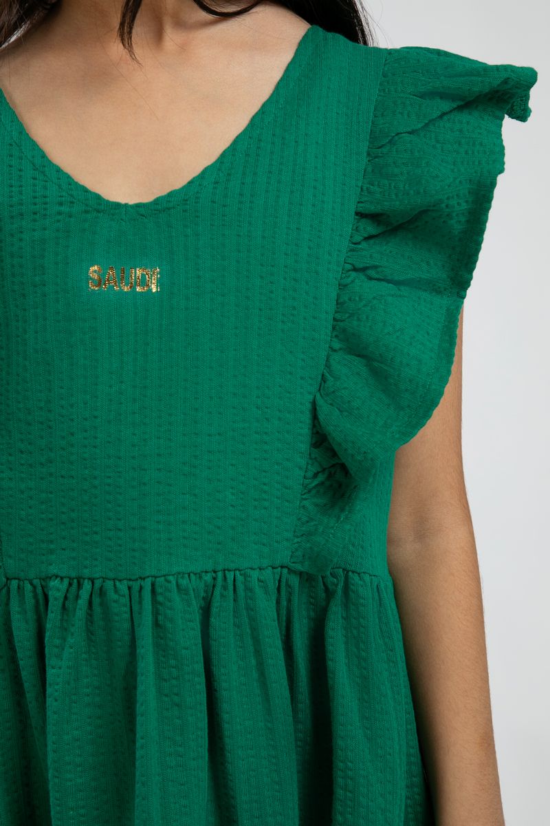 Flowy girls dress with textured fabric and playful ruffled sleeves highlighted by a gold Saudi lettering detail on the chest The gathered waist and tiered hem add soft volume and charm to this easy to wear design