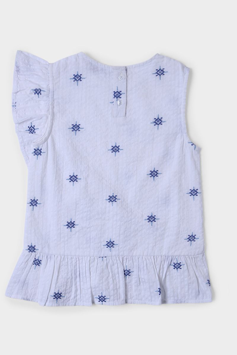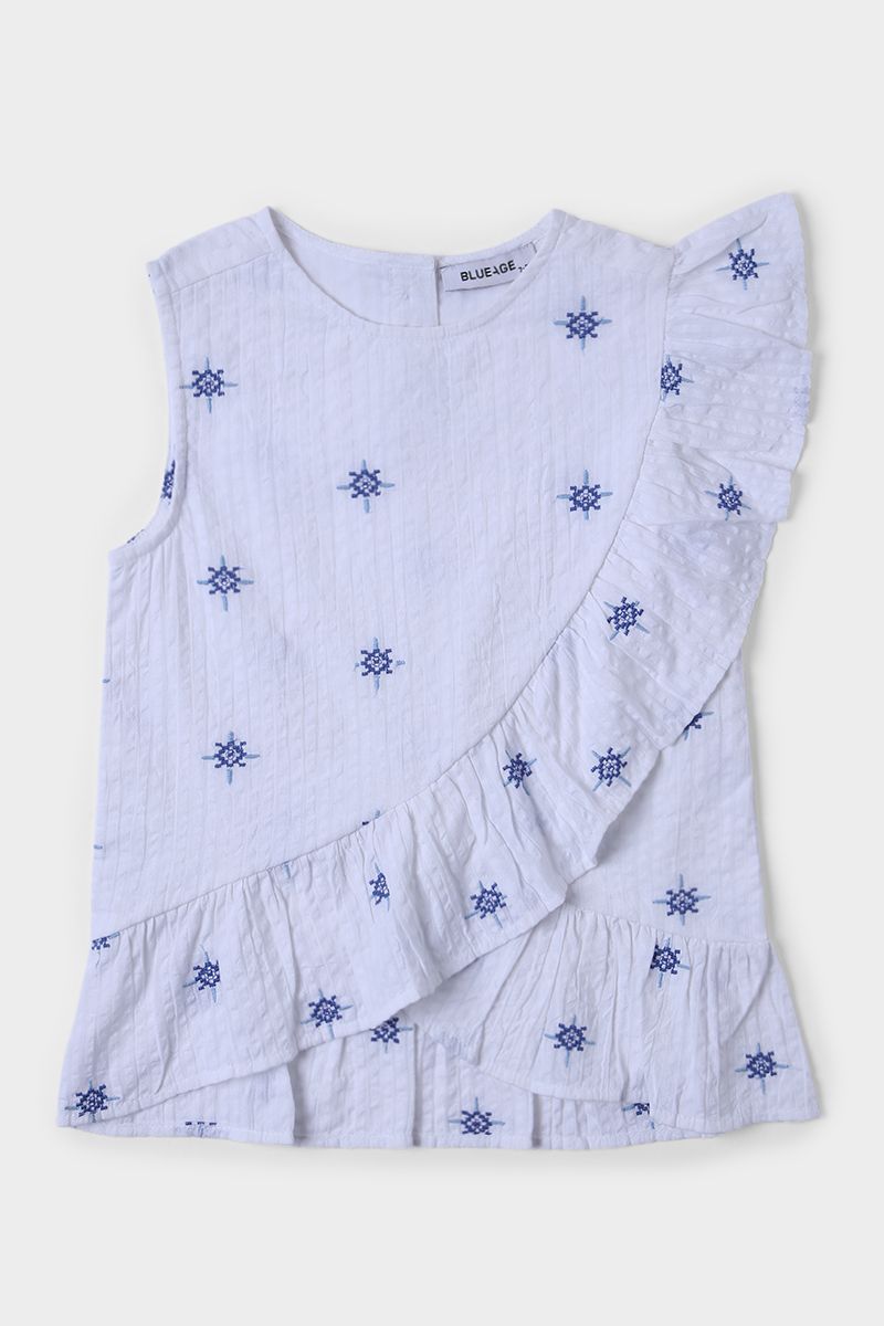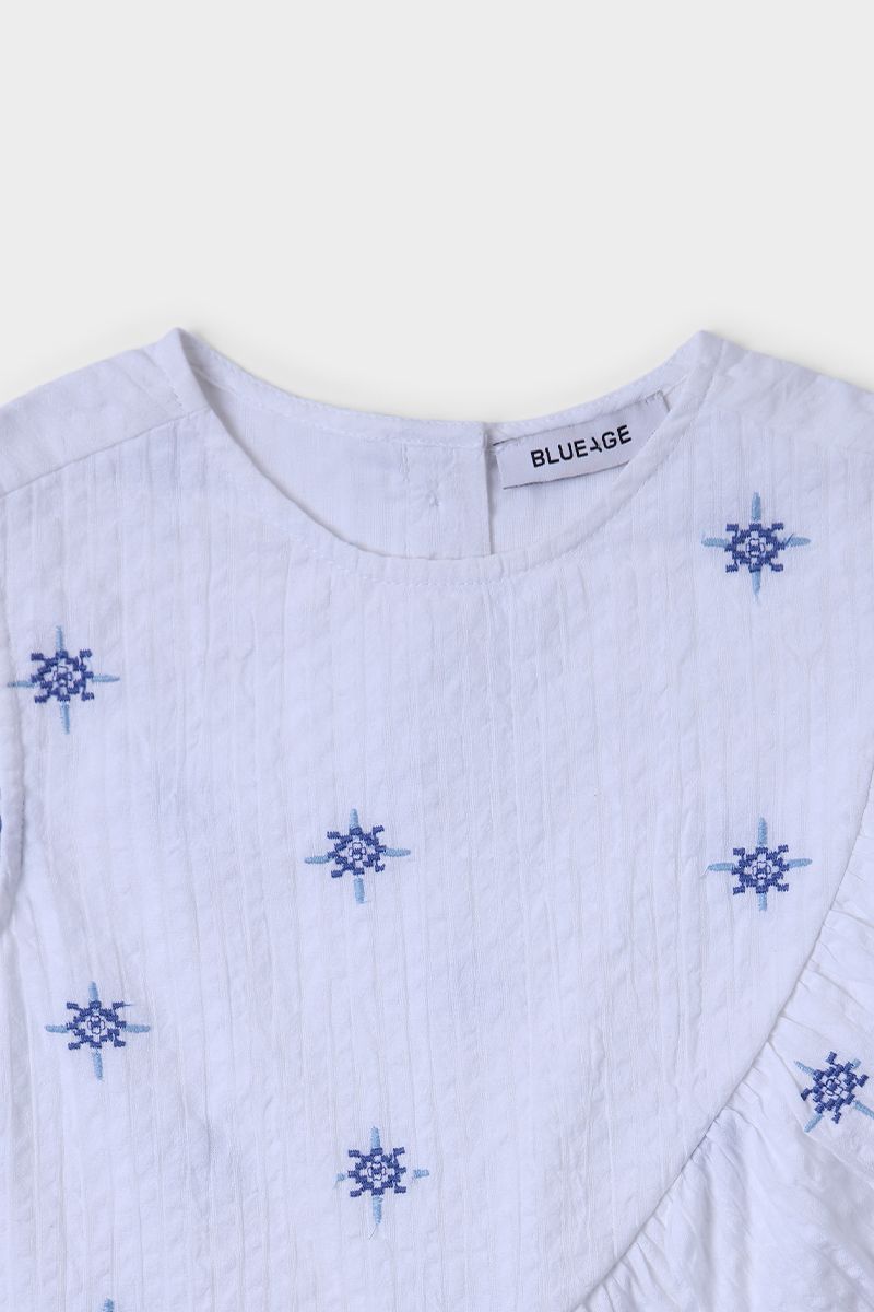 decorated with an embroidery pattern on full design and ruffled detail on sleeves and on the front side