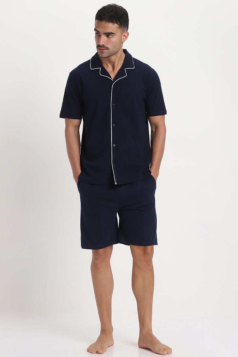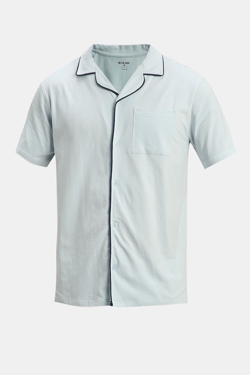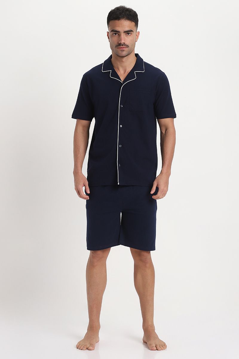 Experience relaxed elegance with this men’s lounge pajama set. The short-sleeve shirt top features contrast lining on the edges, a classic collar, front buttons for closure, and a front chest pocket for added charm. Paired with solid-color shorts designed for comfort, including front and back pockets, an elastic waistband, and an adjustable drawstring for a secure, customized fit. Perfect for lounging, warm nights, or weekend ease.