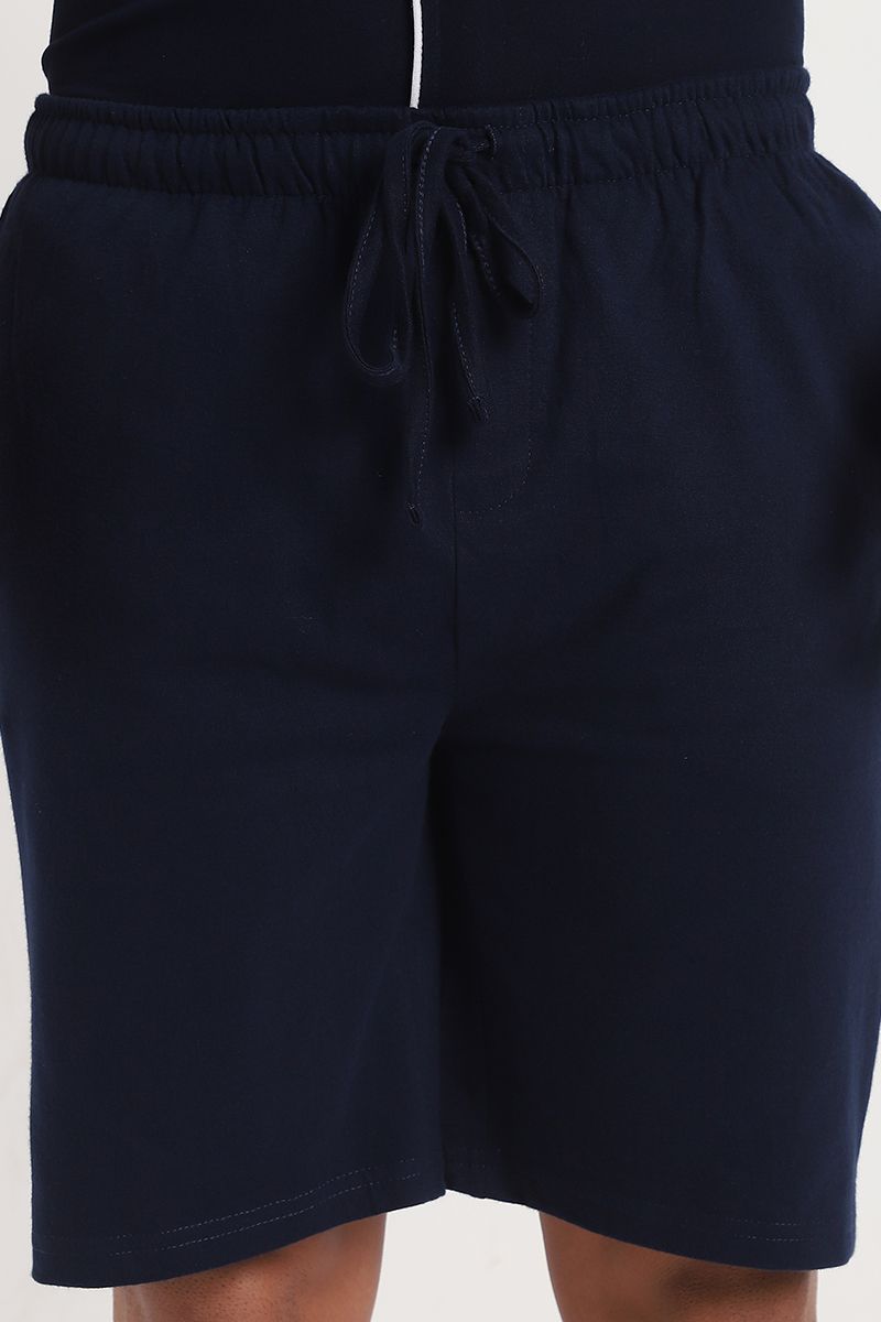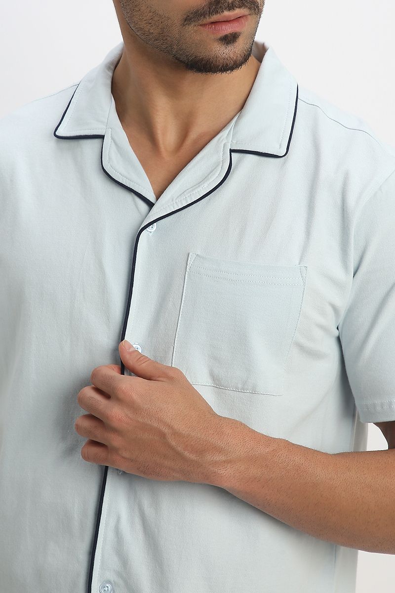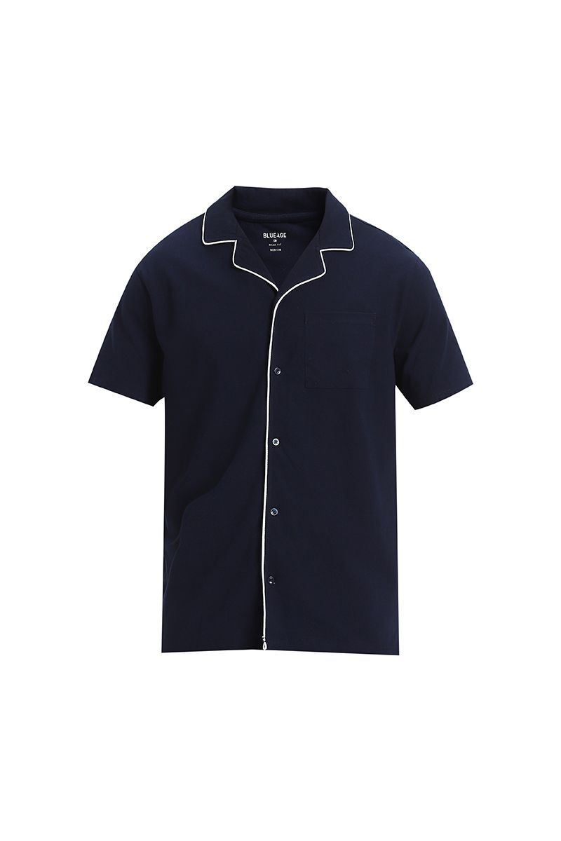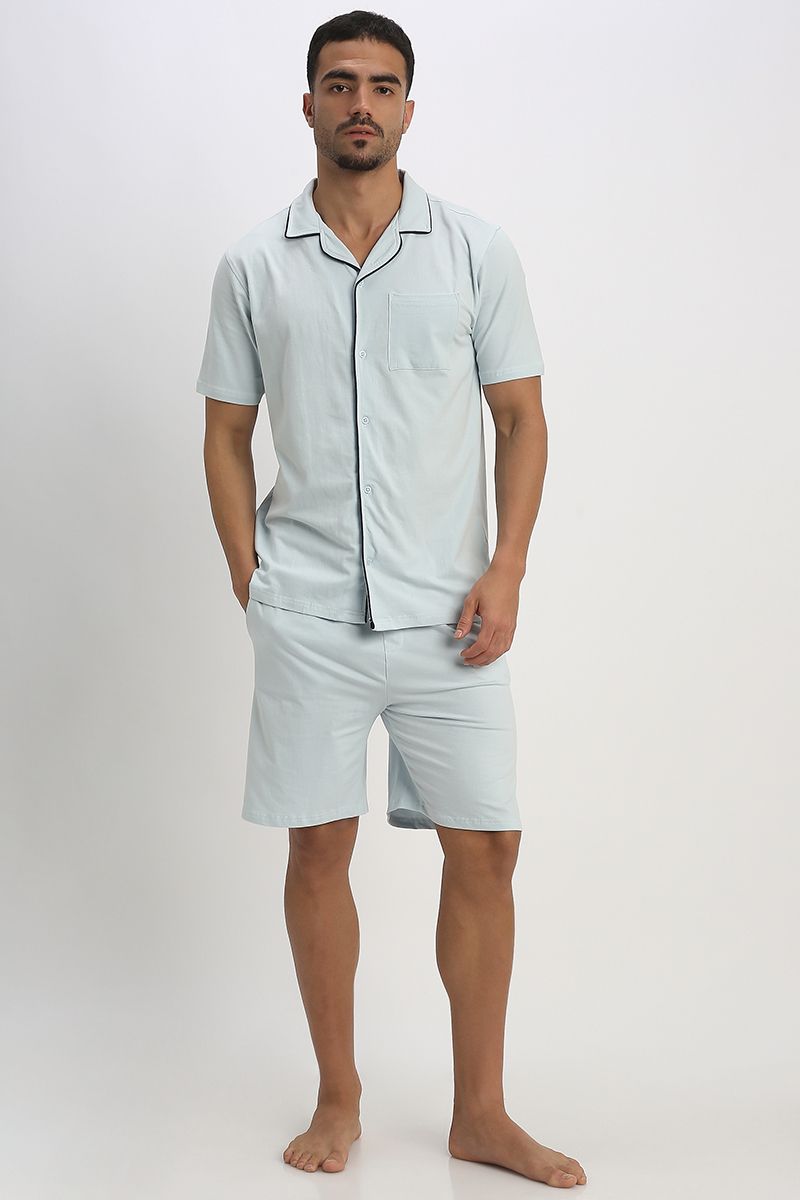 Experience relaxed elegance with this men’s lounge pajama set. The short-sleeve shirt top features contrast lining on the edges, a classic collar, front buttons for closure, and a front chest pocket for added charm. Paired with solid-color shorts designed for comfort, including front and back pockets, an elastic waistband, and an adjustable drawstring for a secure, customized fit. Perfect for lounging, warm nights, or weekend ease.