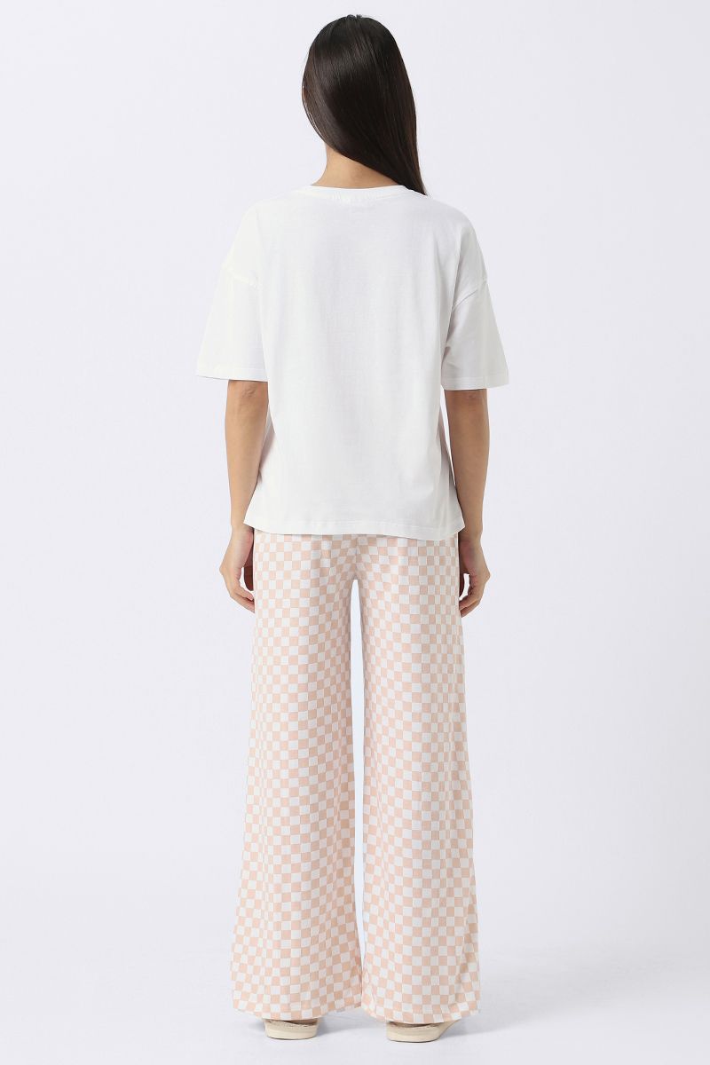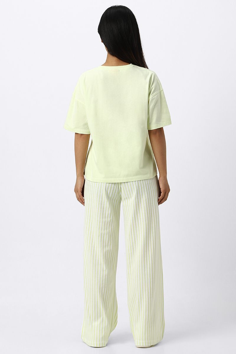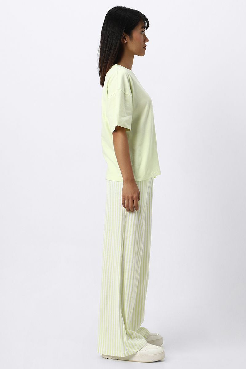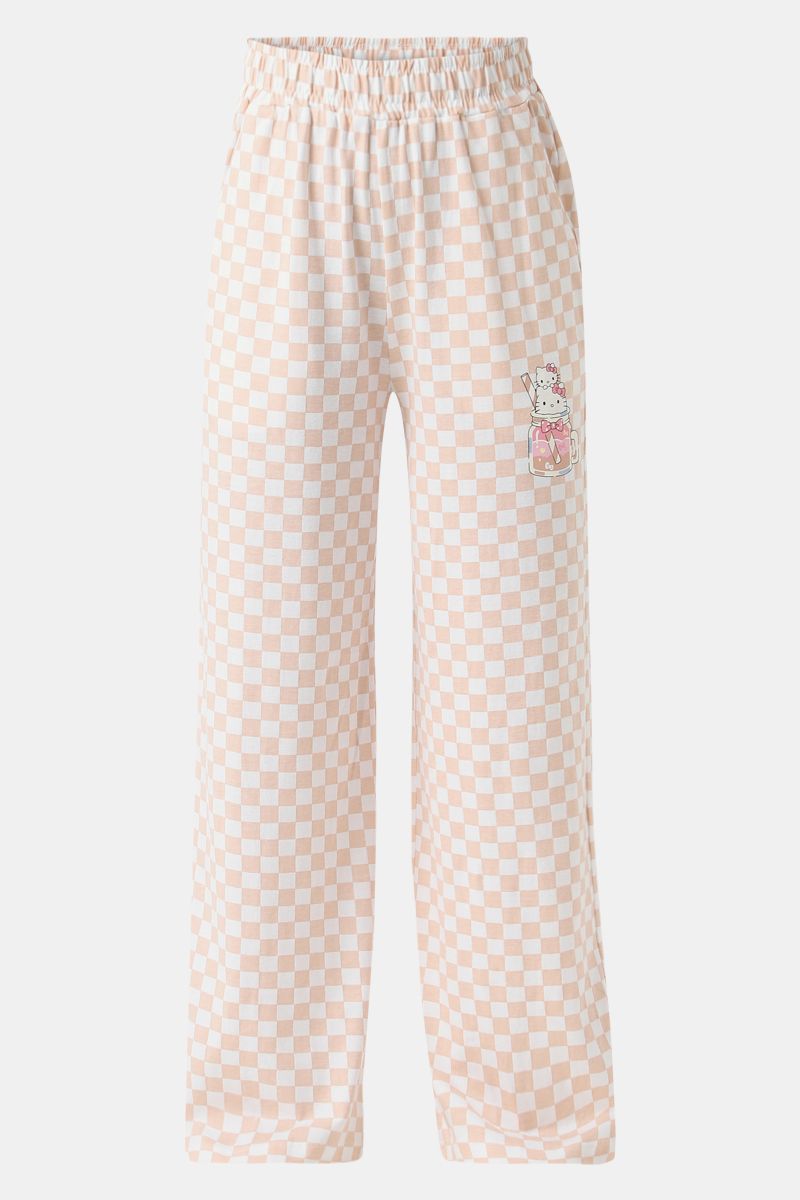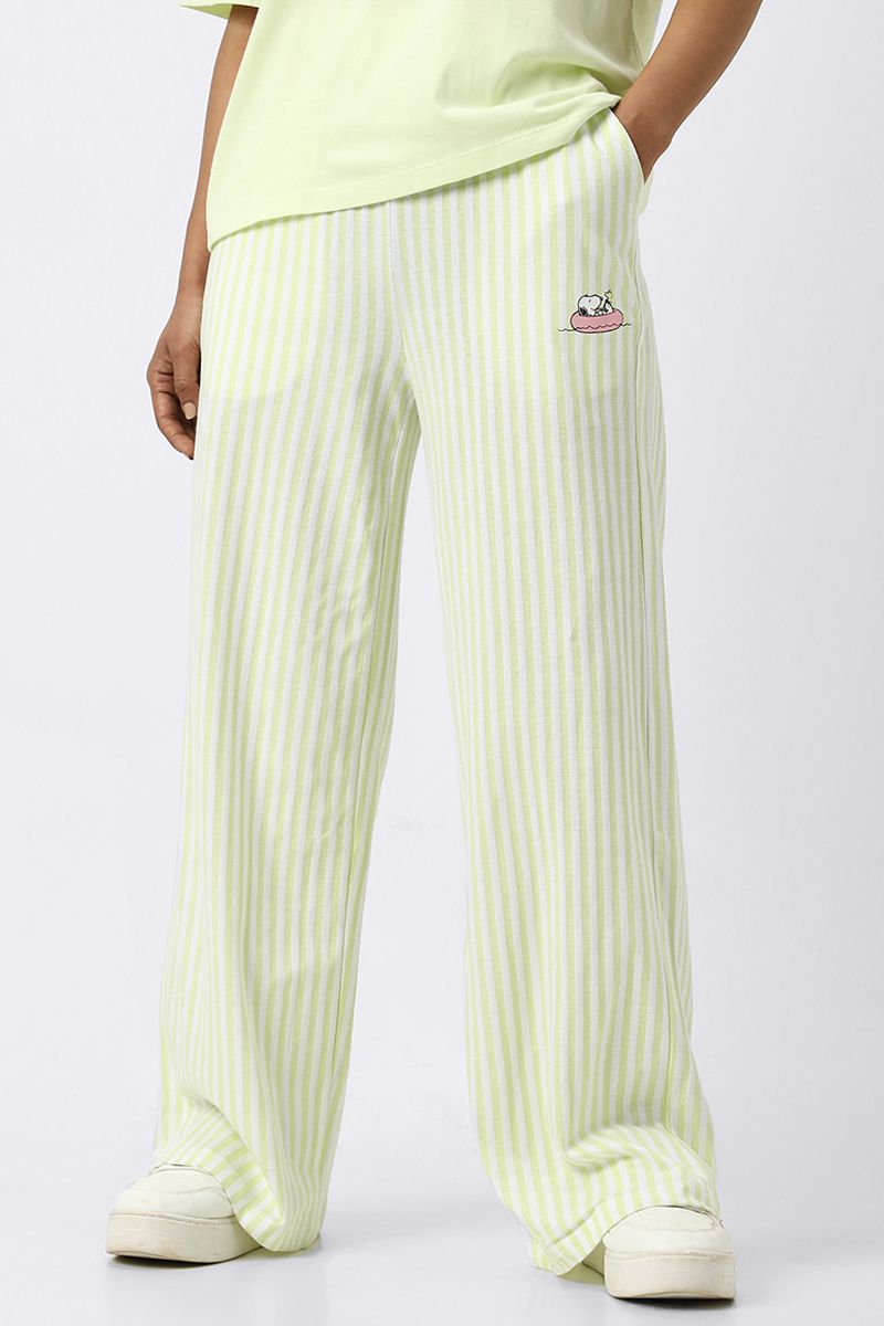 decorated with contrast colored striped pattern and a small print on one leg front side