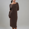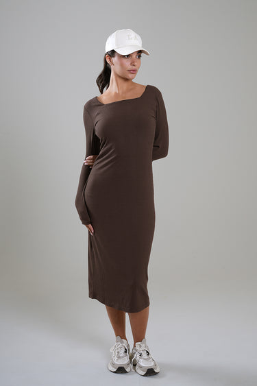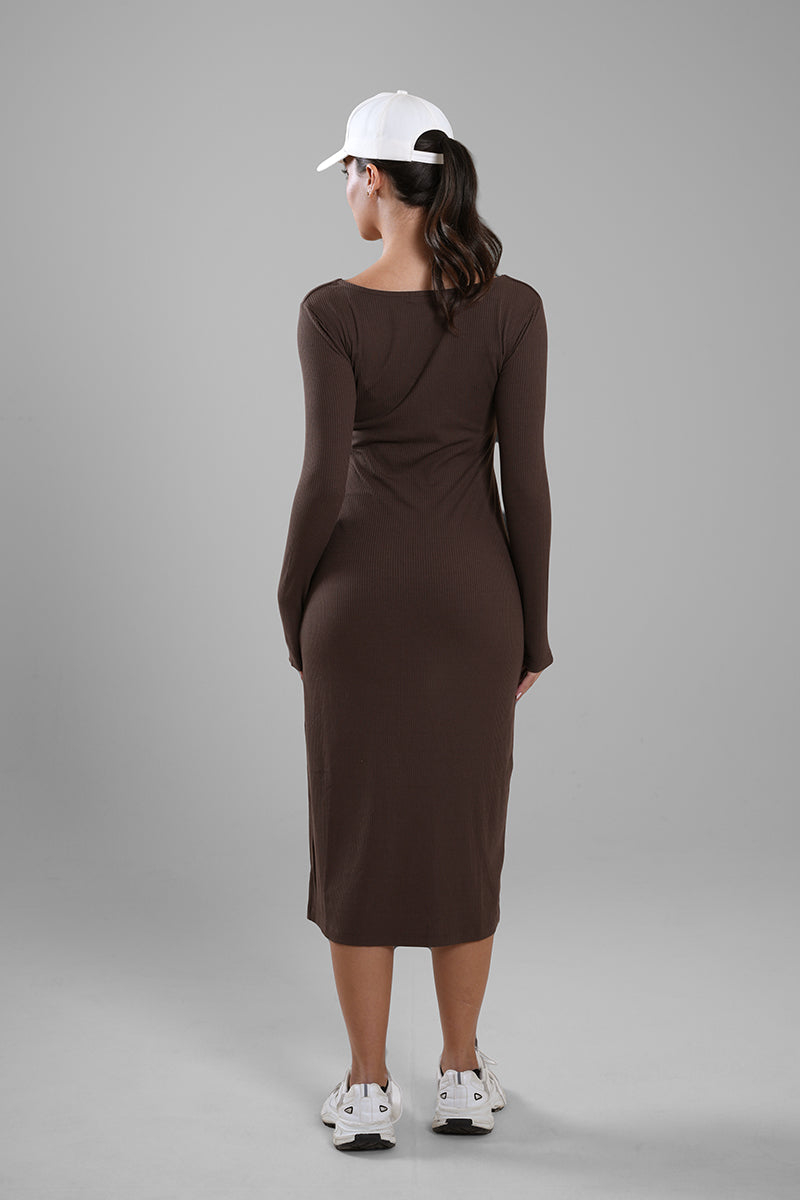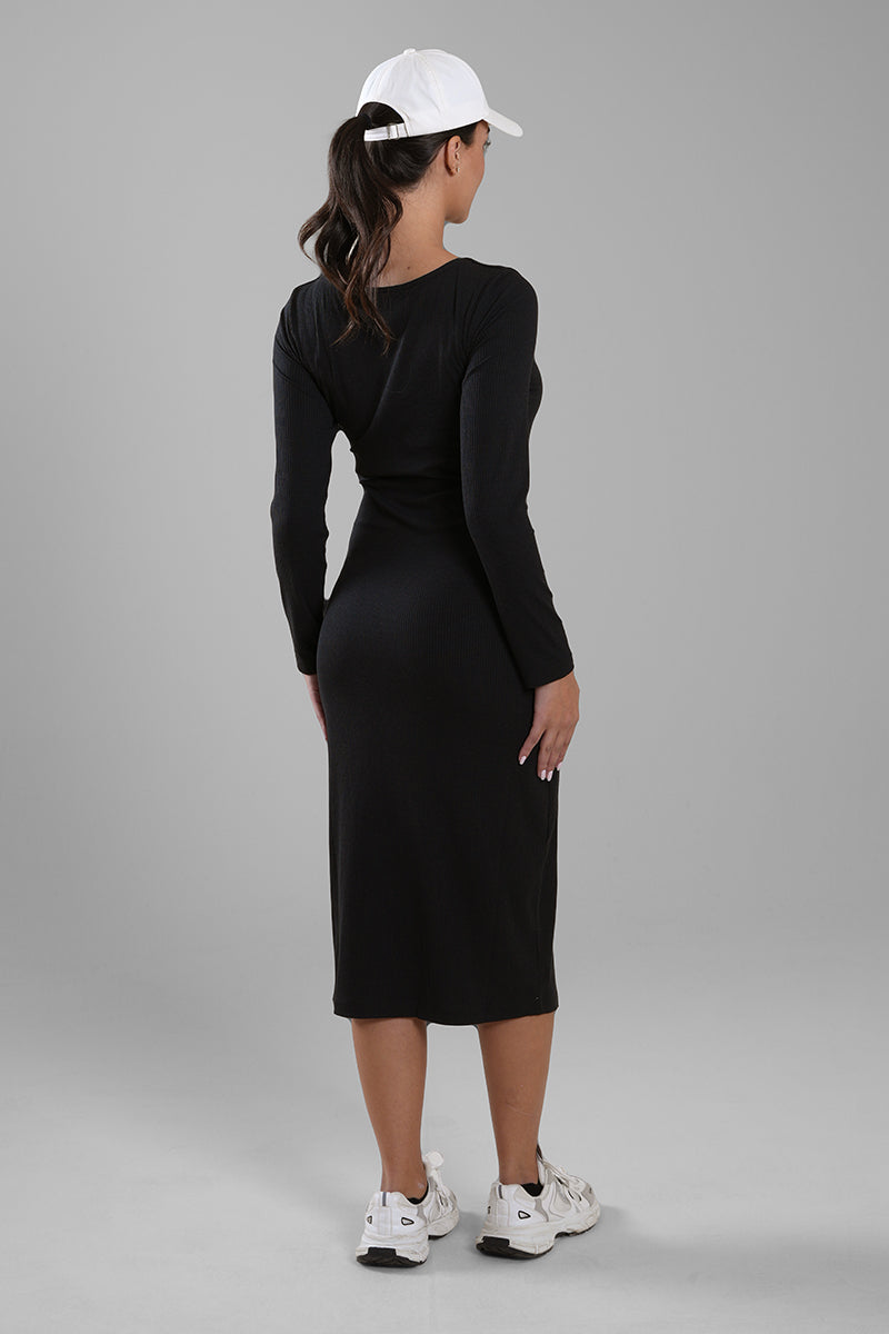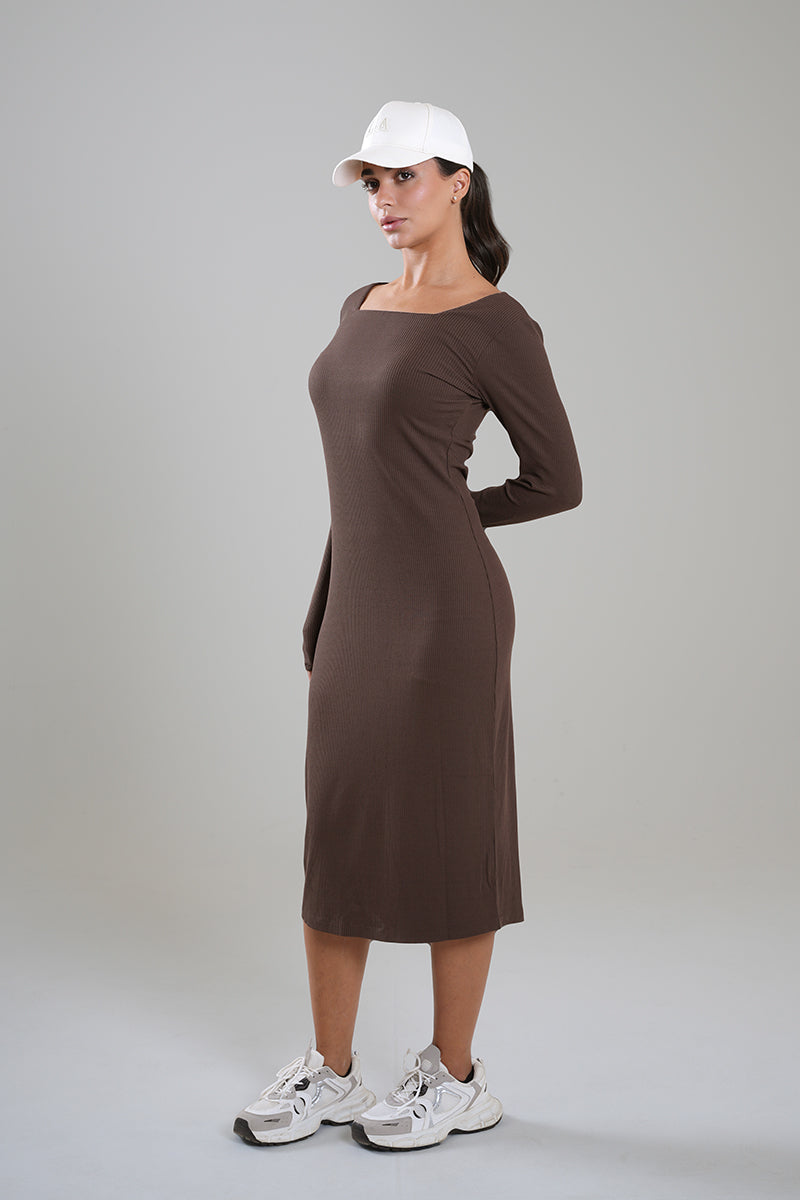 Women’s midi dress featuring a streamlined fitted silhouette with long sleeves and a clean, structured neckline. Designed to follow the body naturally while maintaining comfort, this piece works well for everyday wear, casual outings, or layered styling.