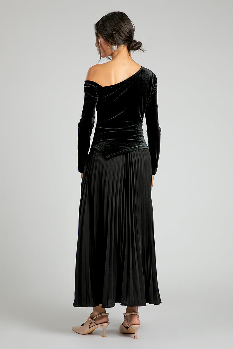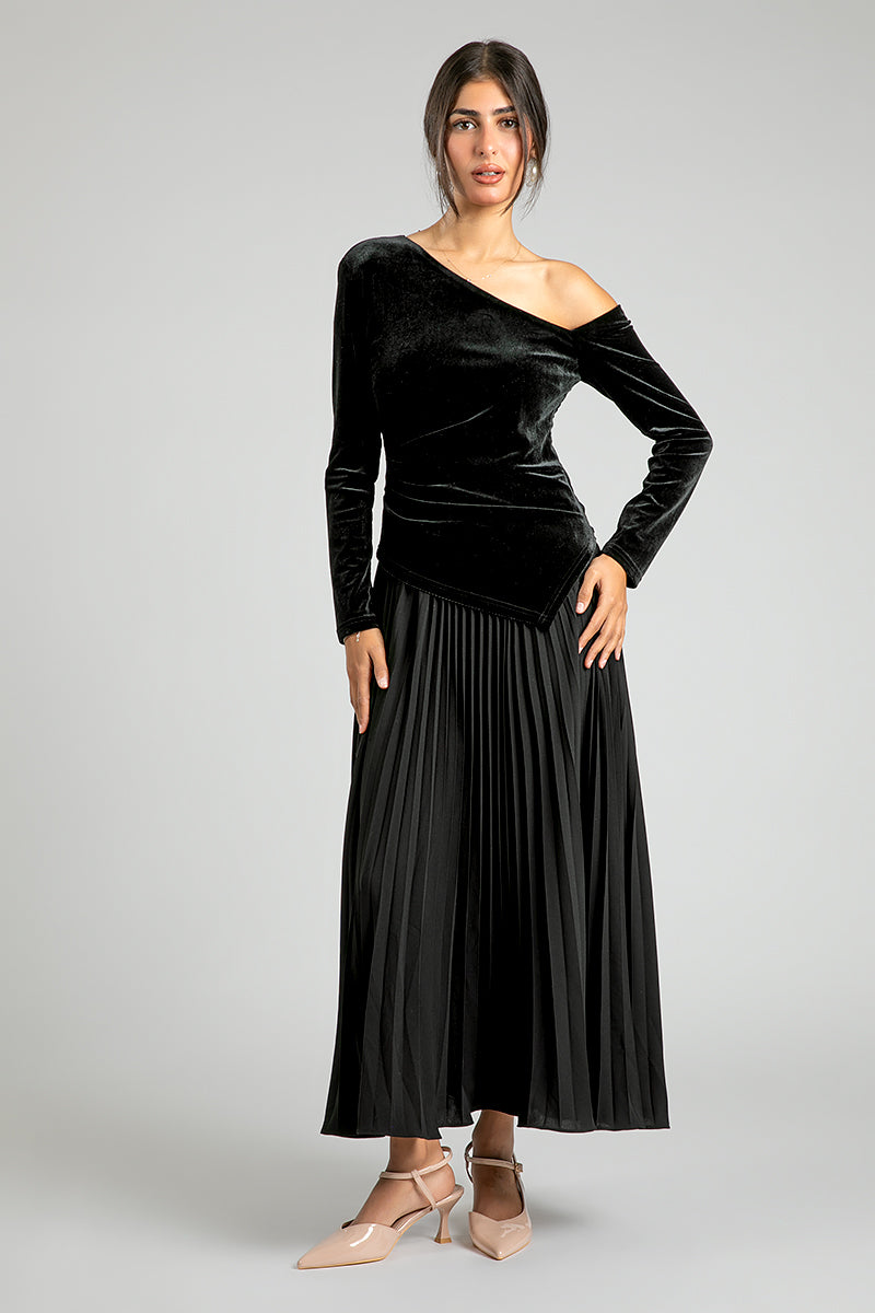 Make a refined statement with this one shoulder velvet pleated dress designed for modern elegance The soft velvet bodice enhances the silhouette with a sleek fitted shape while the flowing pleated skirt adds graceful movement and balanced volume The asymmetrical neckline brings a contemporary edge making it ideal for formal events evening occasions and sophisticated gatherings A standout piece that blends modest fashion timeless glamour and effortless confidence