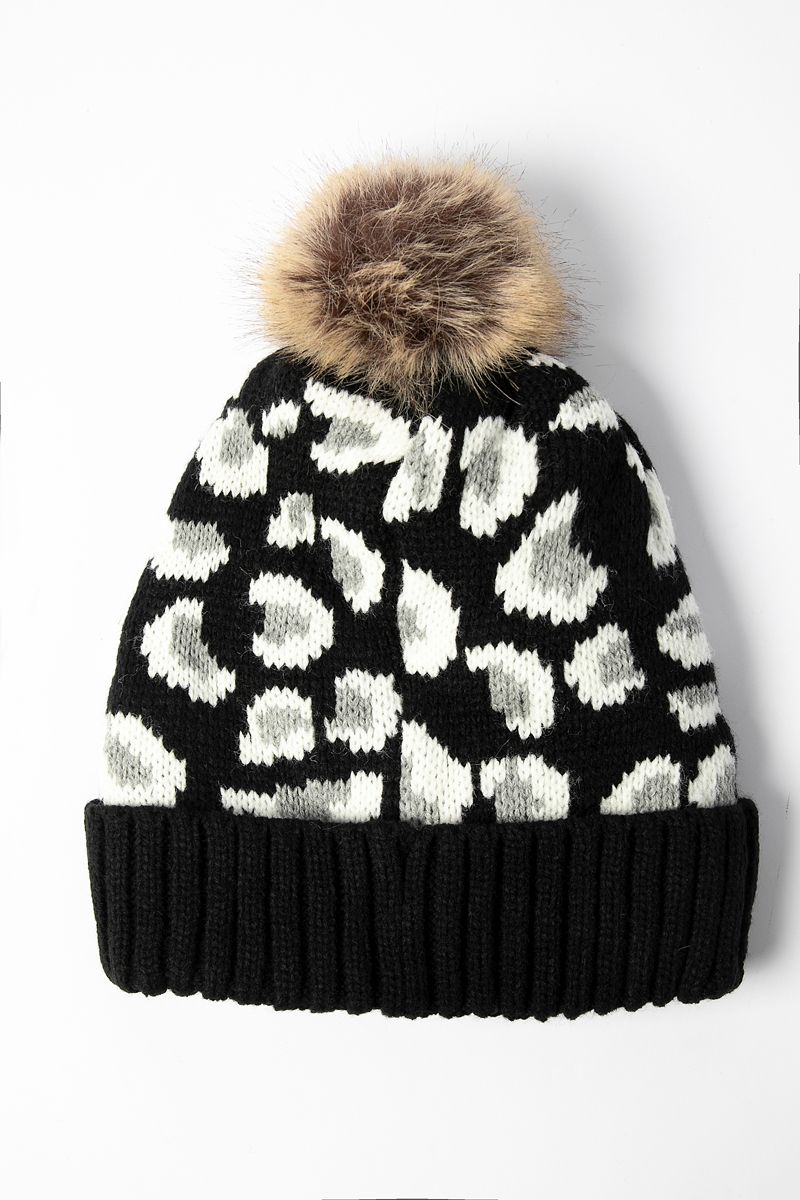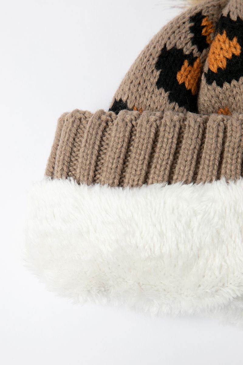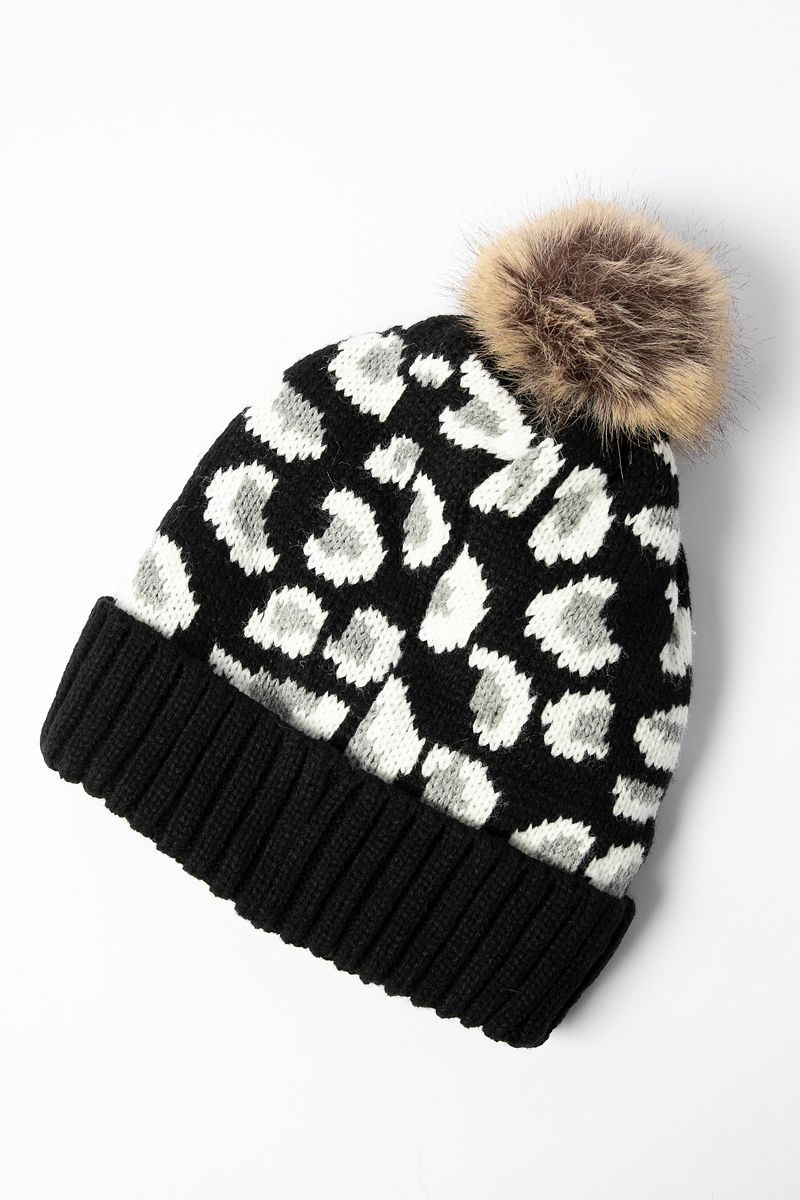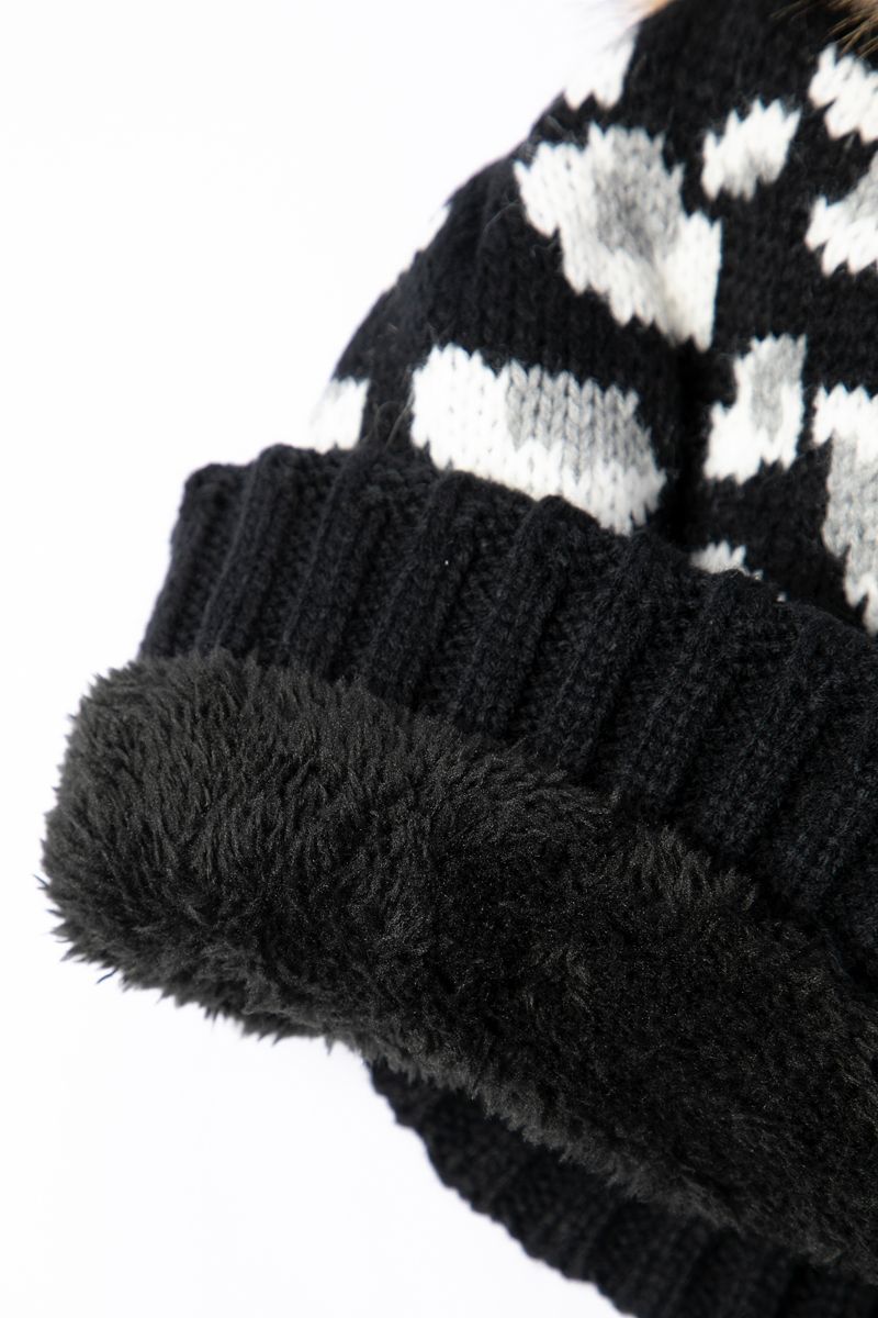 Cozy knitted beanie featuring a bold patterned design with a playful faux fur pom pom on top and a soft inner lining for added warmth and comfort