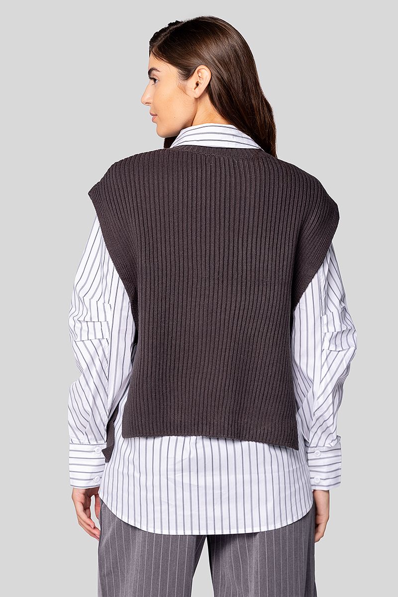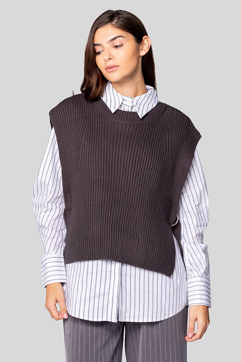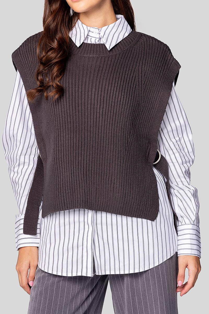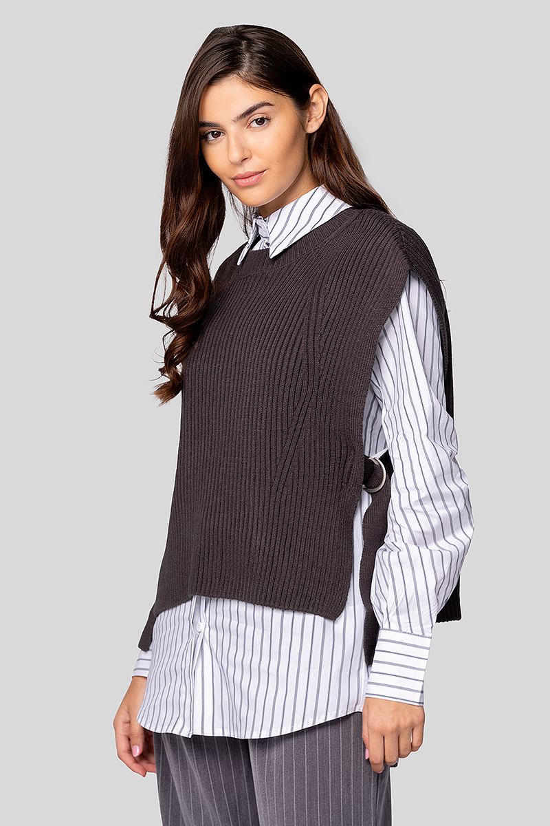 A relaxed fit knitted vest designed sleeveless with adjustable side ties for a modern layered look perfect for styling over shirts or blouses adding warmth and sophistication to everyday outfits.