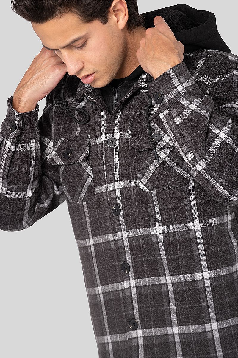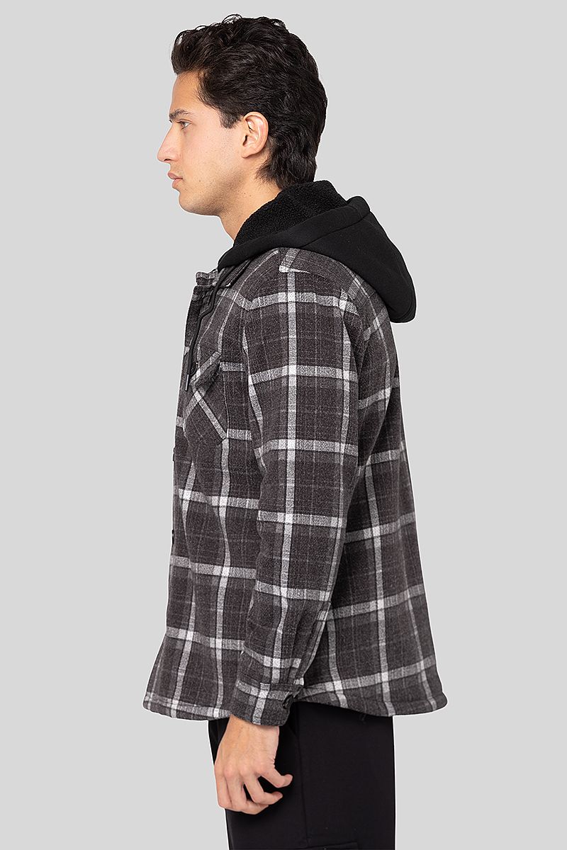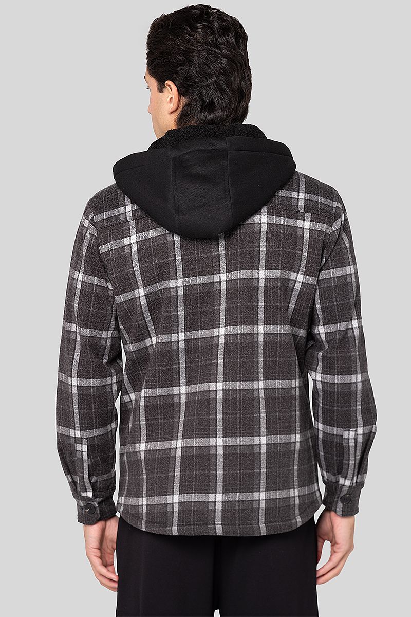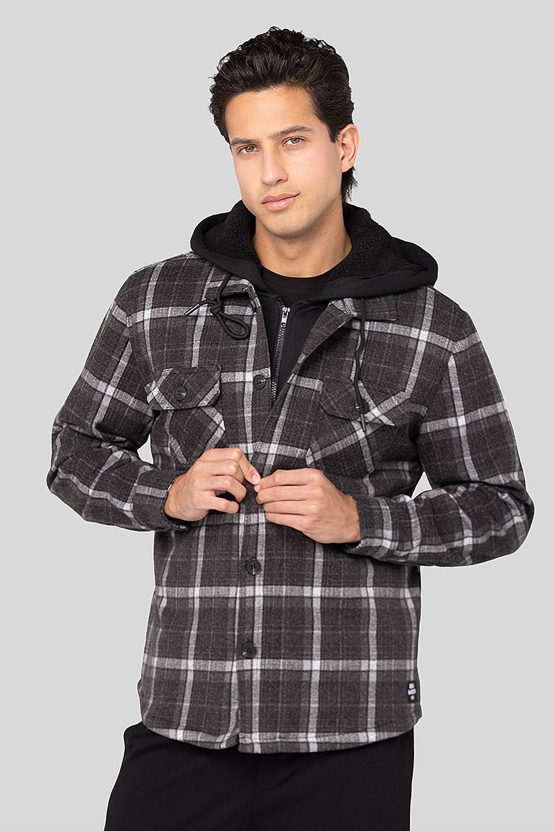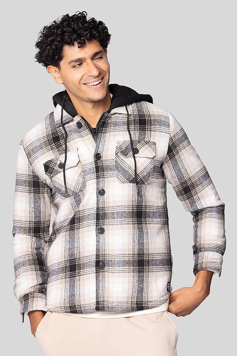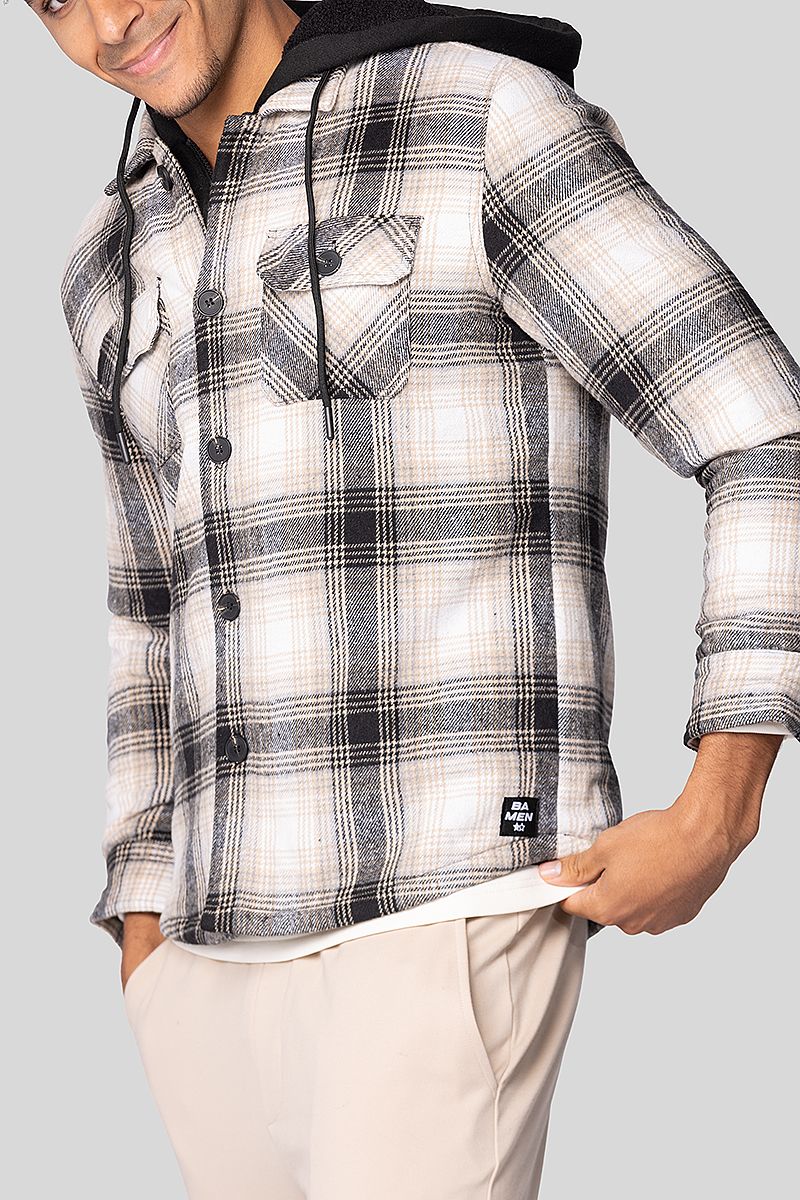 A men’s classic checked shacket featuring a front button closure warm inner hood flap chest pockets and soft lining designed for casual layering and comfortable wear in cool weather