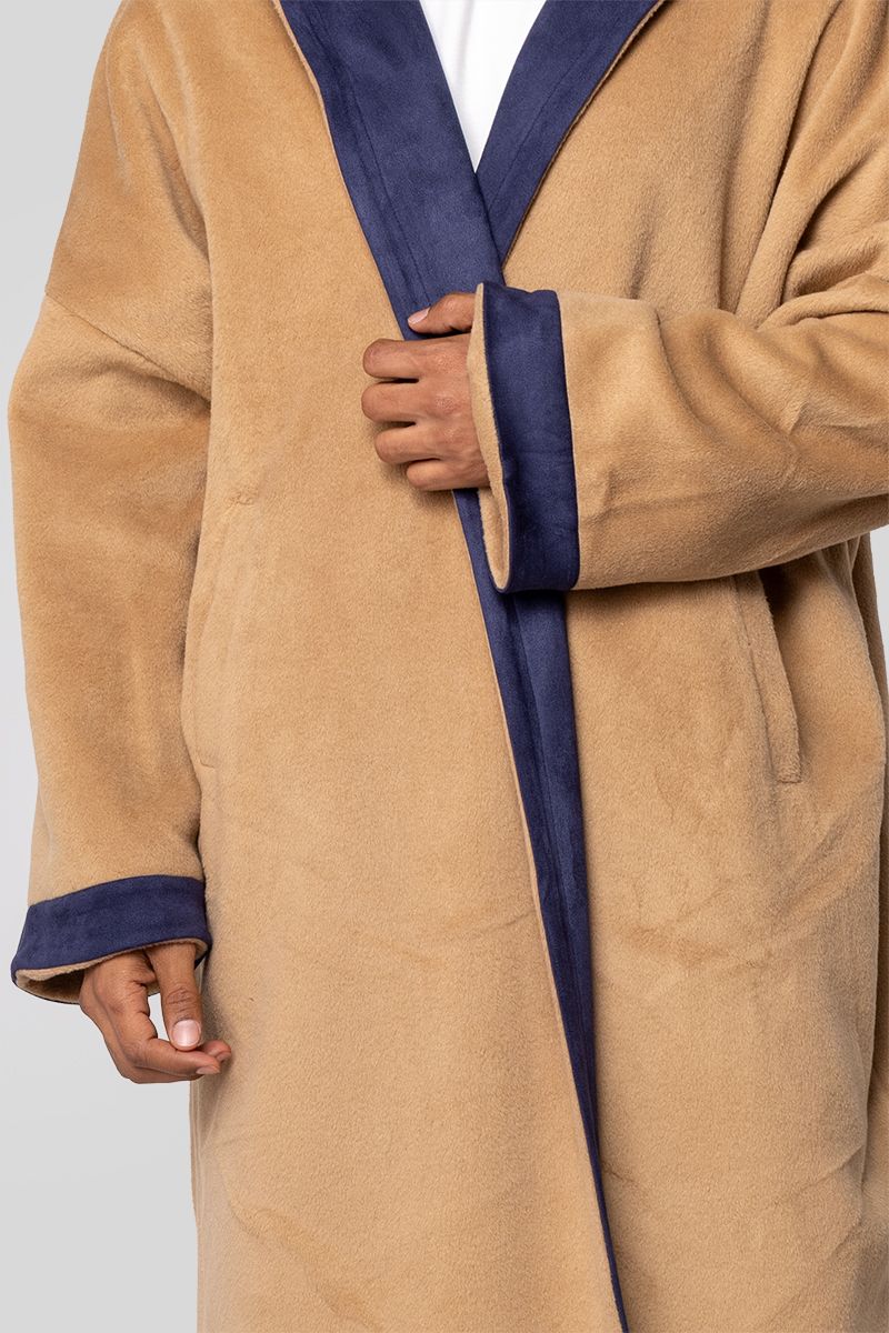 A full length reversible farwa coat featuring a wide hood, straight sleeves, and clean finishing. Designed with two contrasting sides to offer versatile styling and warmth, making it a practical and elegant outerwear choice for winter.