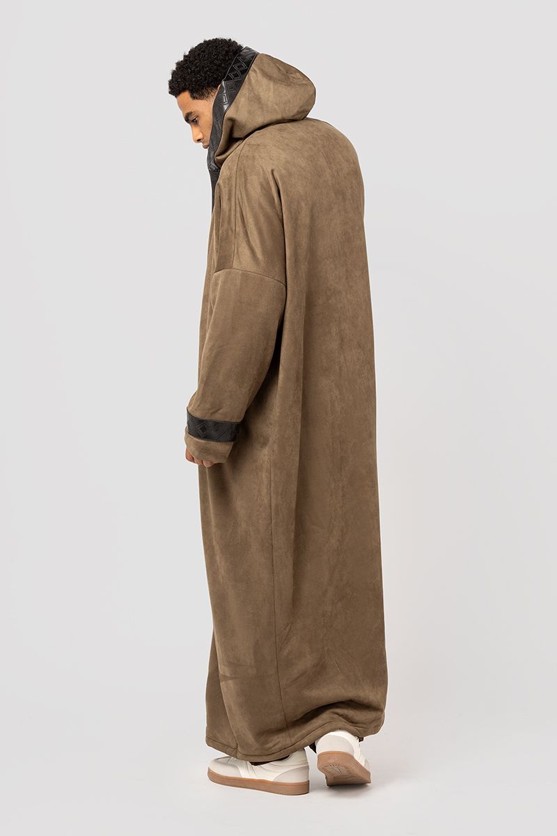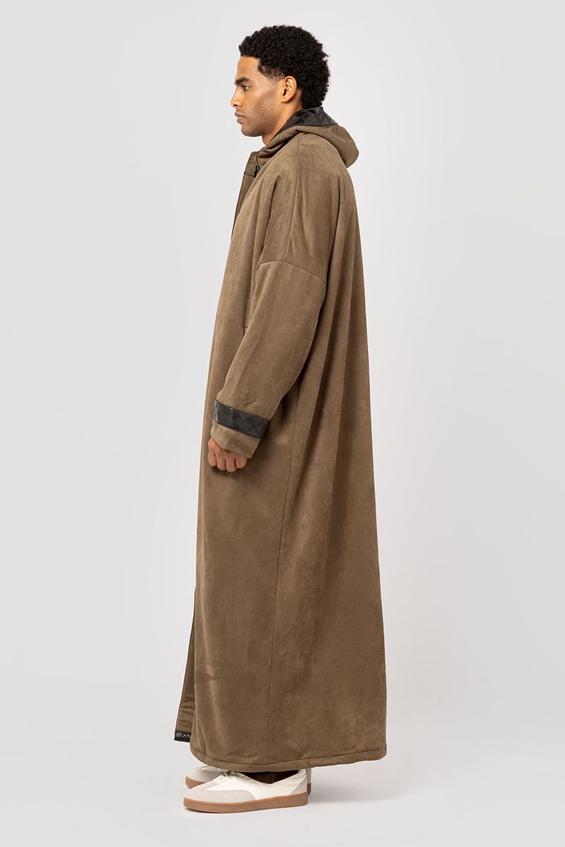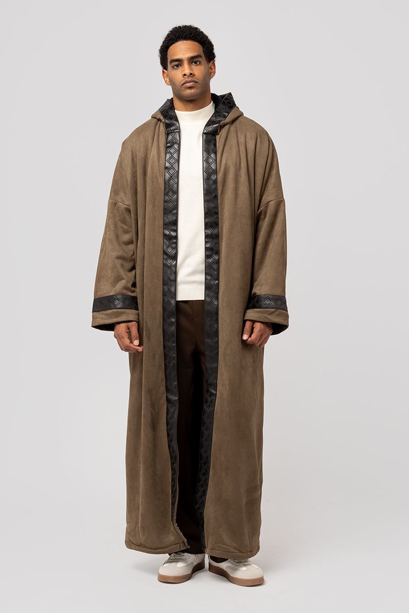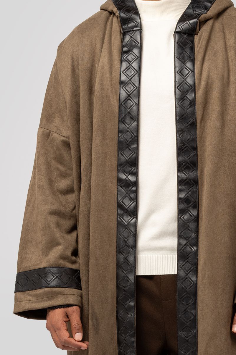 A full length farwa coat designed with a wide hood and straight sleeves, detailed with faux leather trims featuring geometric embossed patterns along the front and cuffs. Crafted to combine traditional style with modern accents, offering warmth and refined elegance.