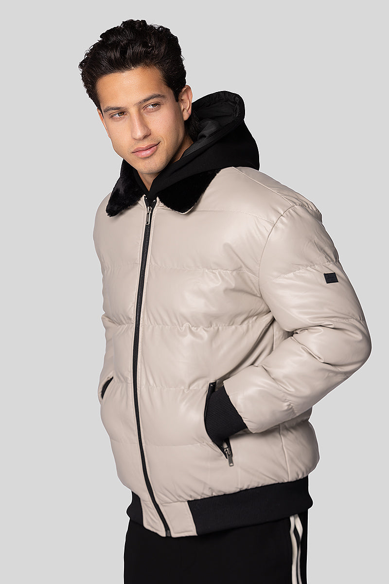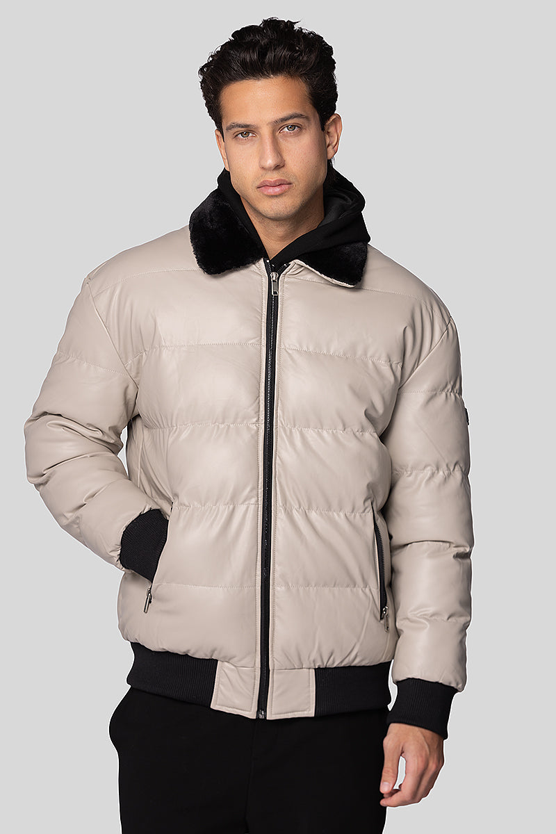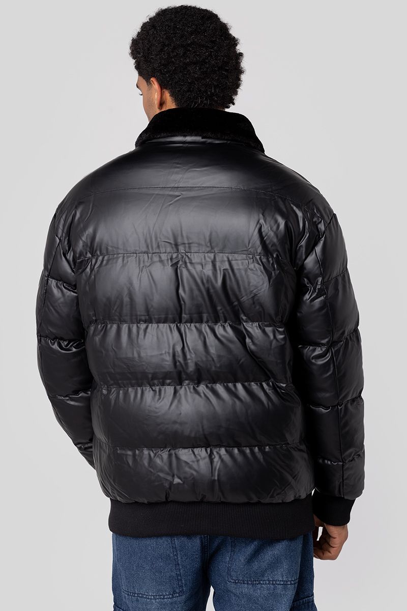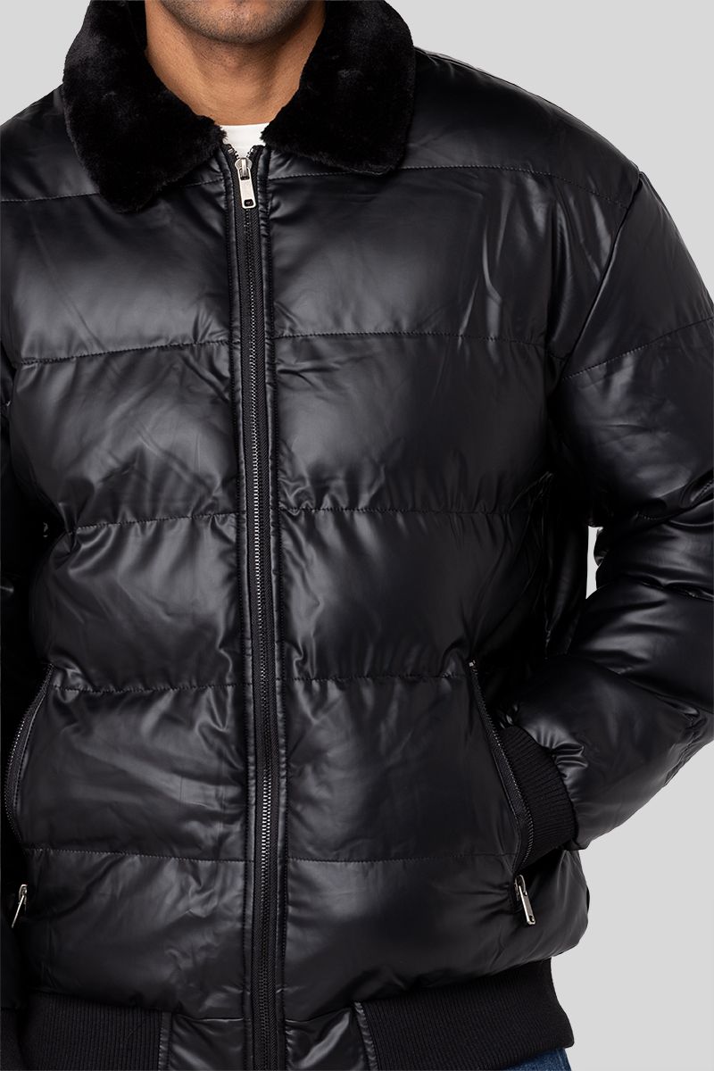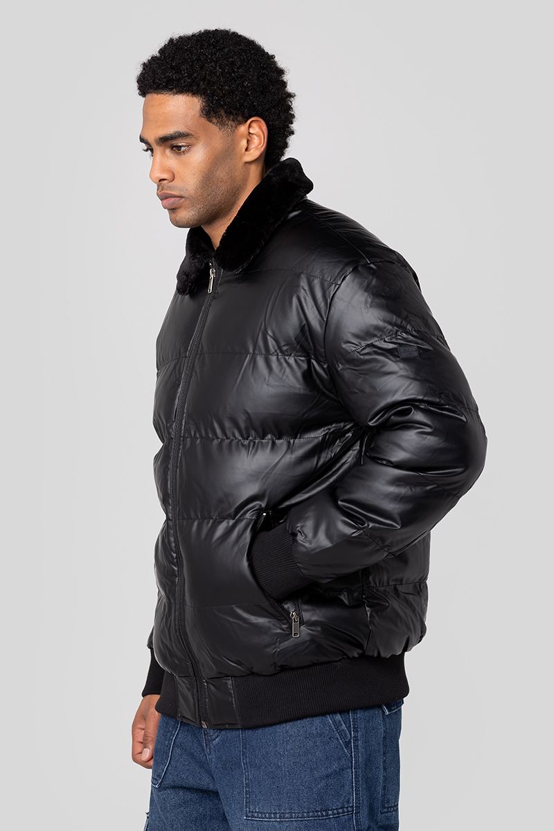 A modern men’s puffer jacket designed for warmth and comfort in cold weather featuring a soft faux fur collar front zip closure ribbed cuffs and hem and side zip pockets for practicality perfect for casual outings and everyday wear