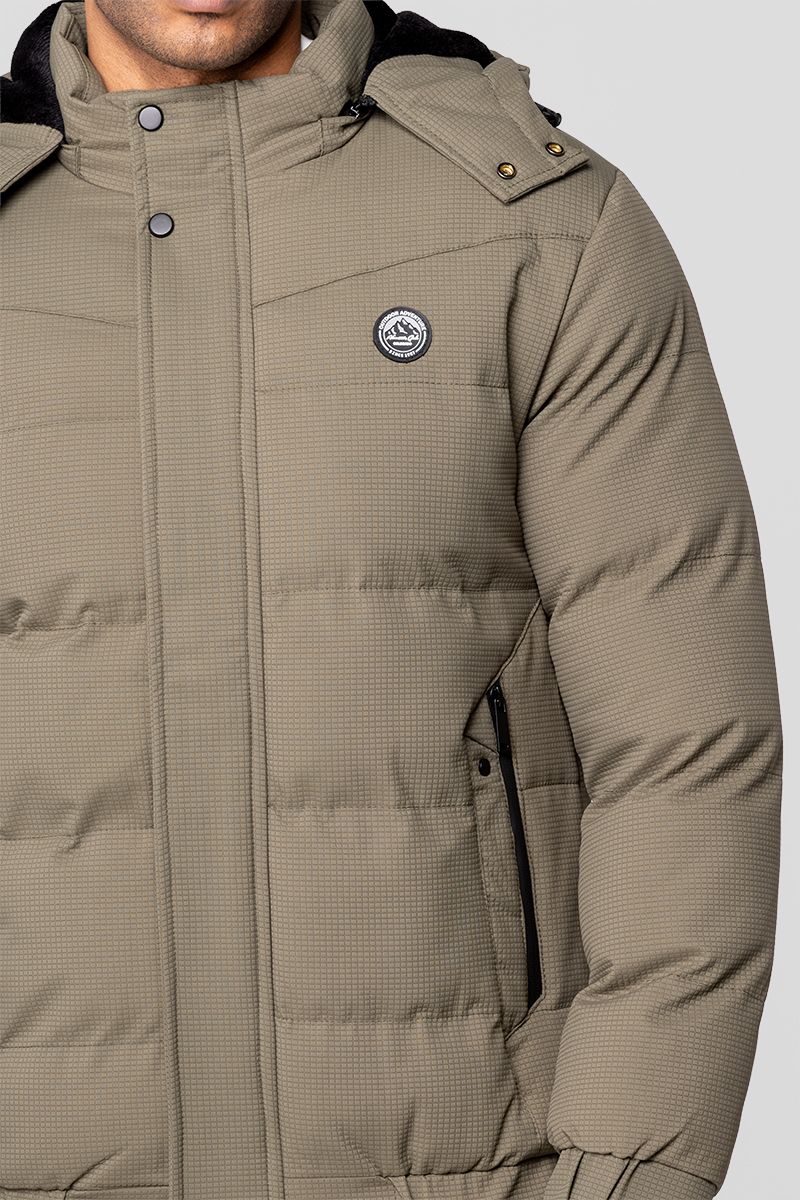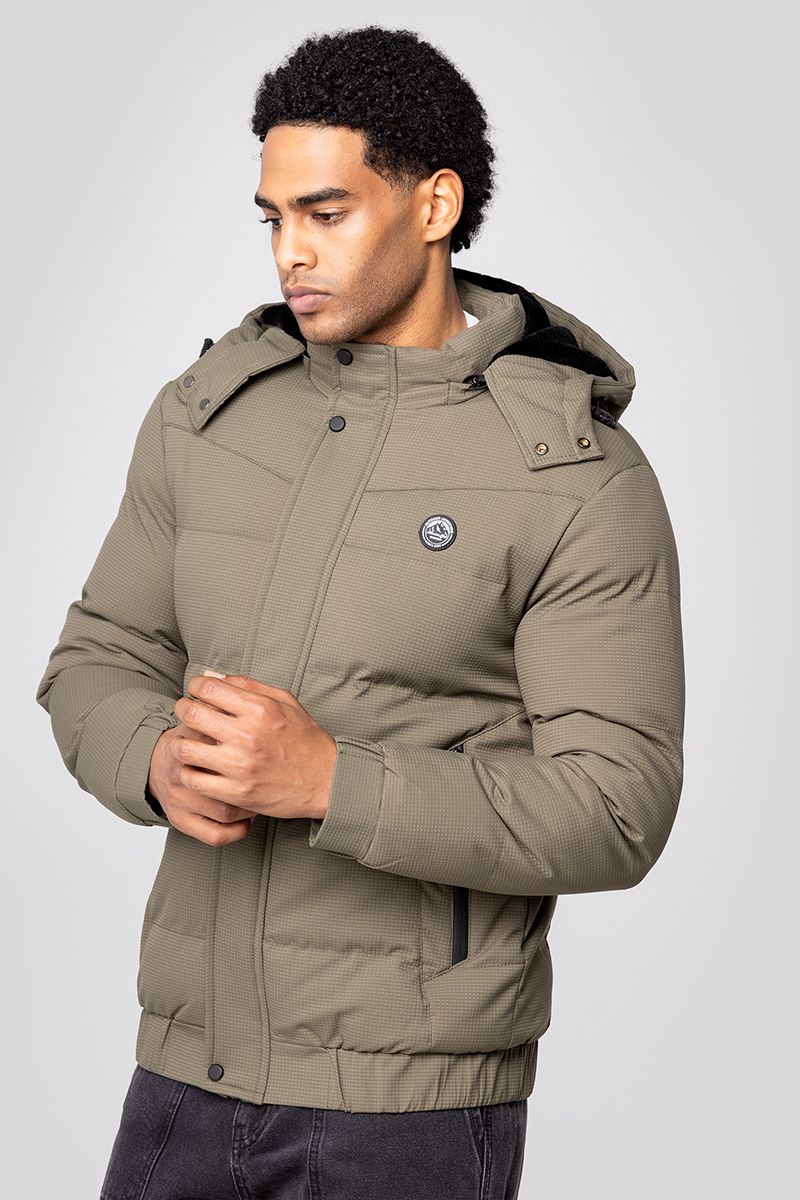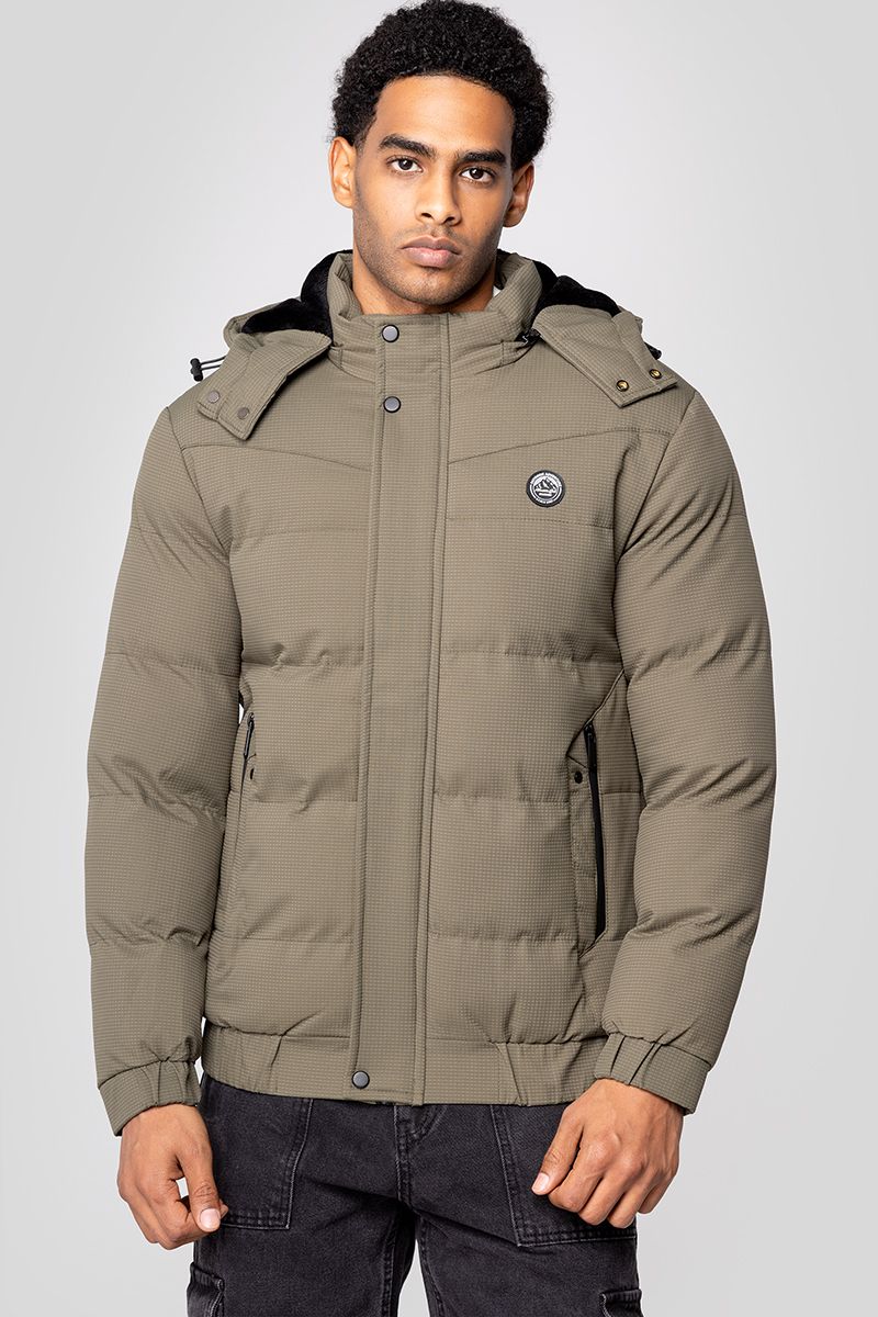 A warm puffer jacket designed with a detachable hood, full front zip closure with snap button placket, and side zip pockets. Finished with elastic cuffs and hem for a secure fit, making it a versatile and functional outerwear piece for cold weather.