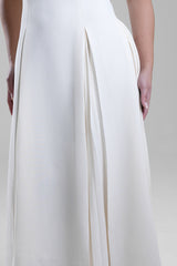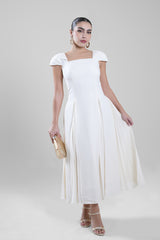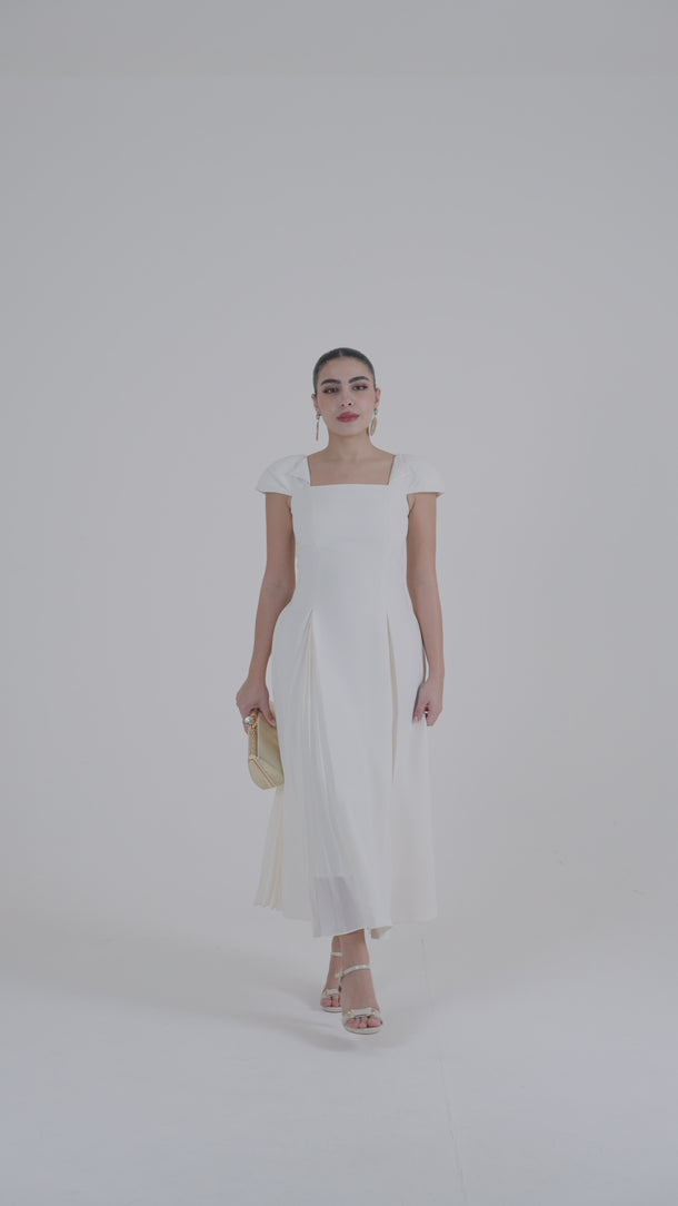 An elegant midi dress designed with a structured bodice and softly flowing pleated panels that add movement and dimension. The refined silhouette offers a flattering fit, while the pleated details create a graceful finish suitable for occasions, gatherings, and evening wear. Easy to style with heels or statement accessories for a polished look.