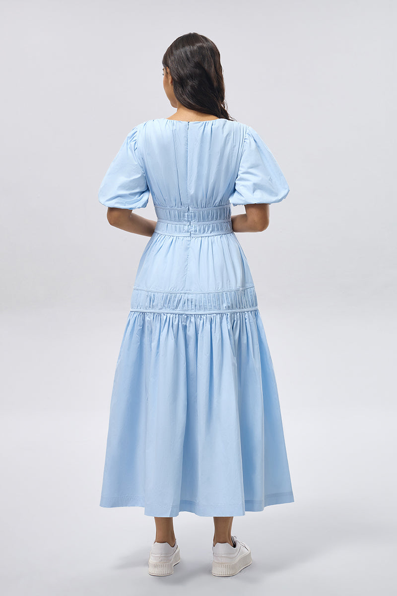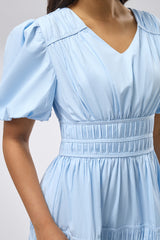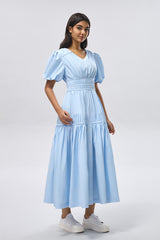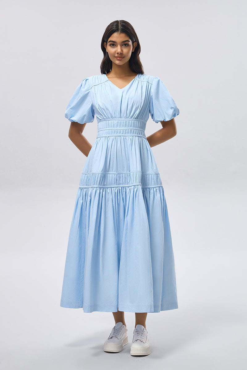 dress designed with soft puff sleeves and a defined smocked waist that enhances the silhouette without restricting movement. Features a flowing tiered skirt and a lightweight fabric that offers comfort and ease for everyday wear or relaxed occasions.