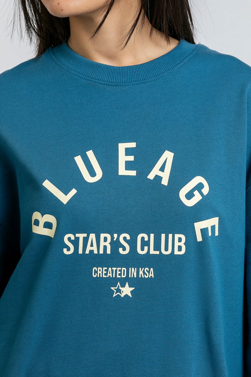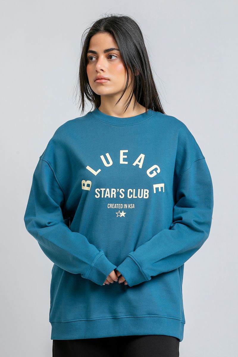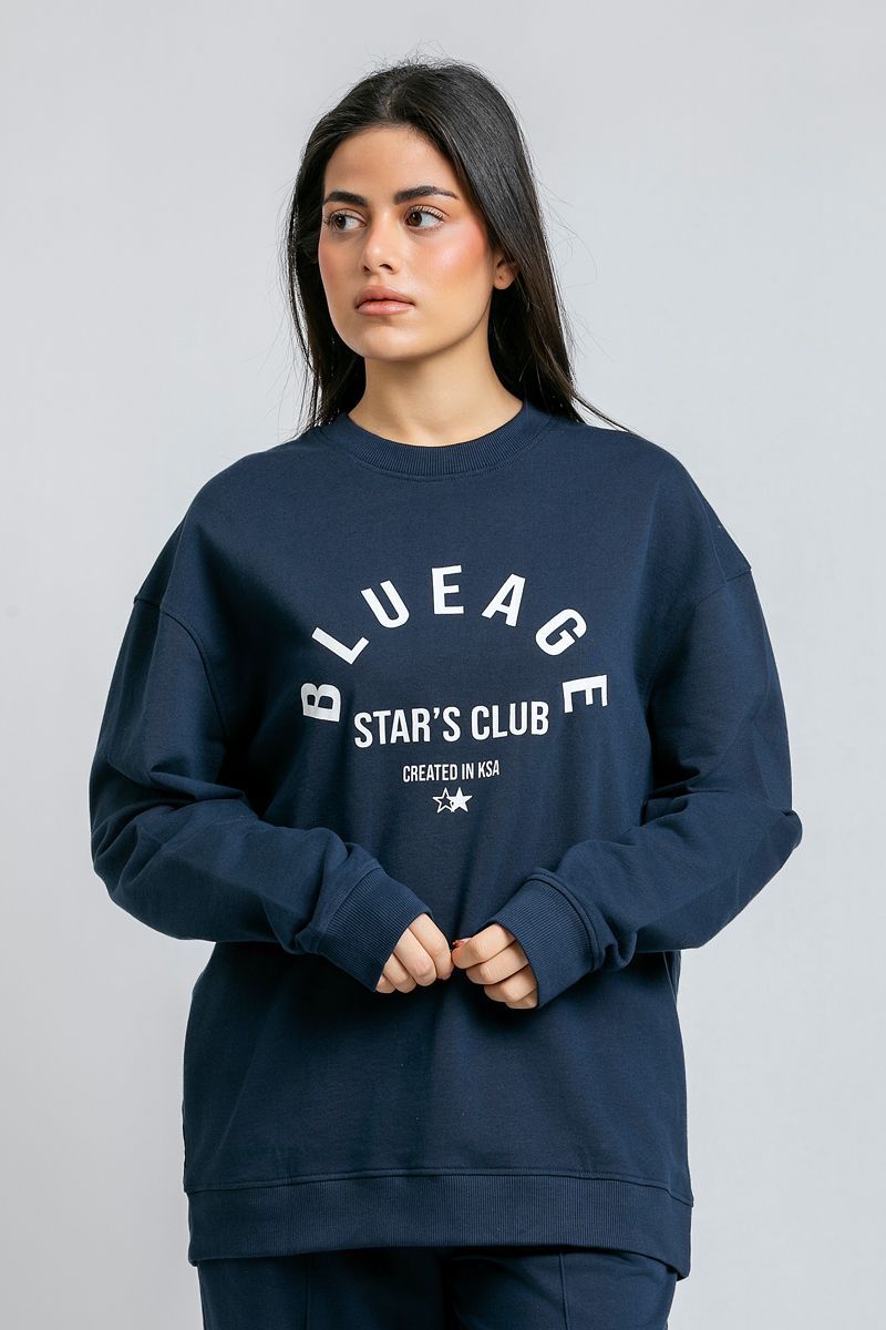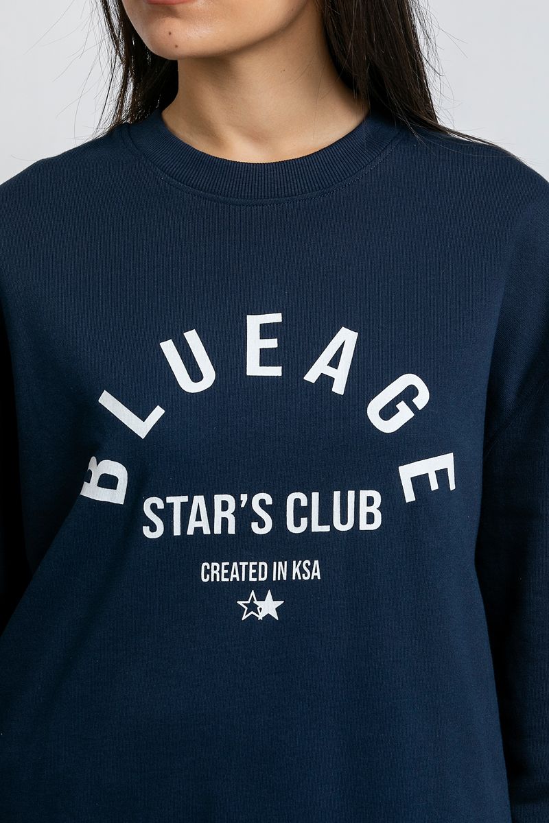 Unisex sweatshirt featuring a bold BLUEAGE Stars Club print on the front. Designed with a relaxed fit and ribbed cuffs and hem for a laid-back, comfortable style. Made from soft fleece fabric that provides warmth and a smooth feel against the skin. Ideal for casual everyday wear.