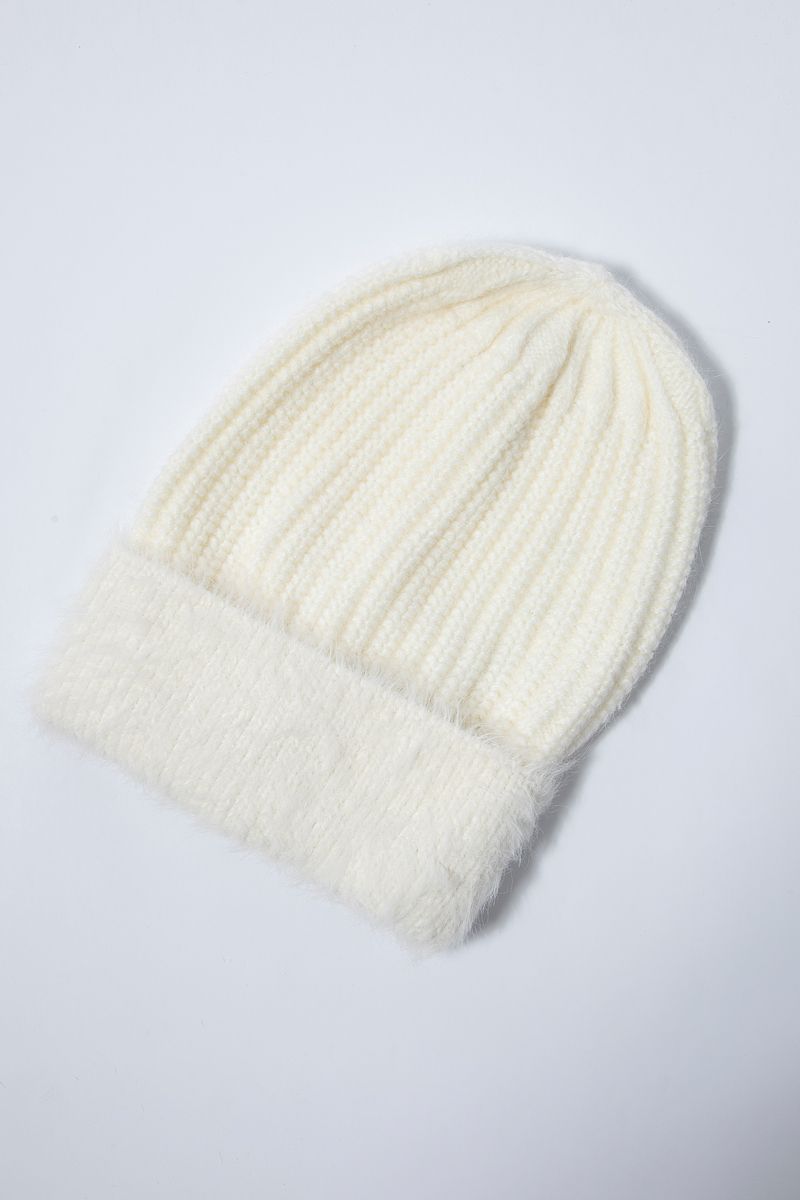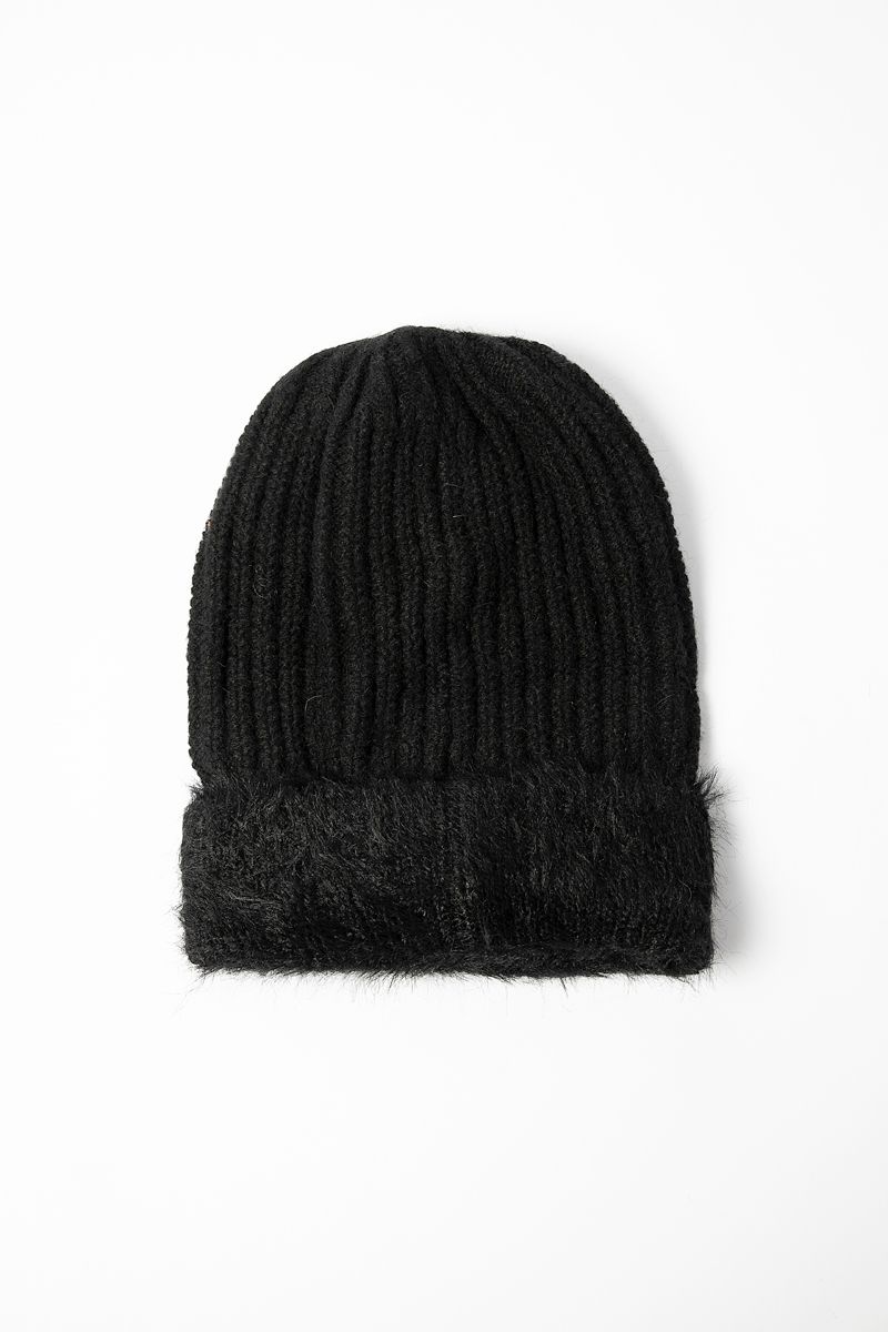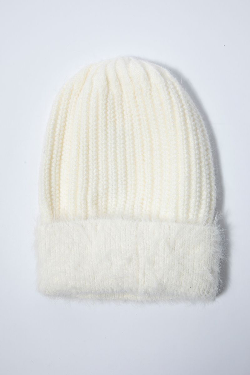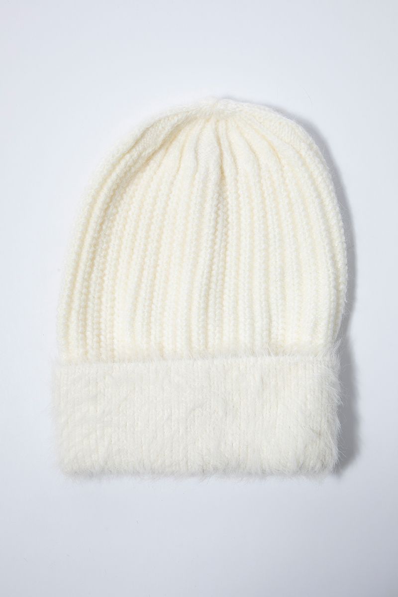 A ribbed knit beanie featuring a soft fuzzy cuff for added comfort and warmth. Stylish and cozy, perfect for cold weather wear.