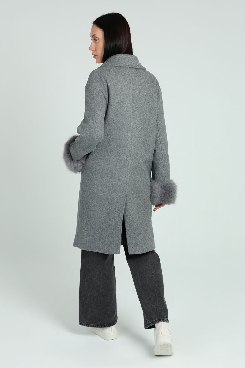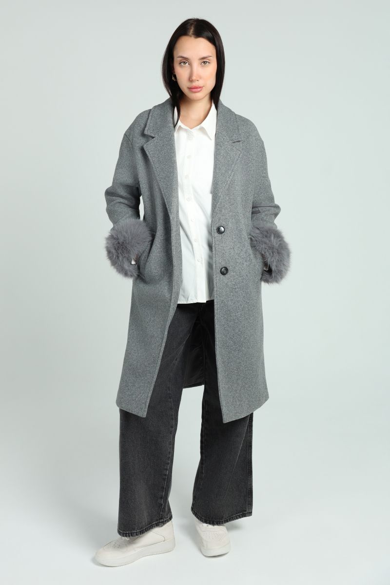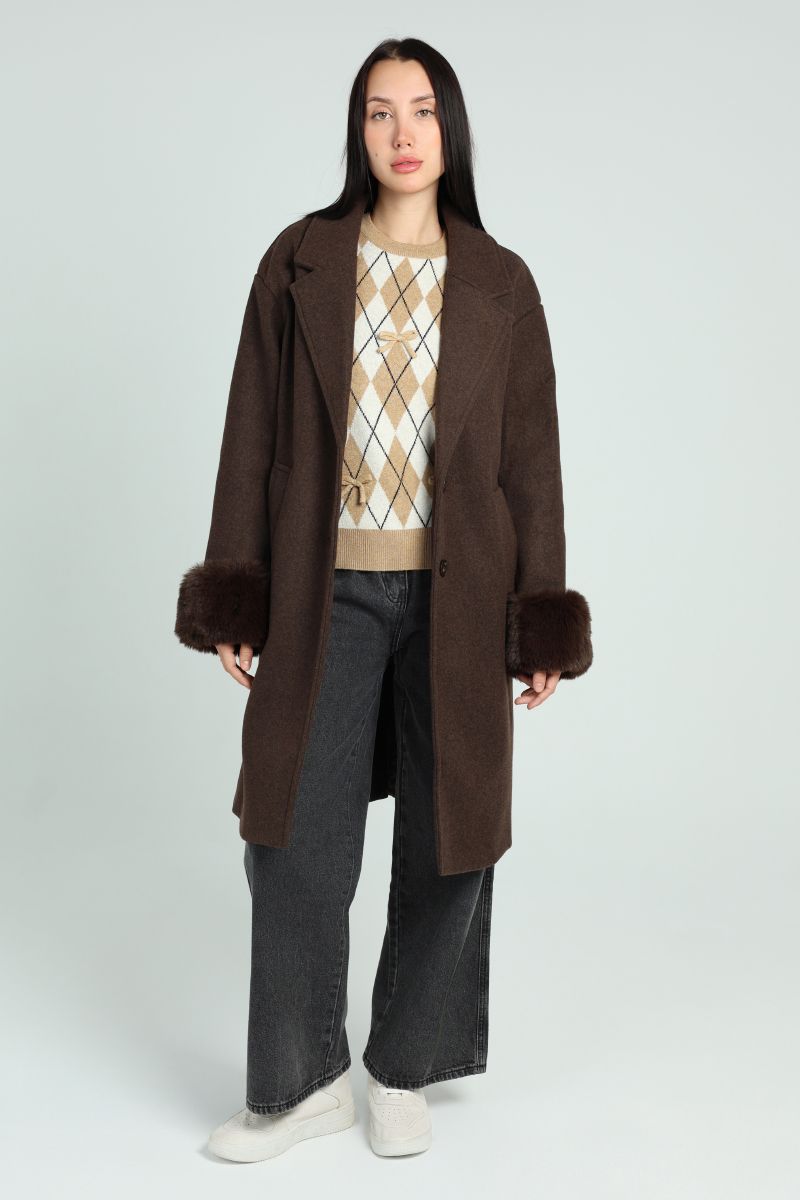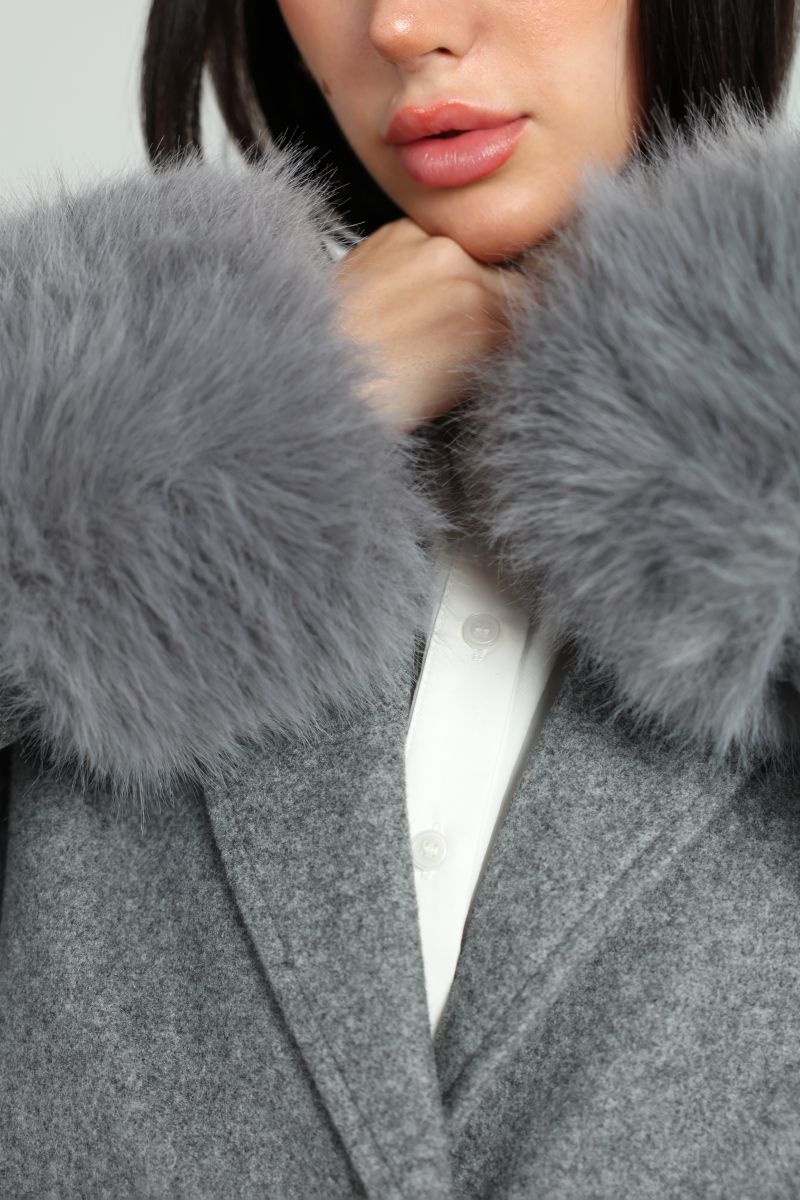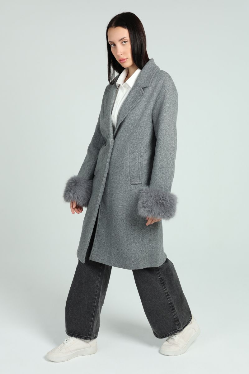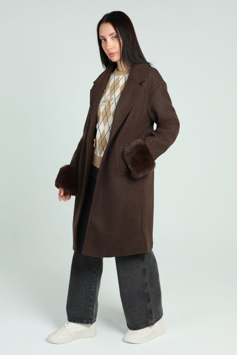 A sophisticated wool blend coat designed with a classic notch lapel and front button closure. The standout feature is the faux fur cuff detail, adding a touch of elegance and warmth. Finished with side pockets and a back vent for comfortable movement, perfect for elevating your winter wardrobe.