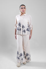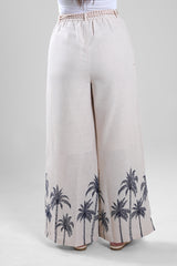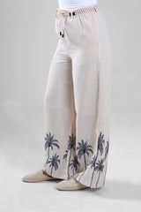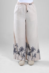 Women’s wide-leg pants designed with a relaxed fit and comfortable waistband for everyday wear. Features a decorative print along the lower section that adds character while keeping the overall look balanced. Easy to style with matching tops or simple blouses for a coordinated outfit.