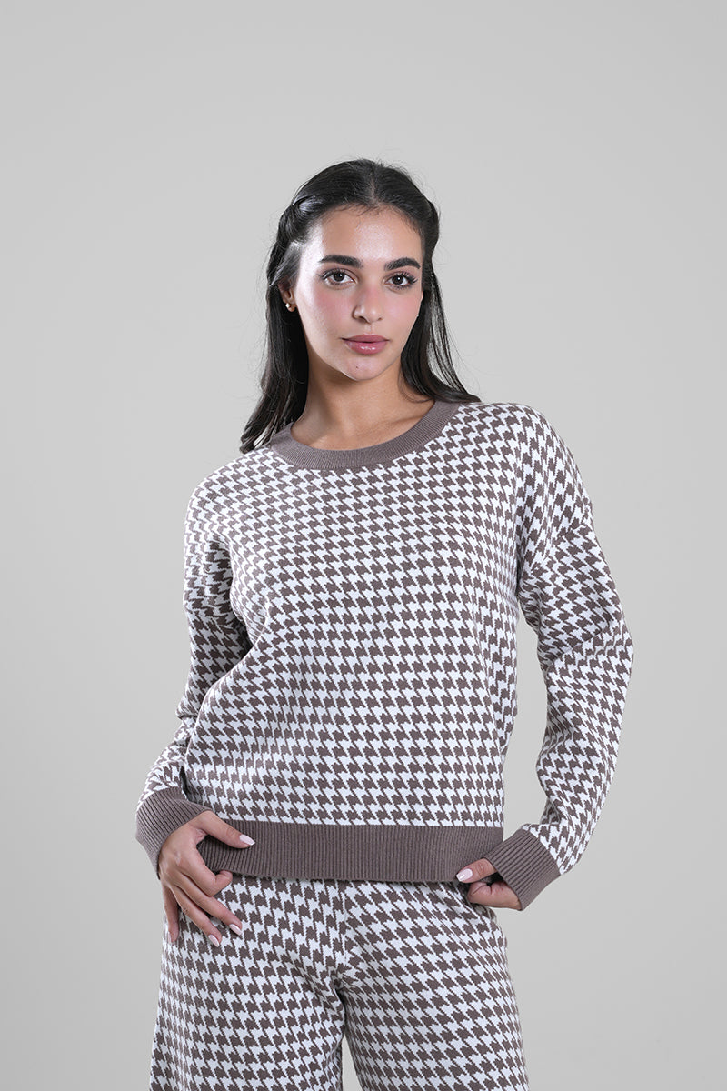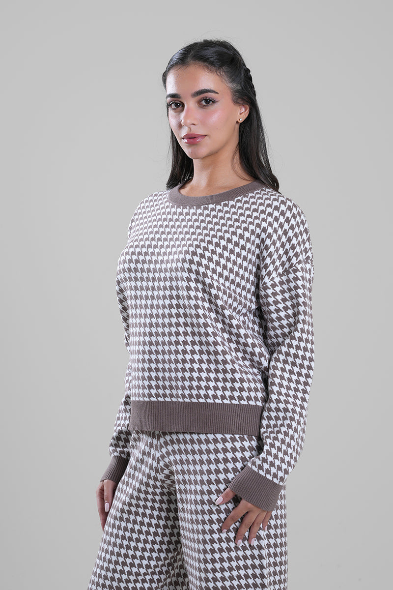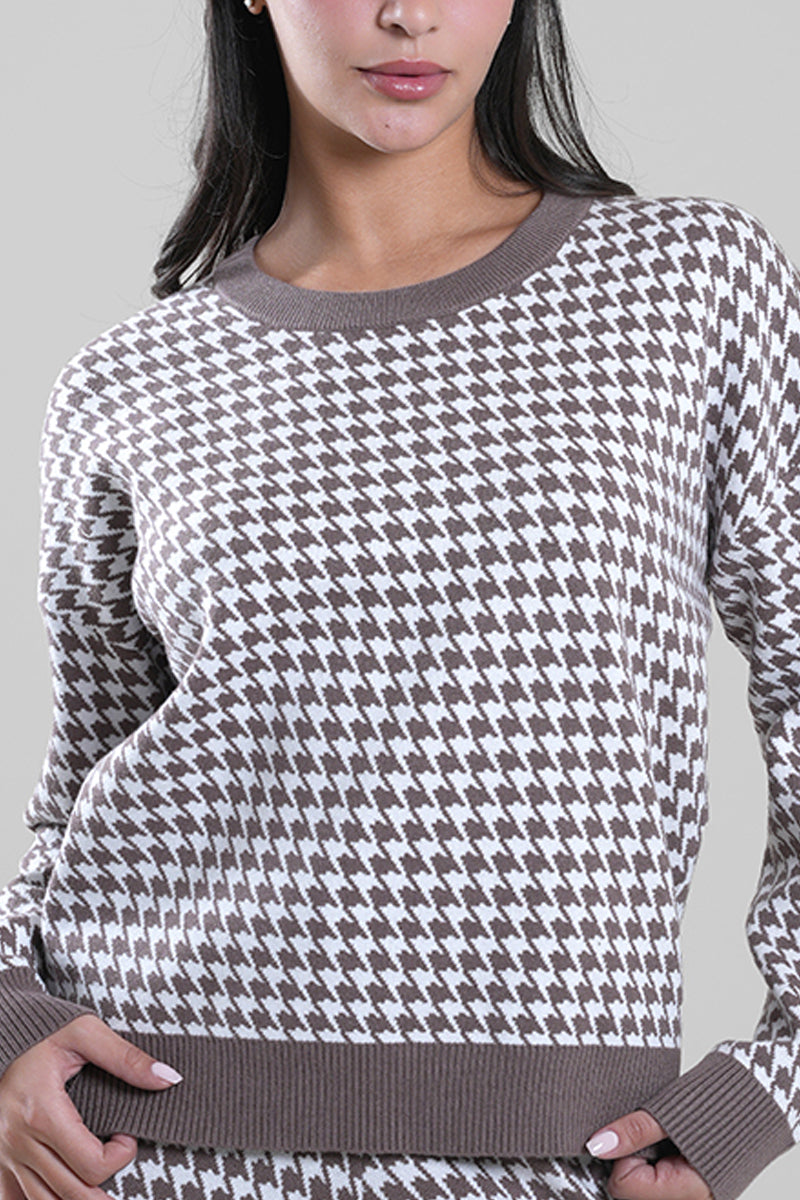 A soft knit sweater featuring an all-over houndstooth pattern with a classic round neckline. Designed with long sleeves and ribbed trims at the cuffs, hem, and neckline for a clean, structured finish. Easy to style for everyday wear, this sweater offers a comfortable fit while adding a polished touch to casual looks.