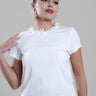 A refined short sleeve top featuring a round neckline accented with delicate floral embellishments. Designed with a relaxed fit and smooth fabric for comfortable wear. Suitable for everyday styling as well as elevated casual looks.
