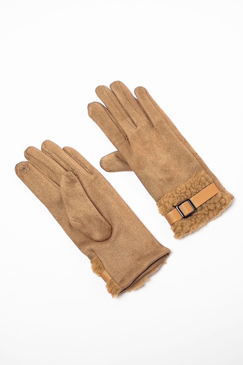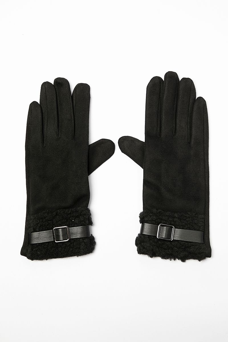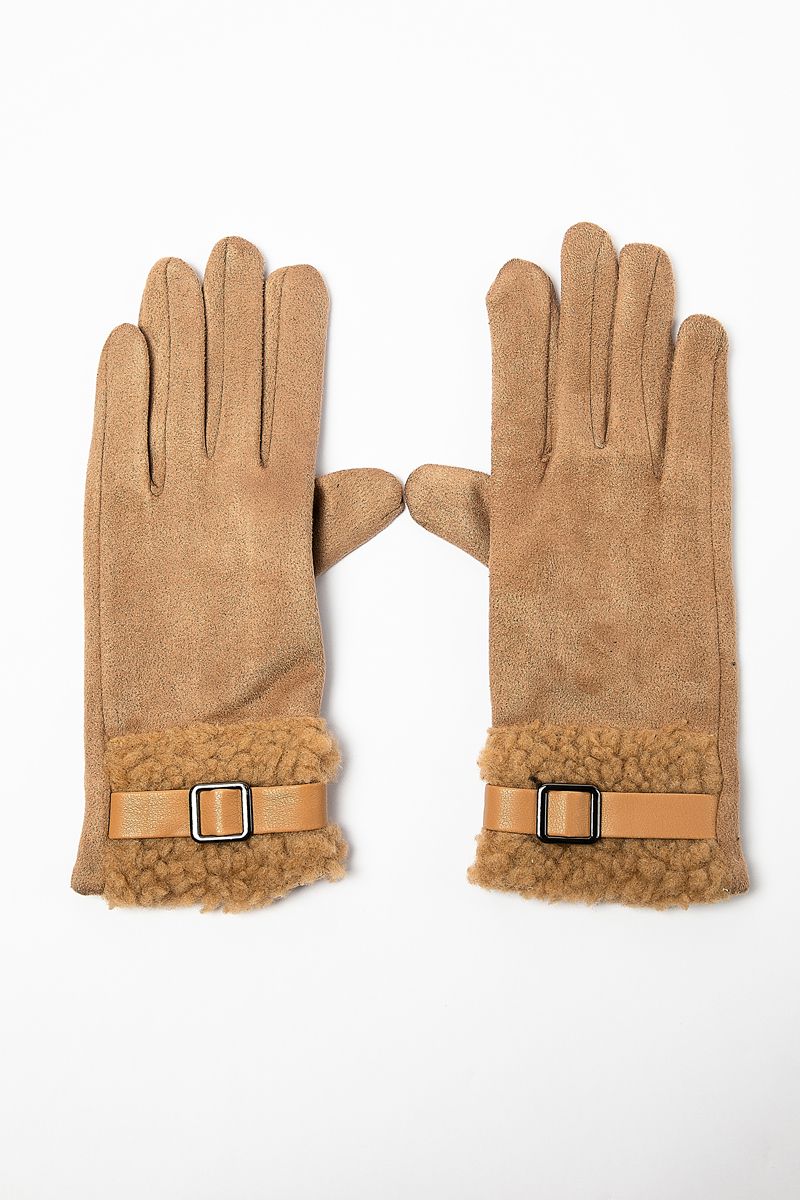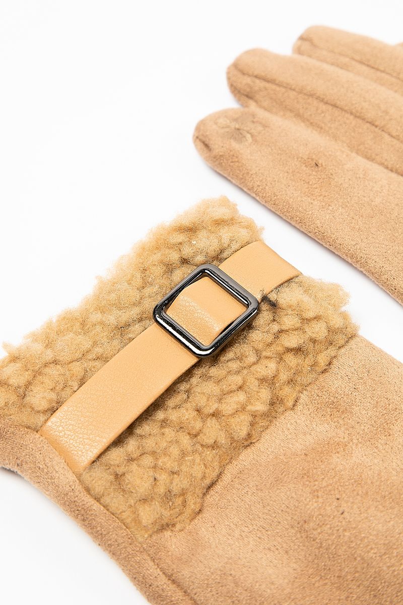 Warm faux suede gloves featuring a soft shearling trim and a sleek buckle detail at the wrist. Designed for comfort and a refined winter look, offering both style and warmth for cold-weather days.