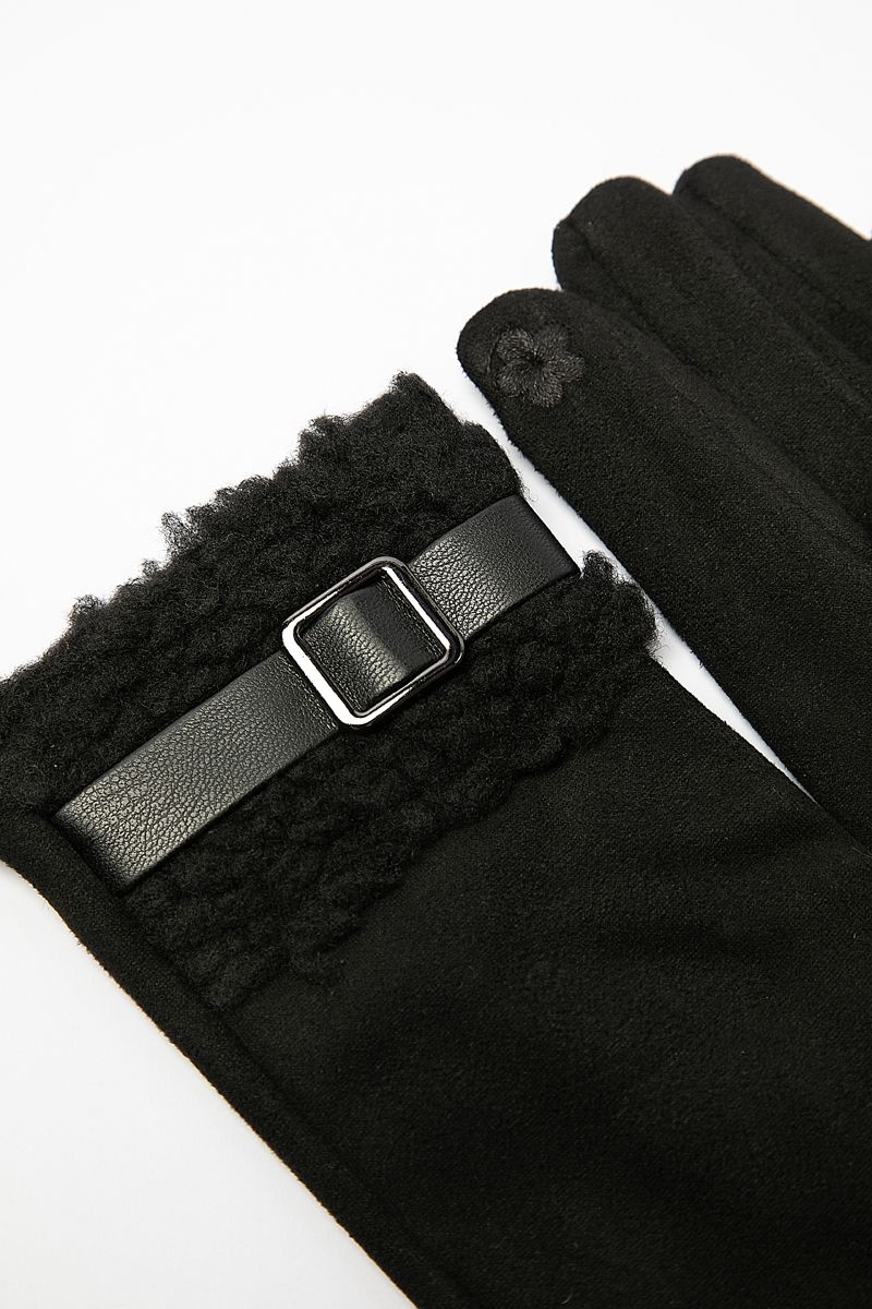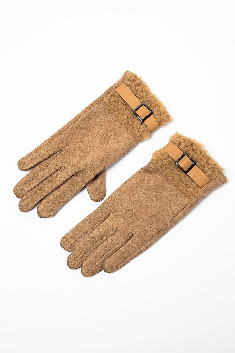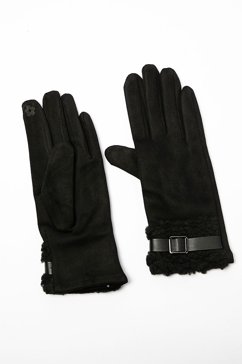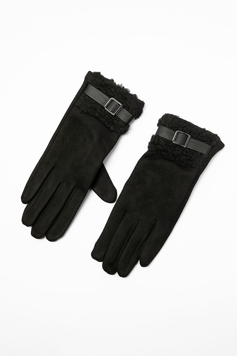 Warm faux suede gloves featuring a soft shearling trim and a sleek buckle detail at the wrist. Designed for comfort and a refined winter look, offering both style and warmth for cold-weather days.