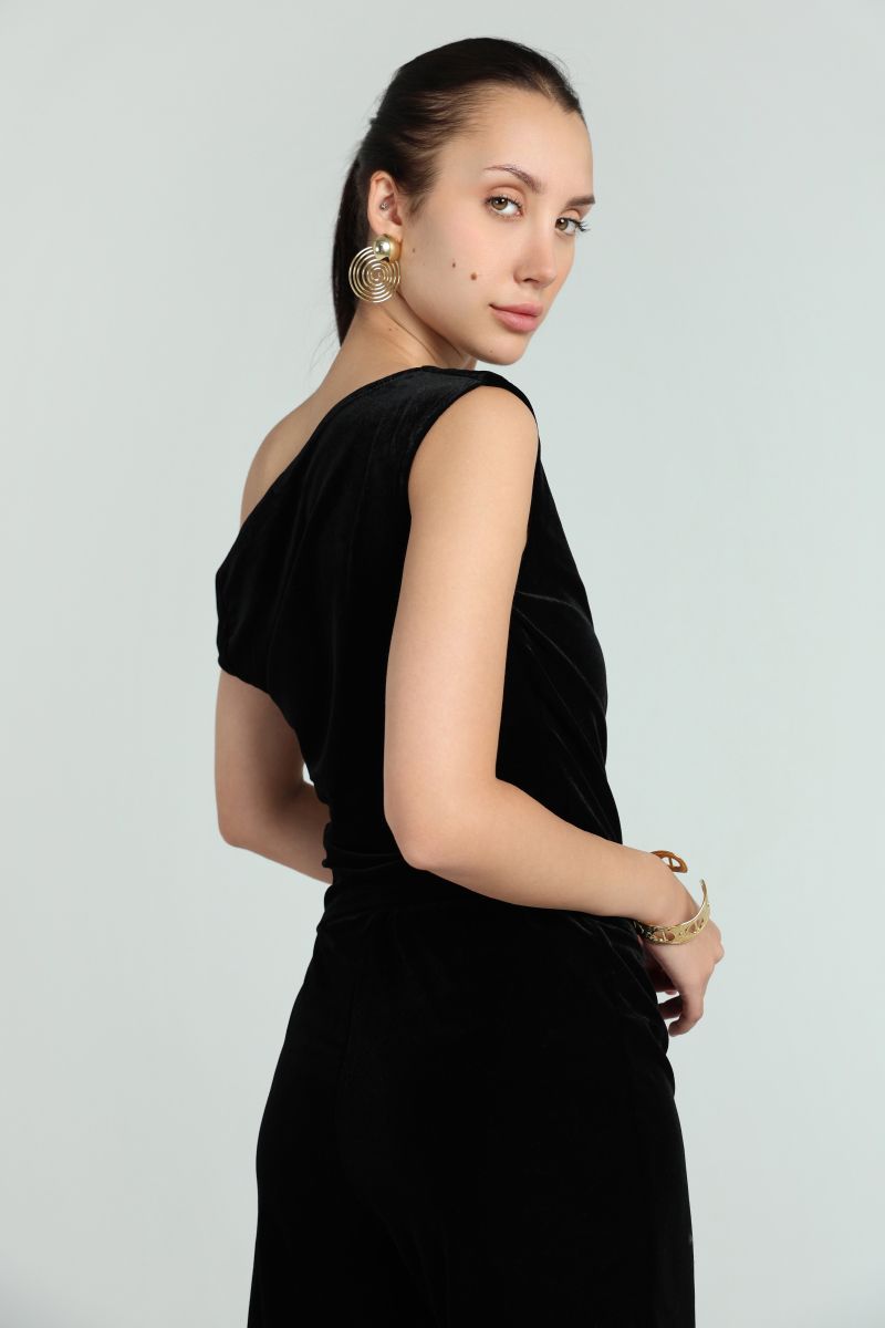 A refined velvet top featuring a chic one-shoulder neckline and a draped fit. Perfect for elevating evening looks with timeless elegance.