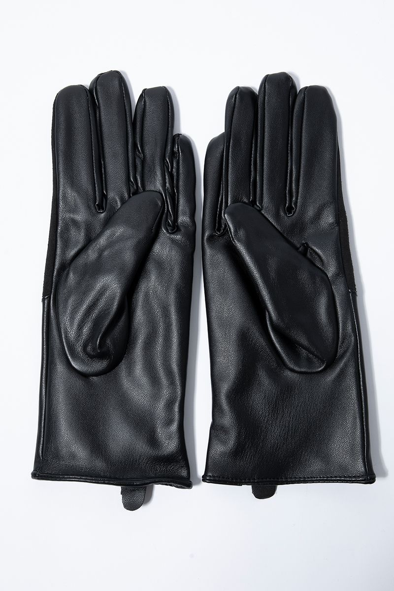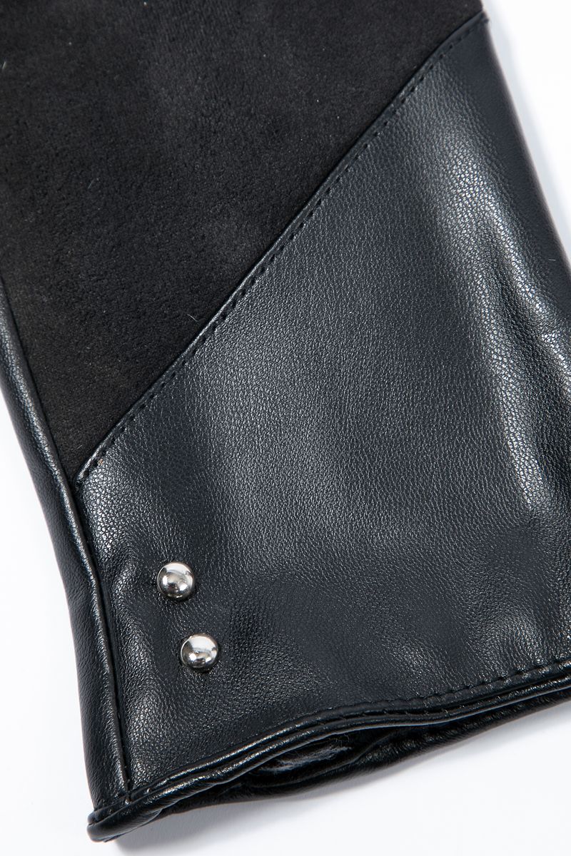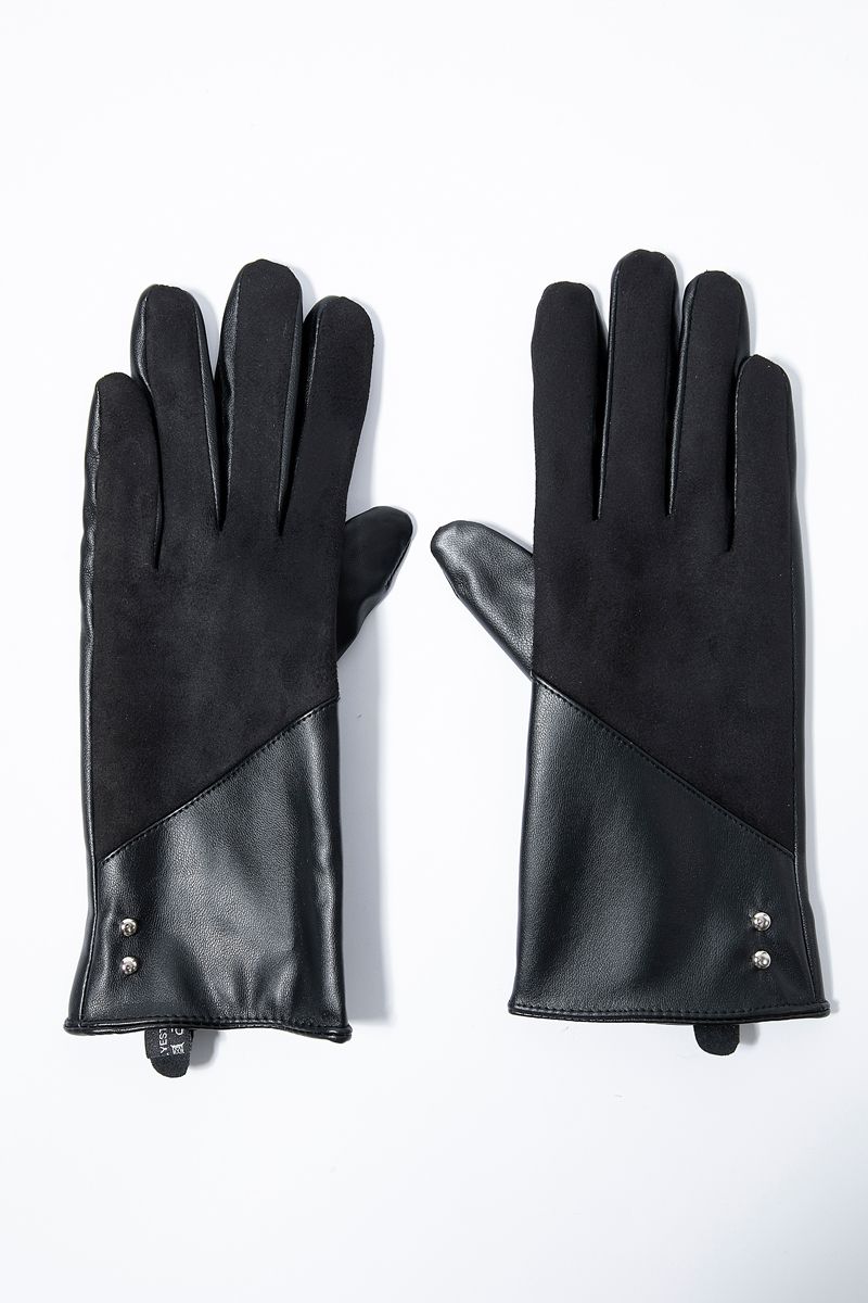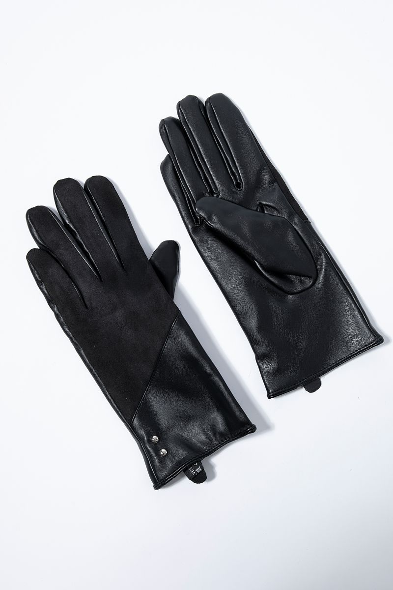 Chic gloves featuring a stylish blend of smooth faux leather and soft suede. Accented with subtle metallic studs at the wrist for a modern finish, offering both elegance and warmth for cooler days.