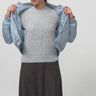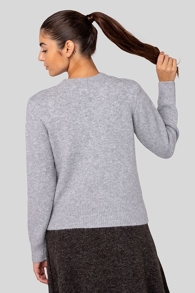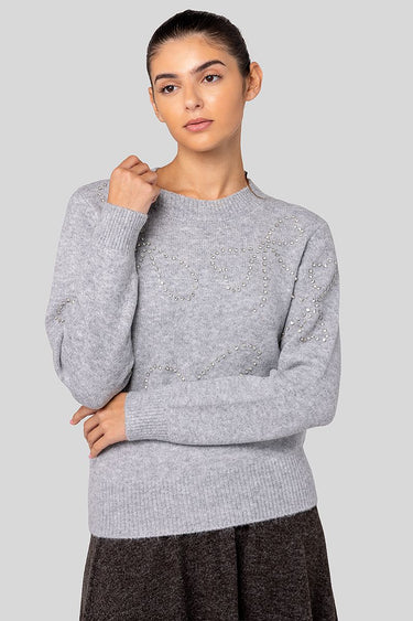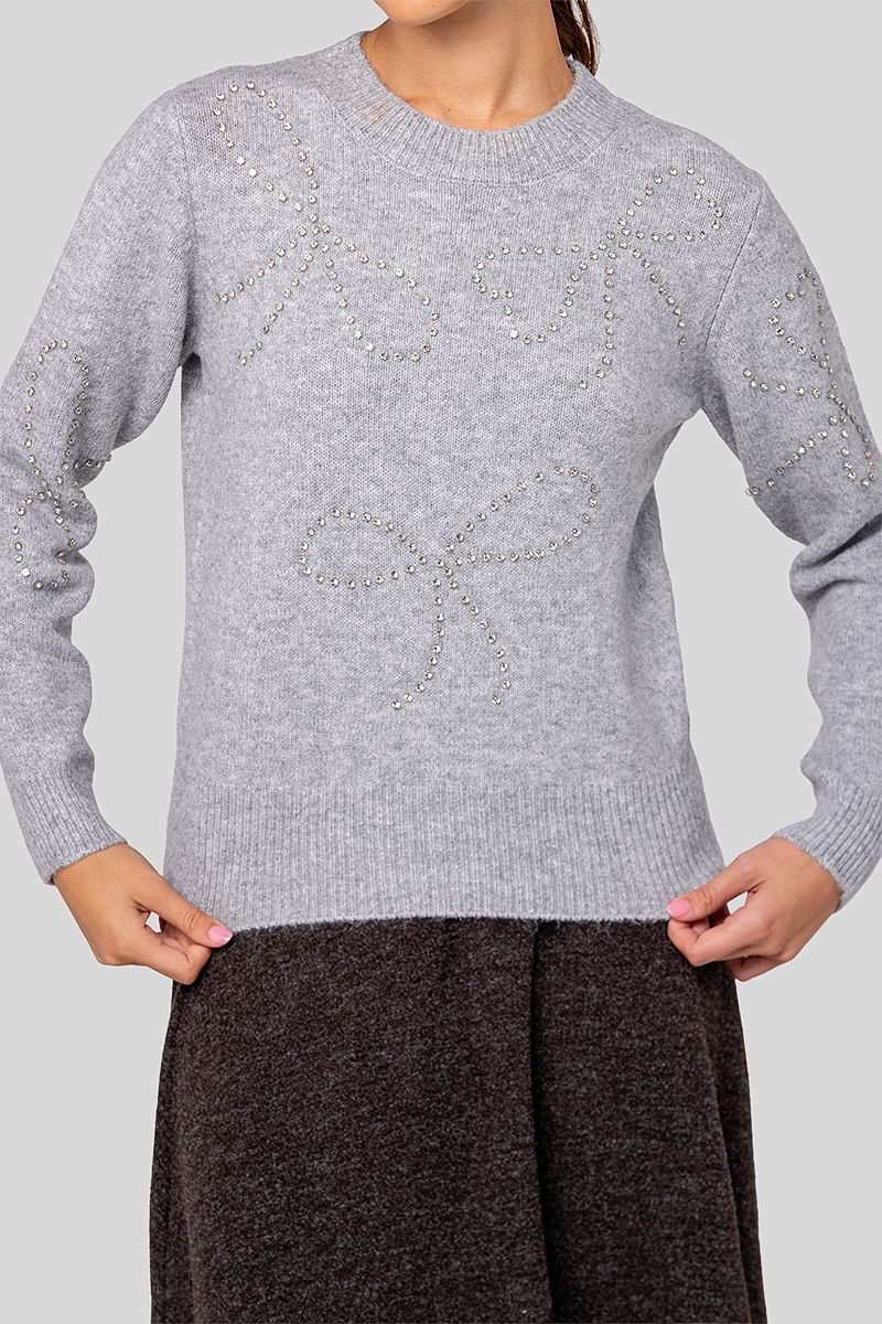 A soft knitted sweater designed with long sleeves and a classic crew neckline. Adorned with delicate bow-shaped embellishments made of tiny metallic studs for a refined feminine touch. Perfect for cozy everyday wear with a modern twist.
