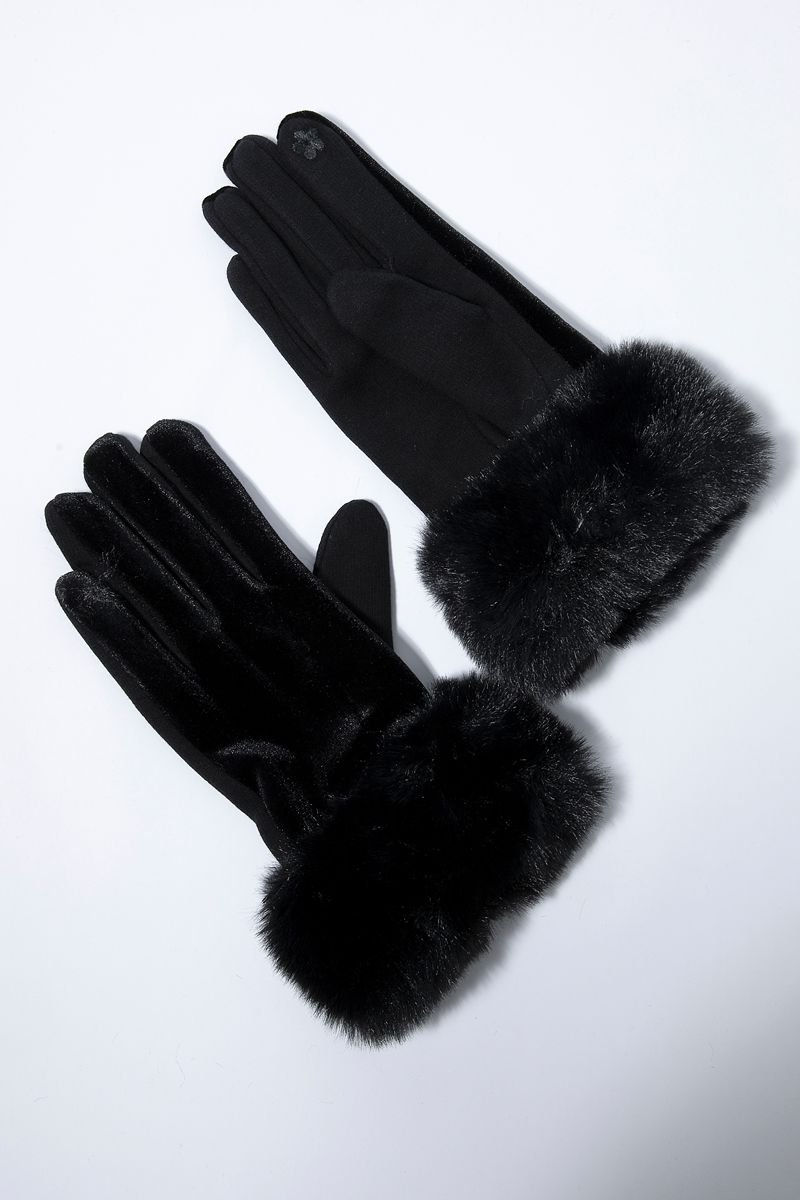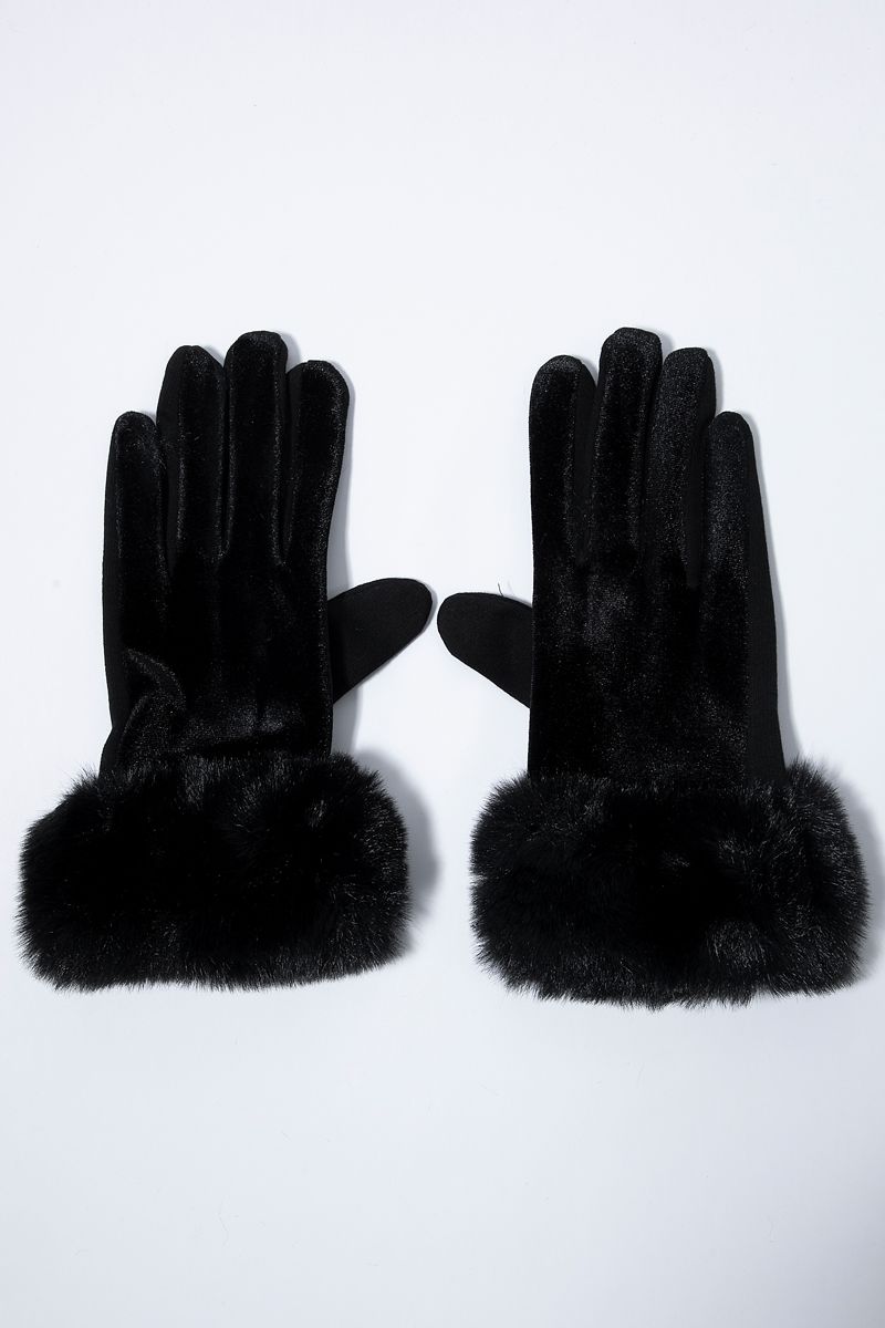 Elegant velvet gloves finished with a plush faux fur trim at the wrist Soft and stylish design provides warmth and sophistication perfect for cold weather wear
