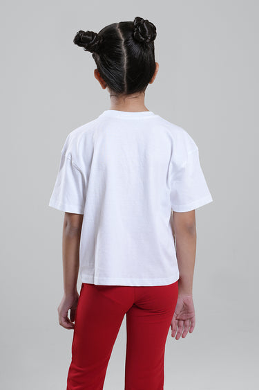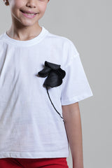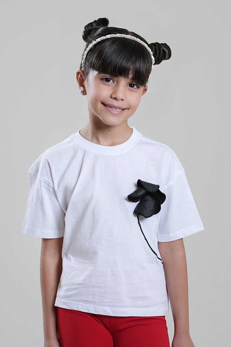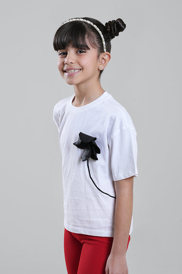A stylish girls’ cotton T-shirt featuring a soft, comfortable fit and a statement floral appliqué accent on the chest. Designed with a classic round neckline and short sleeves, this top blends everyday comfort with a subtle fashion twist. Easy to pair with leggings, trousers, or skirts for casual or semi-dressy looks.