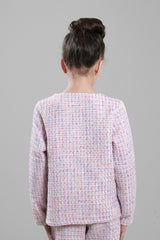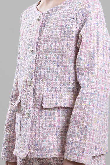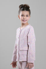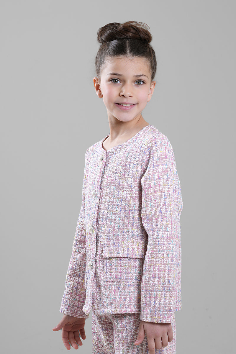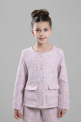A classic girls’ jacket designed with a refined textured fabric and a clean button-front closure. Featuring a structured silhouette with front pockets, this jacket adds a polished touch to both formal and smart-casual outfits. Ideal for special occasions, family events, or elegant everyday styling.