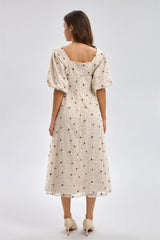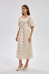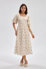 Women's midi dress designed with a soft structured fit and delicate embroidered pattern that adds elegance without excess The balanced silhouette offers comfort and a flattering shape suitable for daily wear gatherings and special occasions Easy to style with heels or flats making it a versatile choice for modern modest fashion and a refined wardrobe essential for women in Saudi Arabia