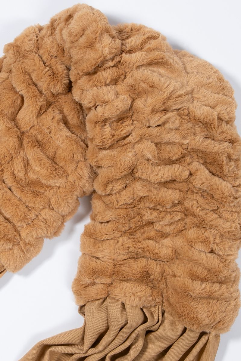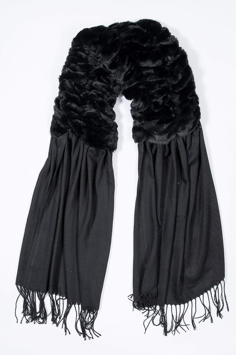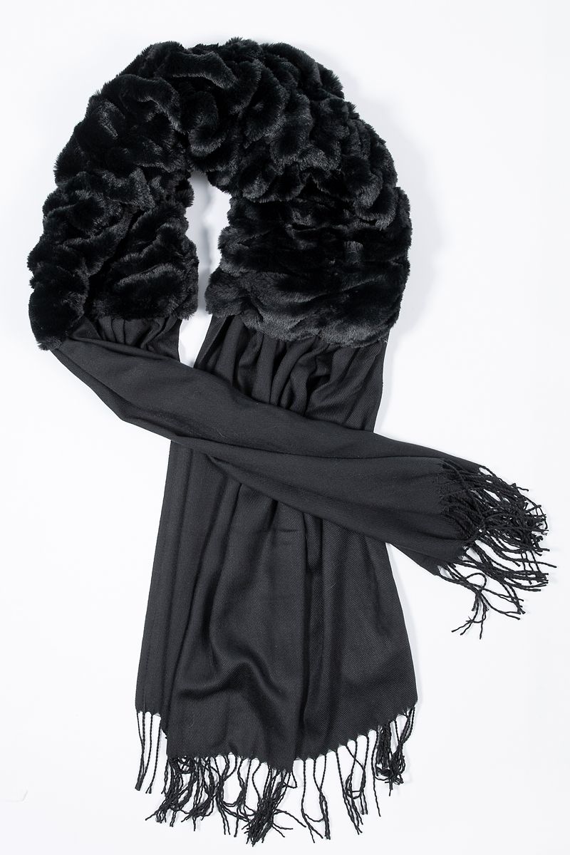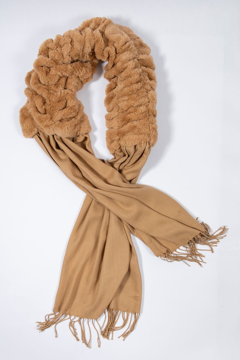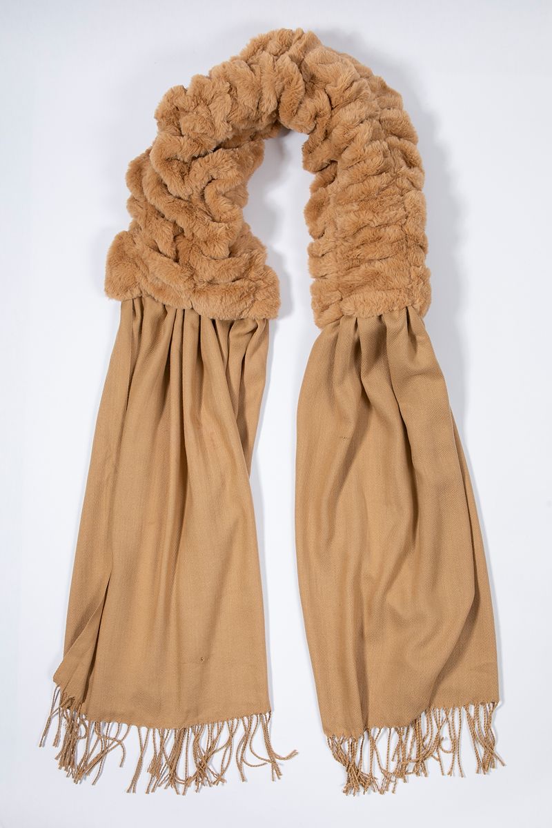 Elegant scarf combining soft faux fur with flowing fabric ends, finished with delicate tassels. A stylish accessory that blends warmth and sophistication for versatile wear.