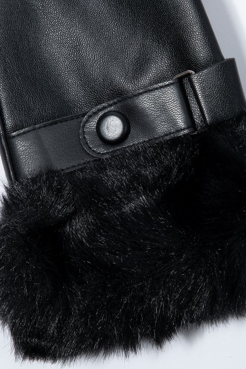 Sophisticated gloves crafted from smooth faux leather with a plush faux fur cuff for added warmth and style. Designed with a sleek button detail at the wrist, combining practicality with an elegant finish.