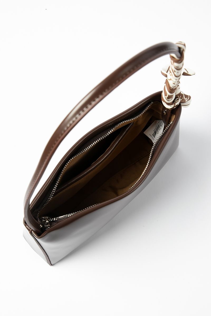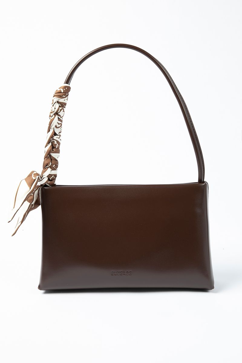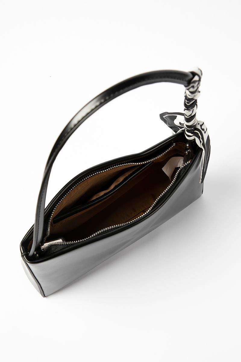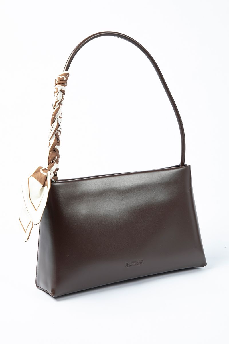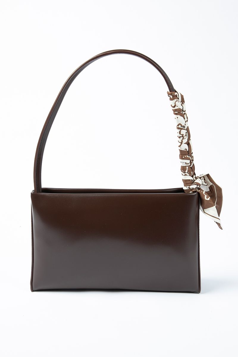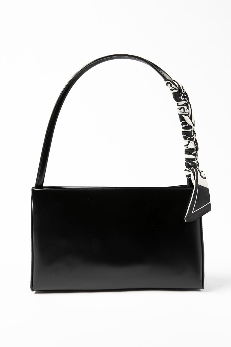 An elegant shoulder bag crafted with a sleek finish, featuring a stylish scarf detail on the handle. Includes a detachable strap for versatile wear, making it a refined choice for day or evening looks.