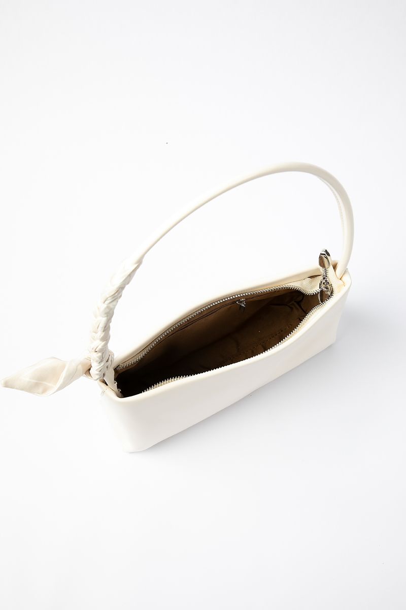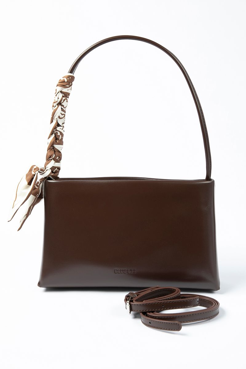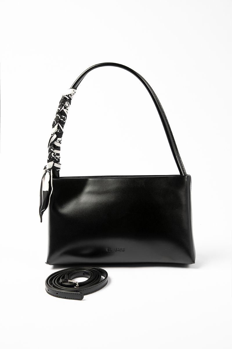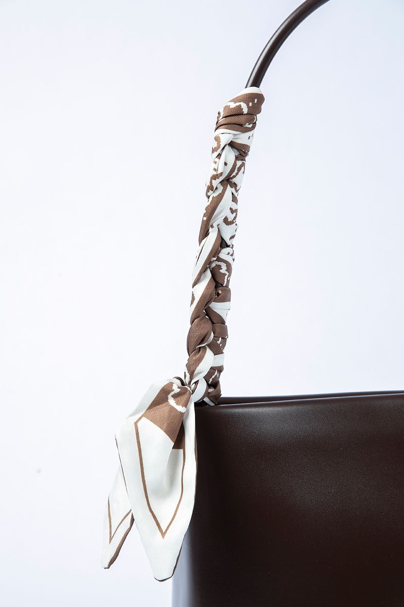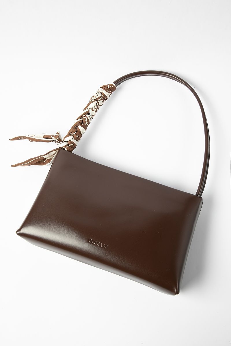 An elegant shoulder bag crafted with a sleek finish, featuring a stylish scarf detail on the handle. Includes a detachable strap for versatile wear, making it a refined choice for day or evening looks.