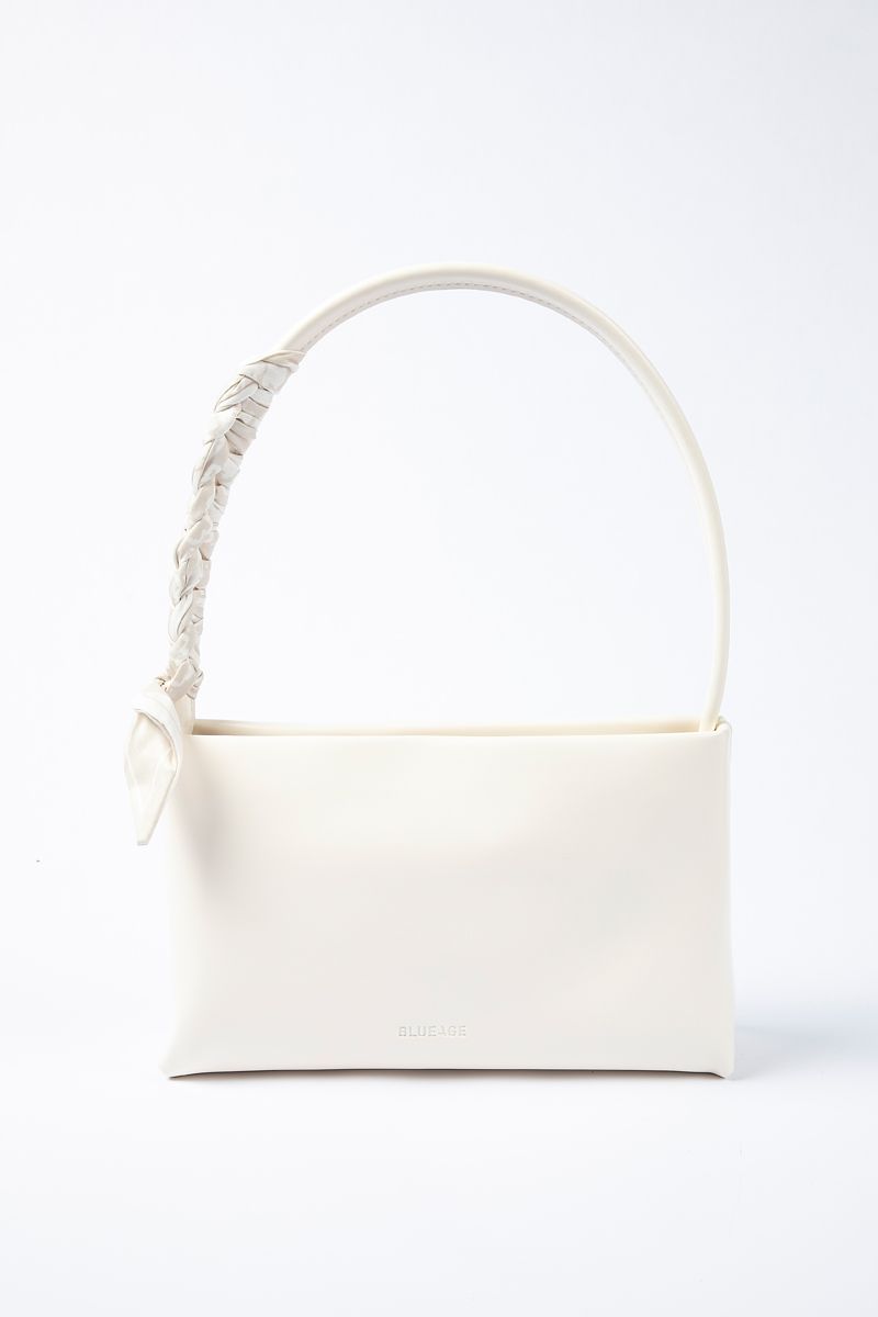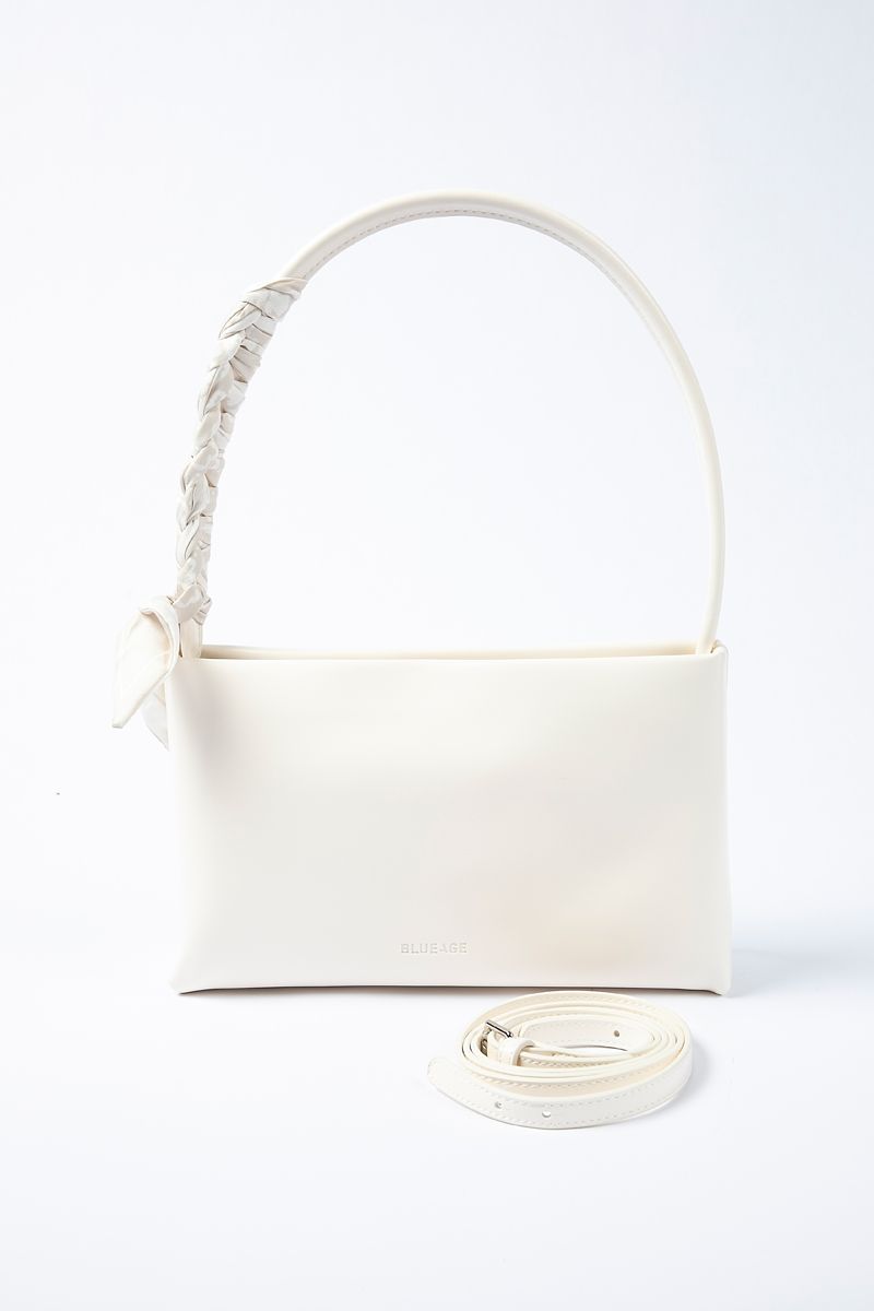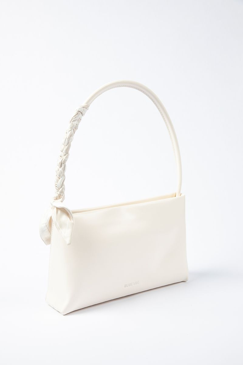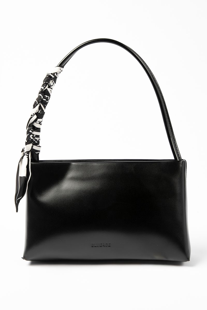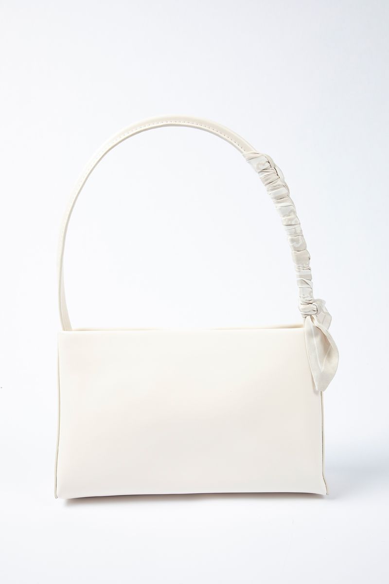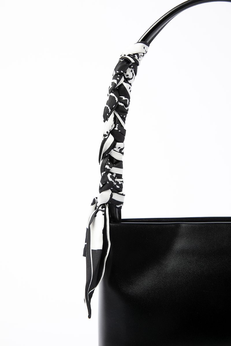 An elegant shoulder bag crafted with a sleek finish, featuring a stylish scarf detail on the handle. Includes a detachable strap for versatile wear, making it a refined choice for day or evening looks.