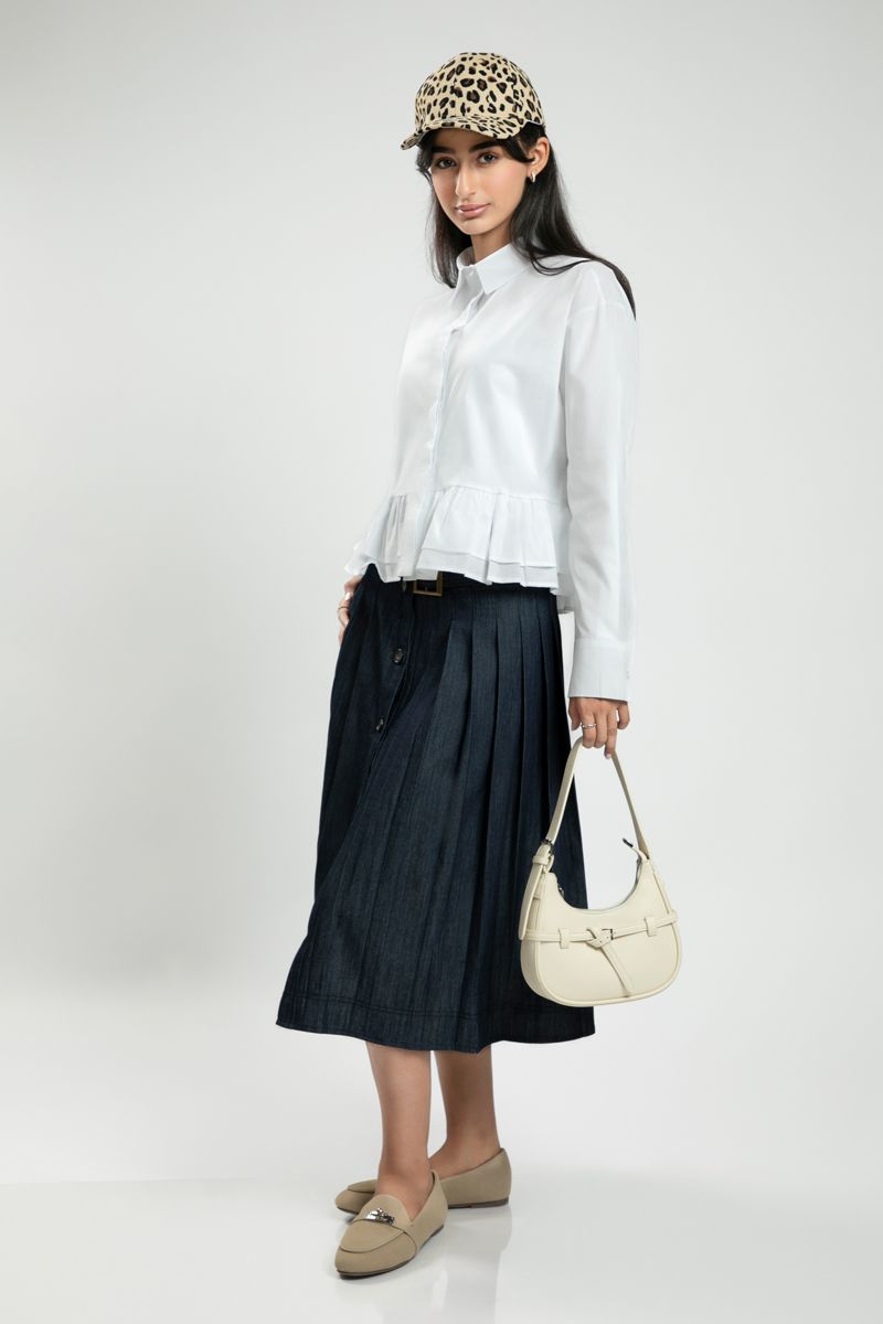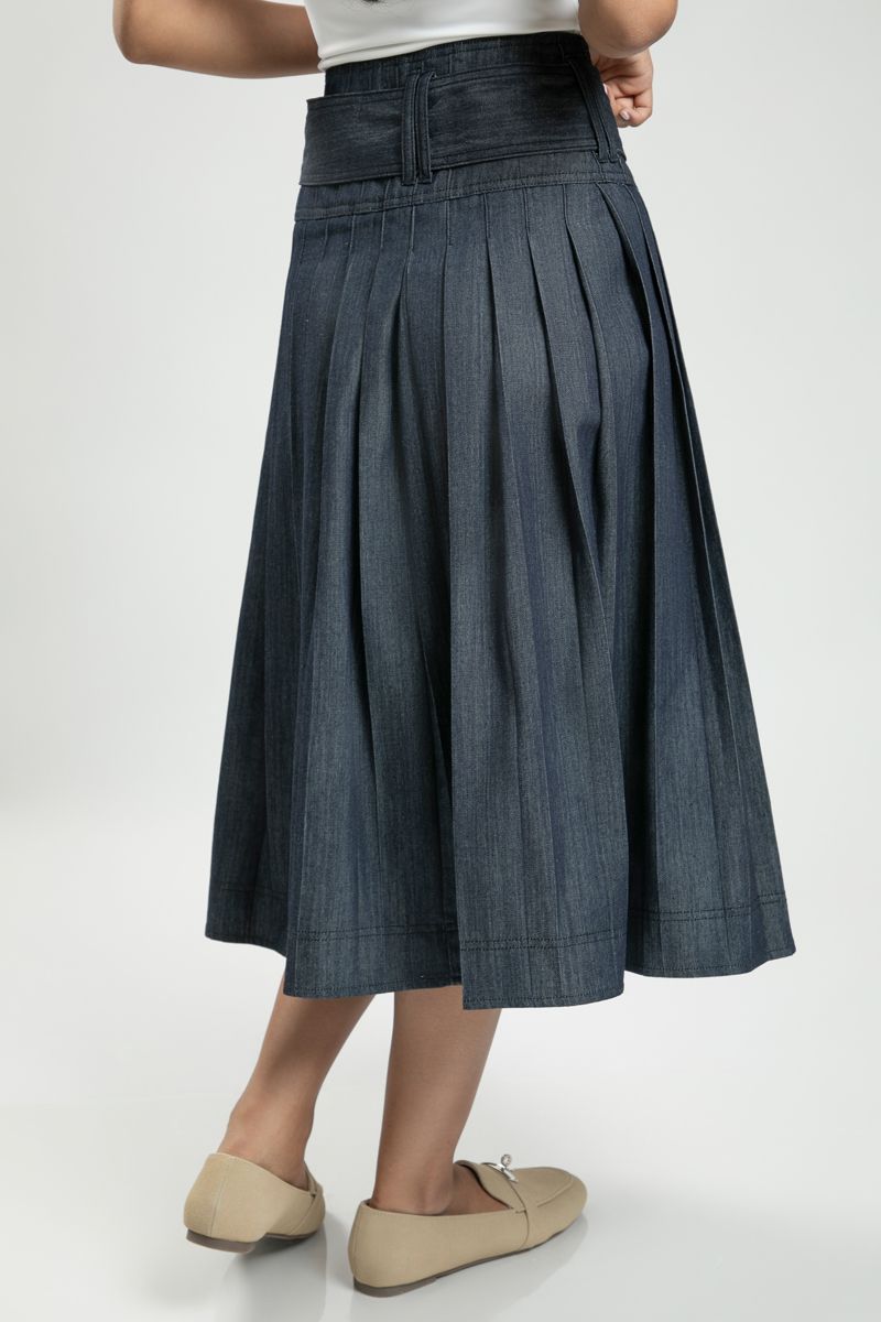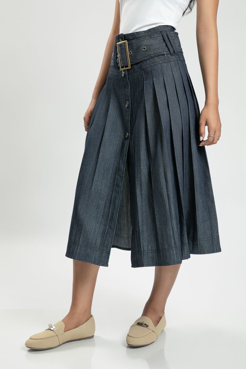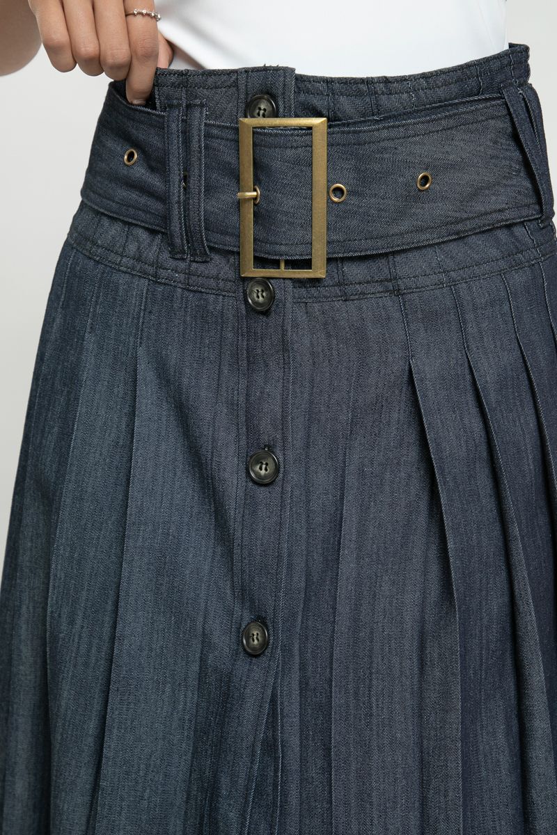 This midi denim skirt brings structure and flair with its full pleats, high front slit, and classic solid color. Designed with front buttons and a wide buckle belt at the waist, it offers a flattering silhouette that pairs perfectly with casual or elevated tops for an effortlessly chic look.