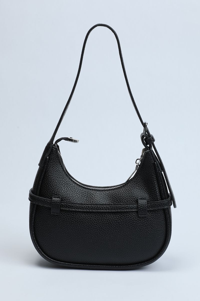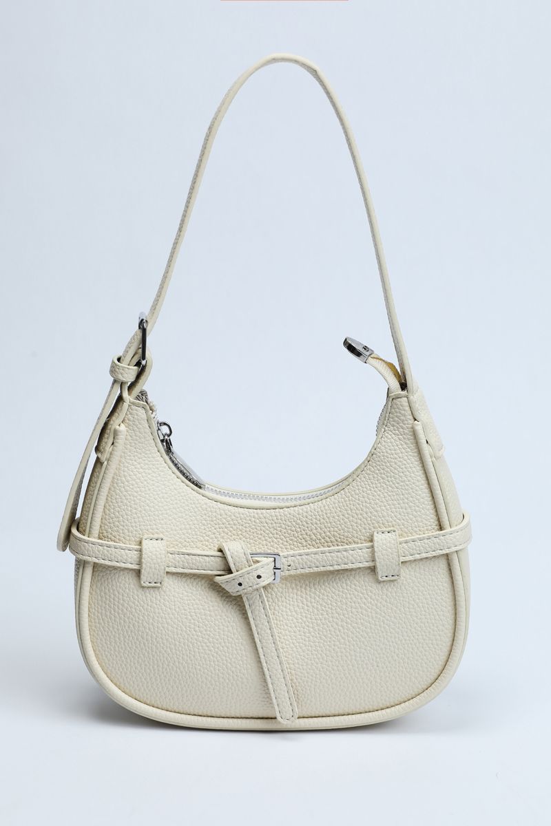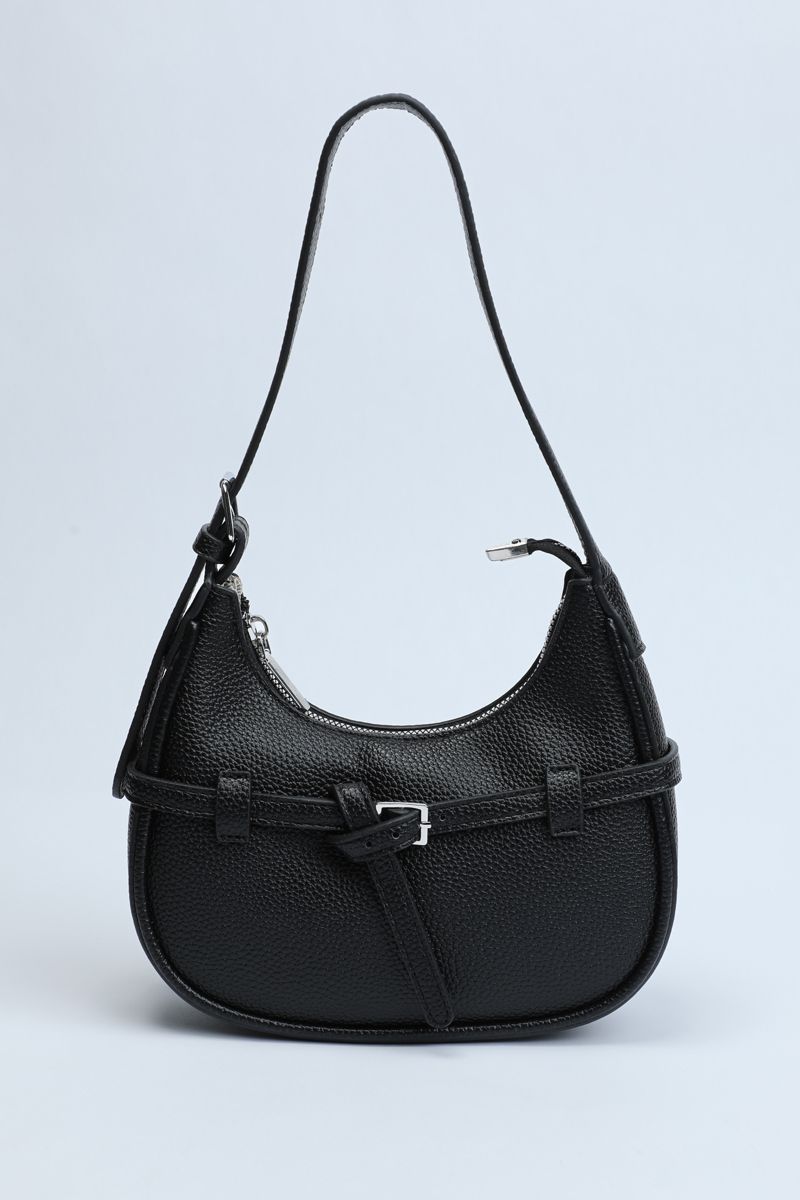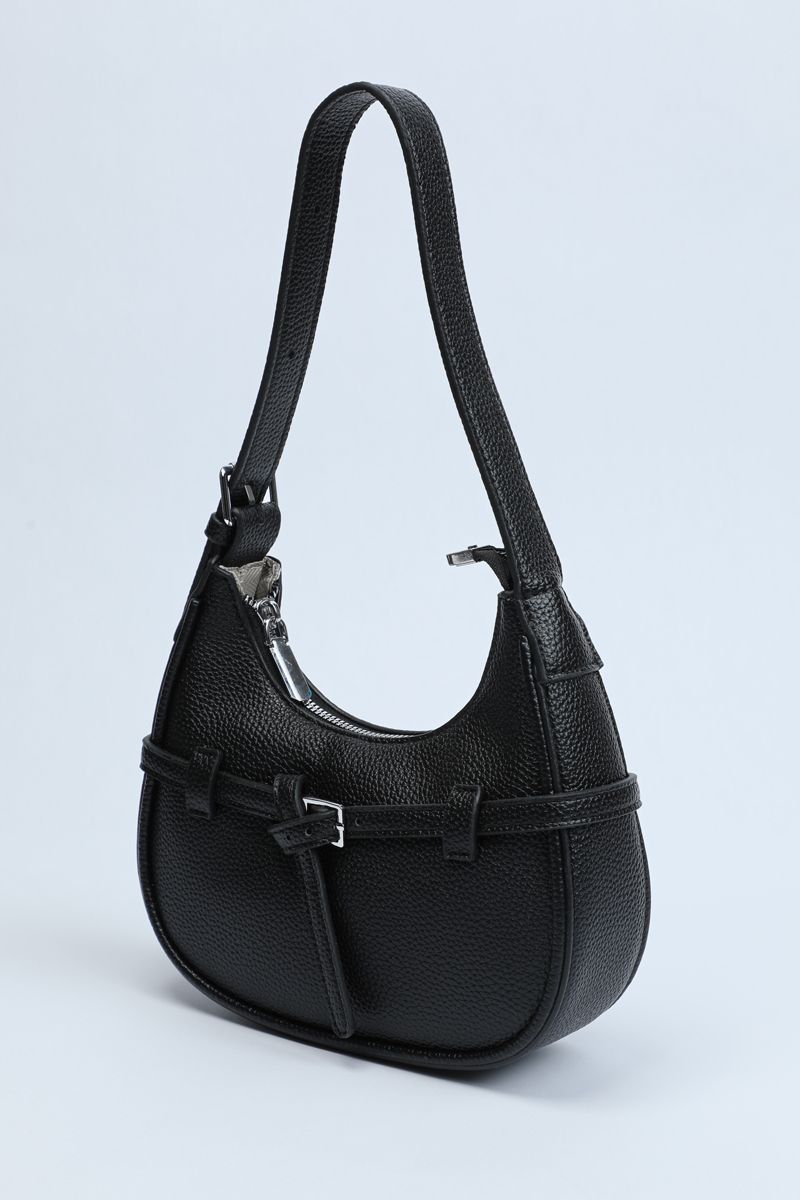 Carry style and practicality with this perfectly sized shoulder bag, ideal for everyday outings. Crafted from textured synthetic leather in a solid color, it features a chic strap belt detail wrapped around with a buckle accent. The main zippered compartment keeps your essentials secure, while the adjustable buckled shoulder strap ensures comfortable wear all day long