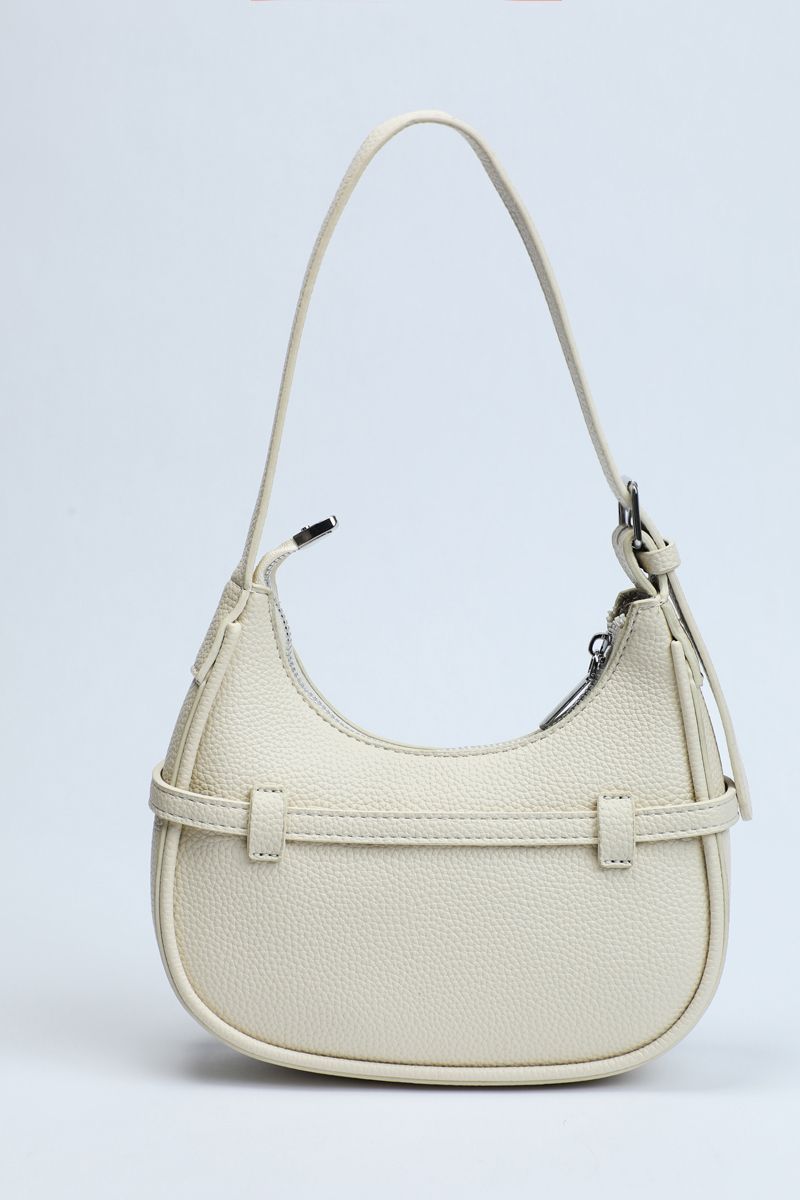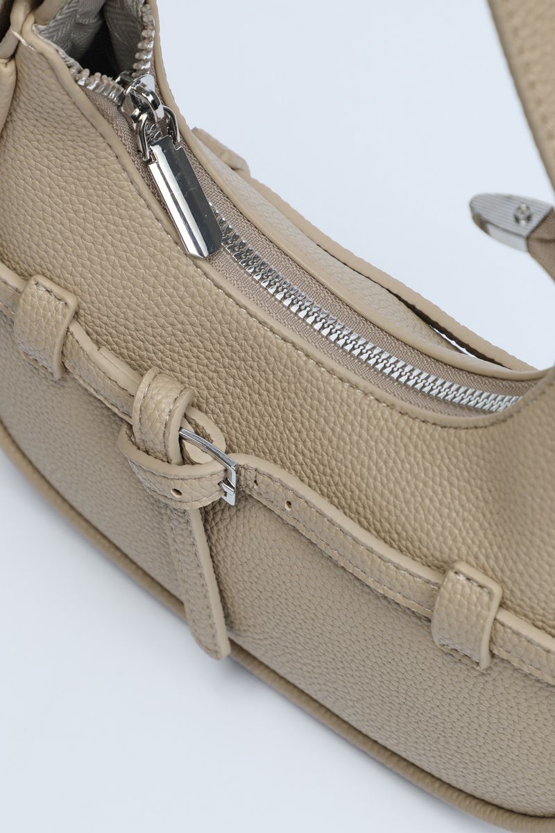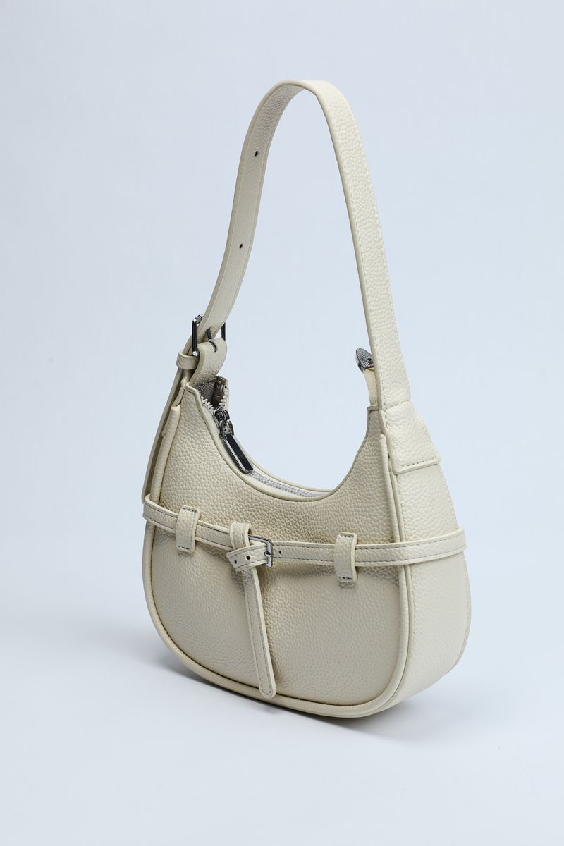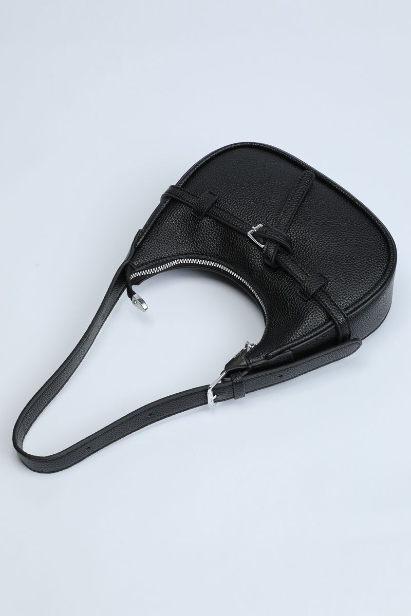 Carry style and practicality with this perfectly sized shoulder bag, ideal for everyday outings. Crafted from textured synthetic leather in a solid color, it features a chic strap belt detail wrapped around with a buckle accent. The main zippered compartment keeps your essentials secure, while the adjustable buckled shoulder strap ensures comfortable wear all day long
