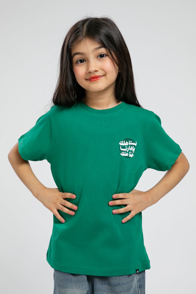 Unisex T shirt for kids featuring front and back Arabic graphic with a bold globe inspired design Made in a soft breathable fabric with short sleeves and a relaxed silhouette for daily comfort and effortless cool