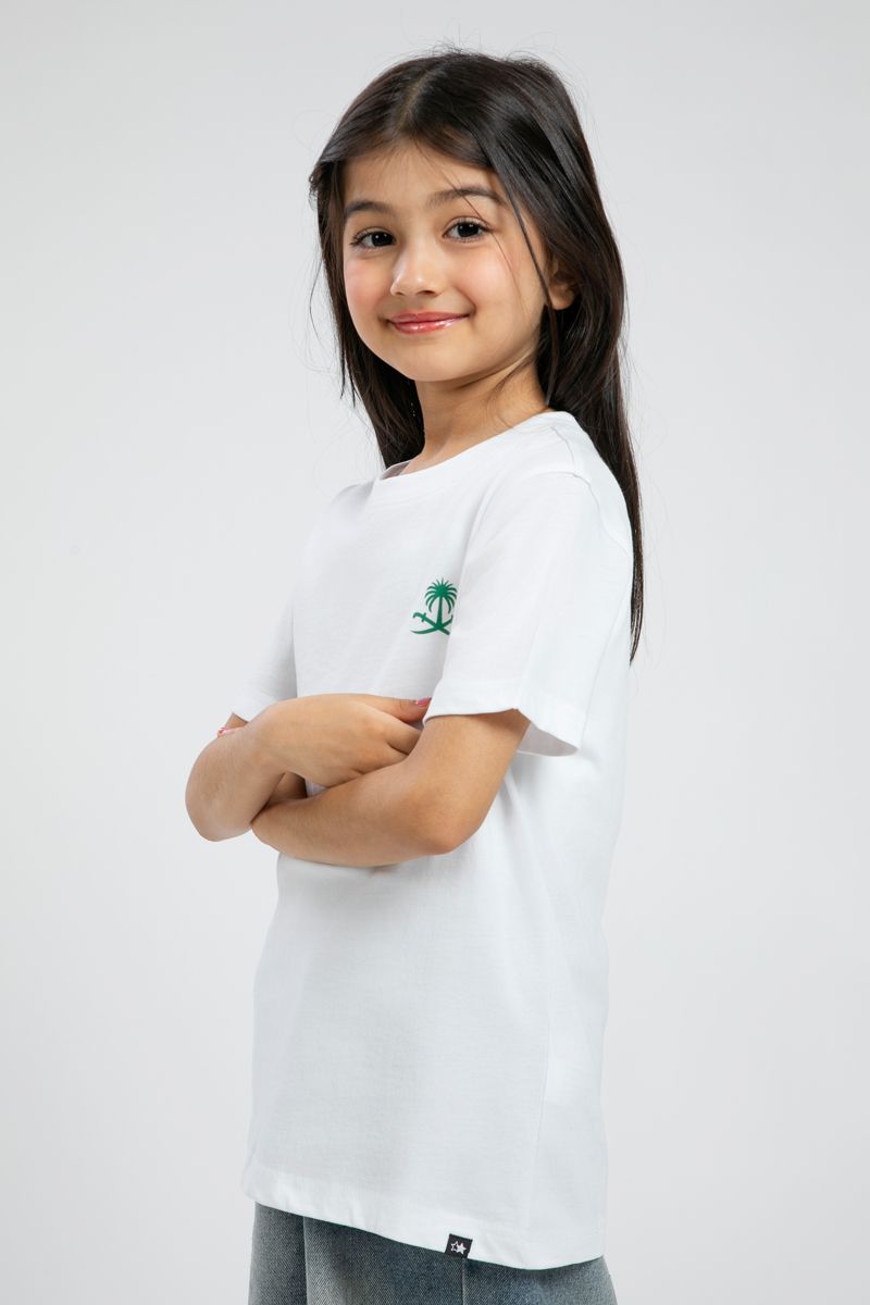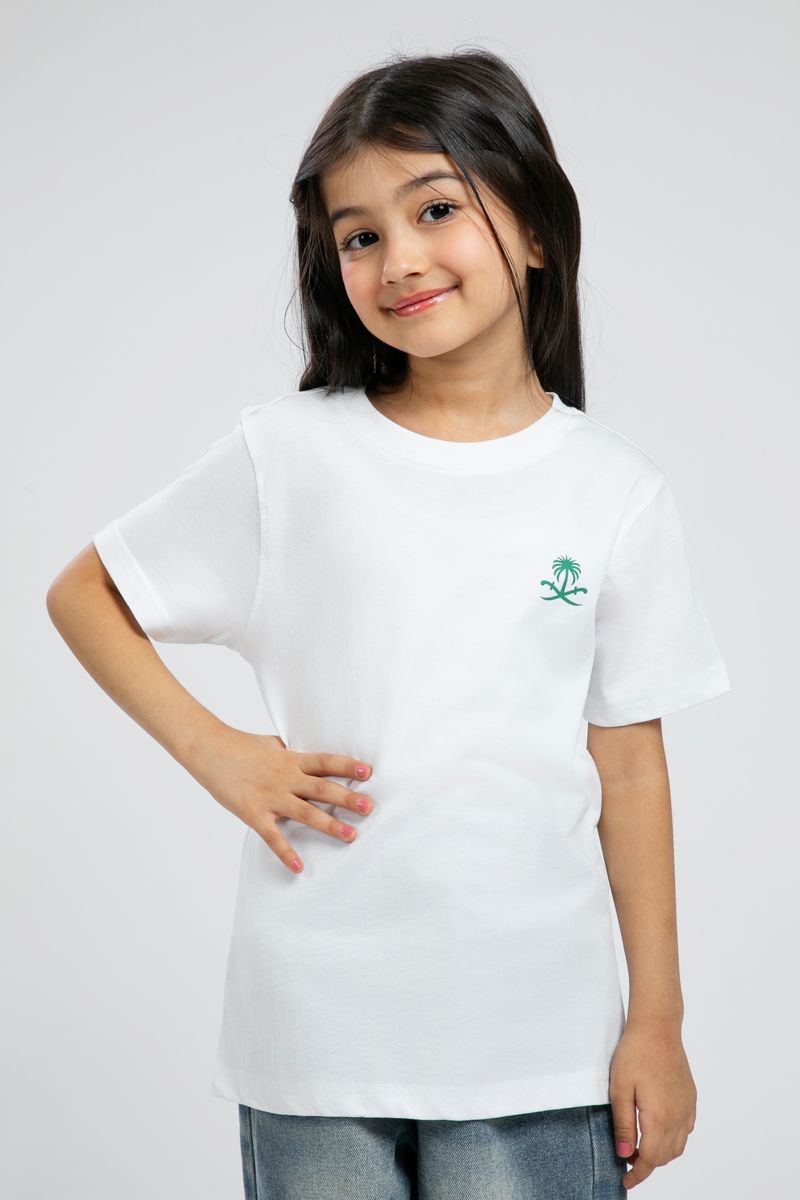 Unisex T shirt for kids featuring a minimal chest print with palm and crossed swords graphic Symbolizing heritage and pride this short sleeve tee offers a comfortable fit and simple everyday style