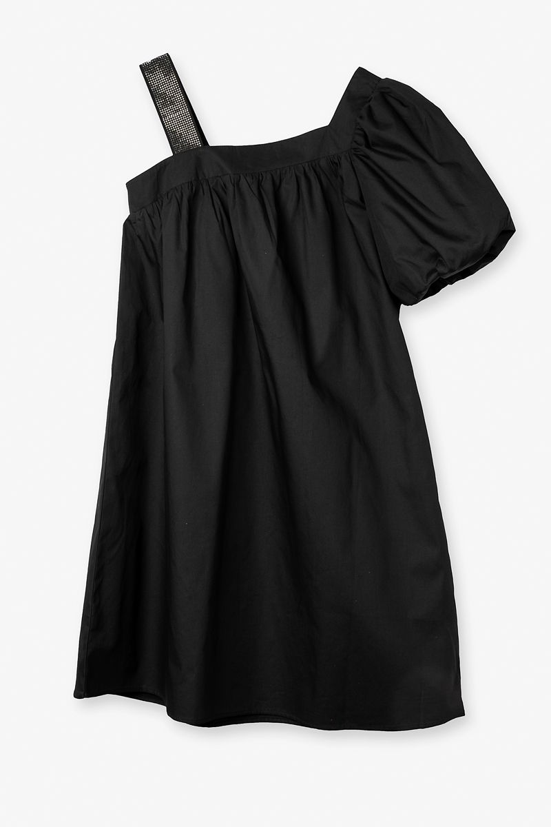 solid mono colored pattern decorated with a rhinestones pattern on shoulder strap and flower shape ornament on the front side