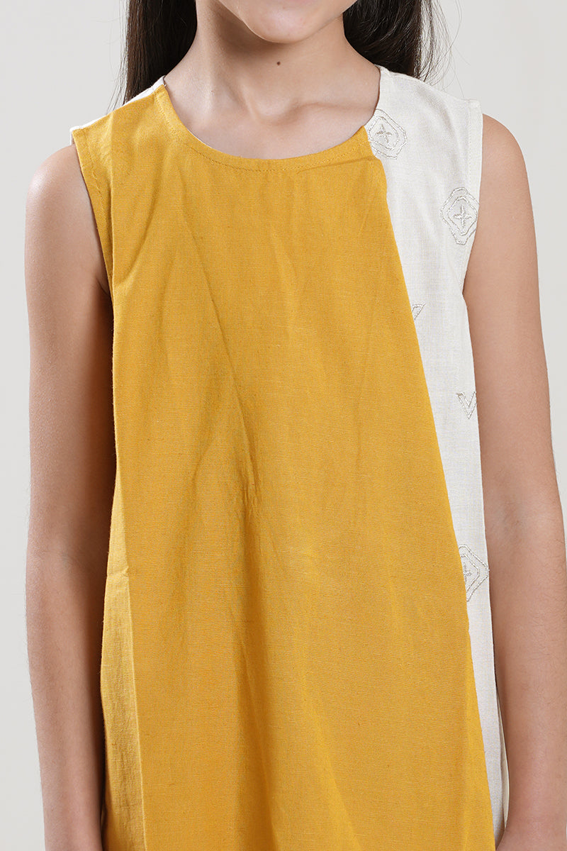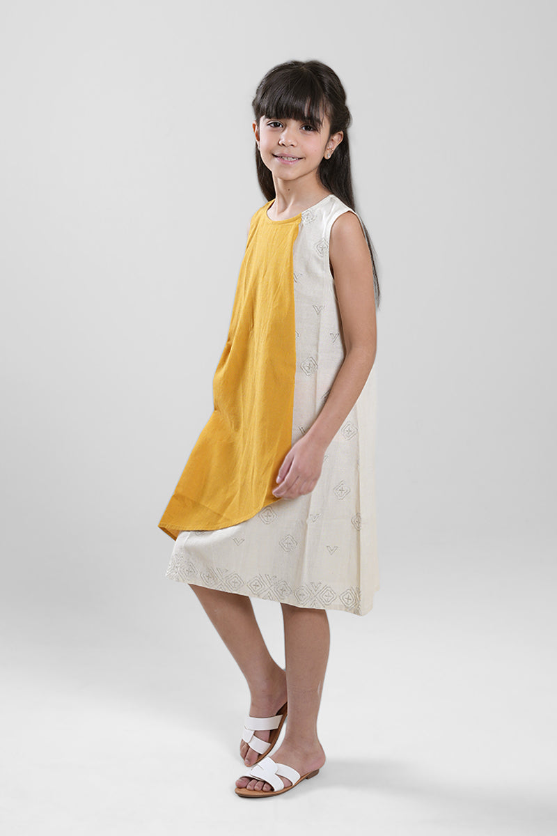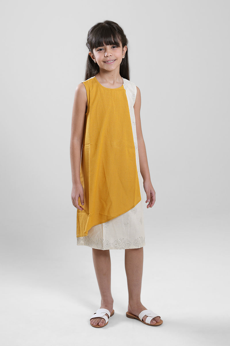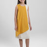 Midi-length dress with an asymmetric layered design. Features a sleeveless cut, soft contrast panels, and a relaxed straight fit that offers comfort and a clean, modern look for everyday wear.