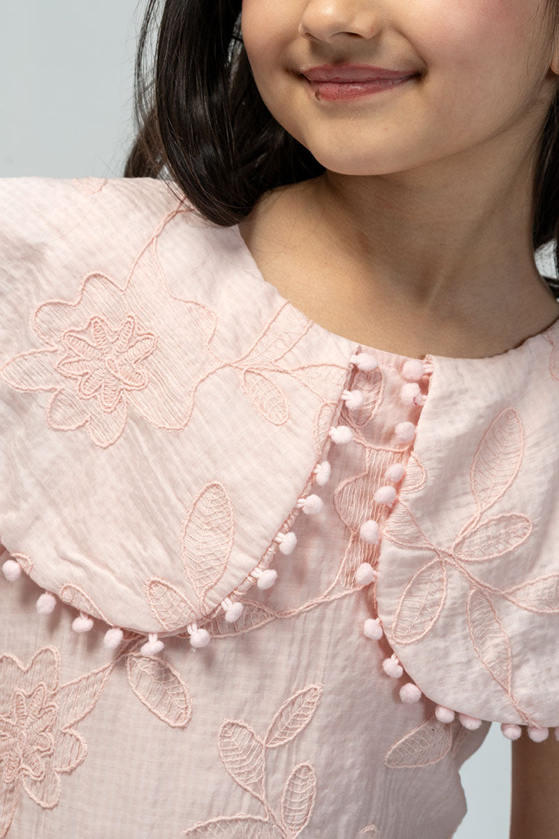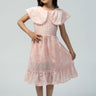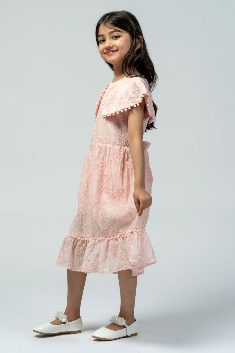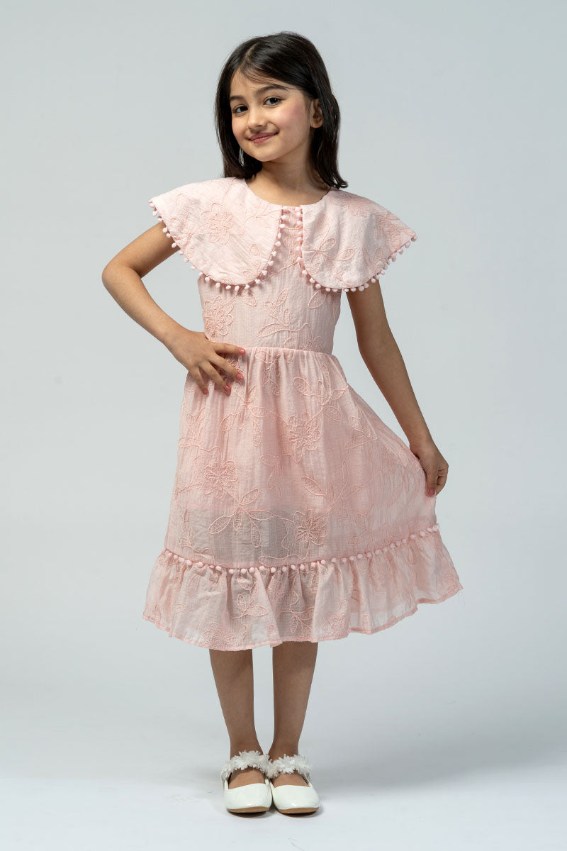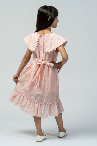 A soft embroidered dress featuring a wide cape-style collar with delicate trim, a gathered waist, and a tie-back bow. Finished with a subtle ruffled hem for a light, graceful look.