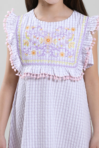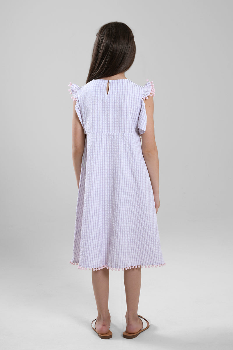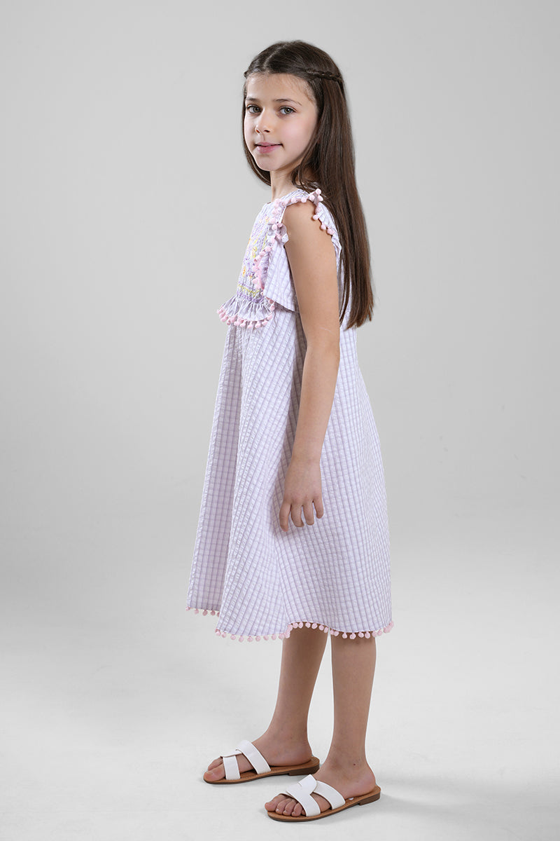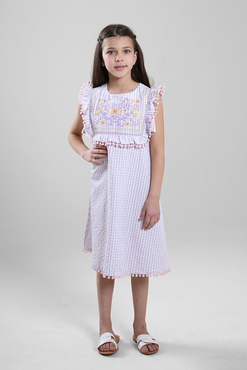 A charming midi dress designed for everyday comfort and effortless style. Features delicate embroidery on the front, soft ruffle sleeves with pom-pom trim, and a relaxed silhouette for easy movement. Finished with a back button detail, making it suitable for casual outings and special daytime occasions.